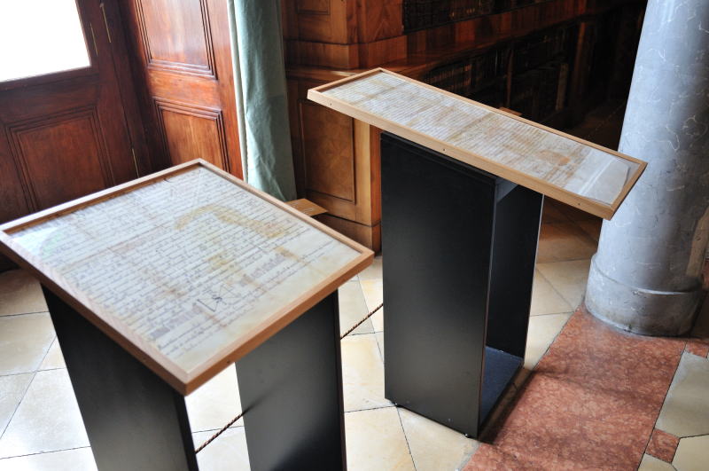 向かって左は、1002年に国王イシュトヴァーンがパンノンハルマ修道院を初めてキリスト教の修道院として活動を認めたときの修道院設立に関する古文書 (許可書)で、修道院に与えられた特権などが書かれている。 右は1055年にティファニの修道院 [Tihanyi apátság] の設立に関し、国王イシュトヴァーンが与えた許可書で、内容はパンノンハルマ修道院とさほど変わらないが、使われているラテン語の中に58個のハンガリー語が認められている。 それ以前は共通語としてラテン語が使用されていたため古文書にはハンガリー語は残されておらず、ハンガリー語が記された古文書として最古のものになっている。 (展示物はコヒ゜ー) |