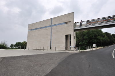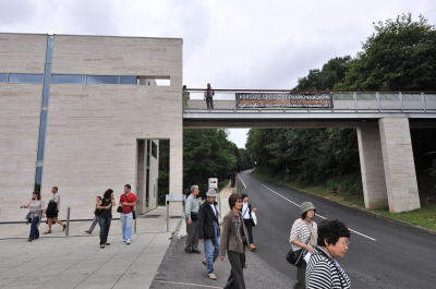 | パンノンハルマ修道院の駐車場 (10:34)「南方向」MAP 左の矩形の建物がチケット売り場で、その3階から右に延びる歩道がパンノンハルマ修道院へのツアーコース。 |