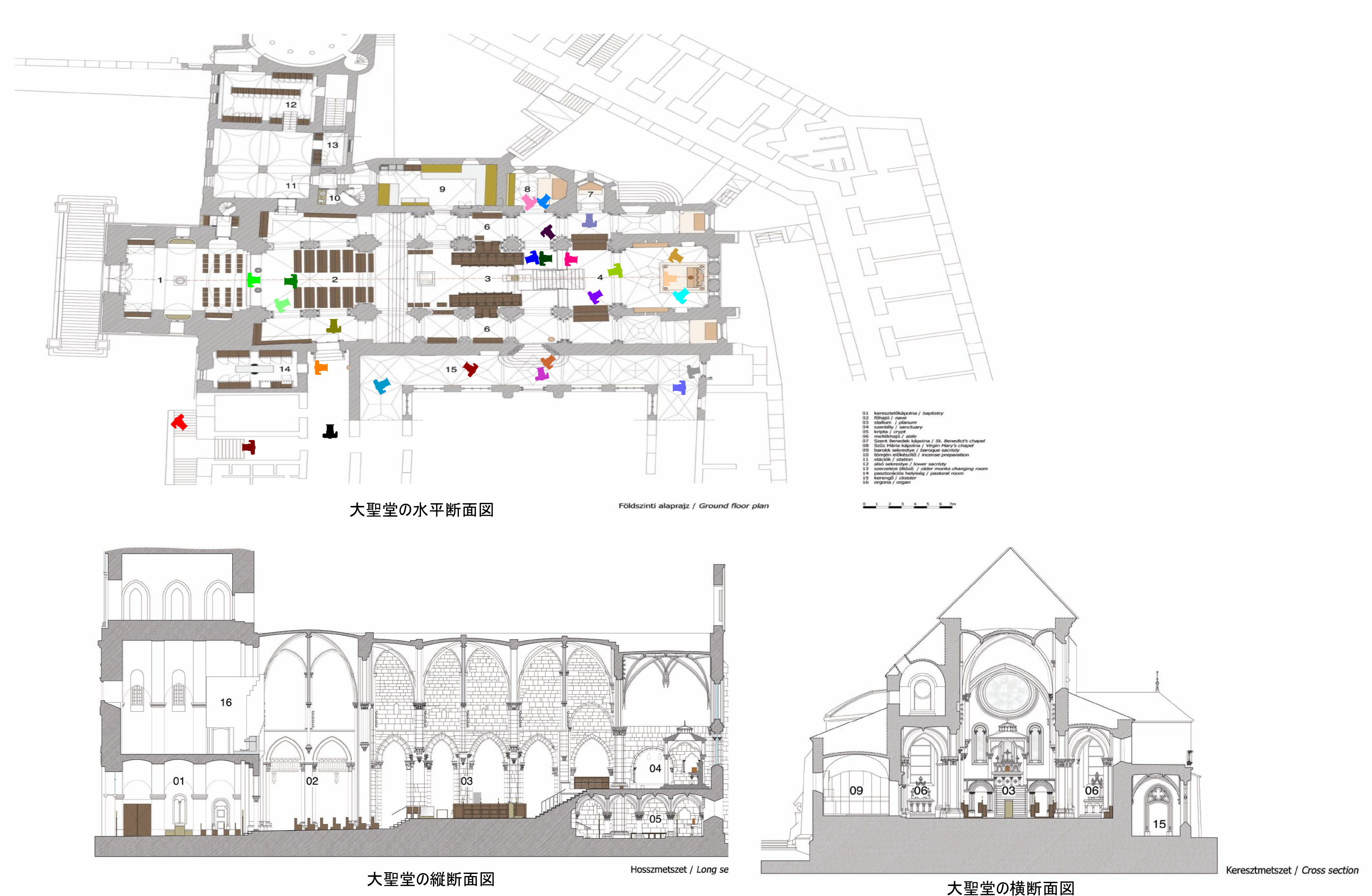 9. barokk sekrestye / baroque sacristy (バロック聖具室) 10. tömjén előkészítő / incense preparation (お香の準備室) 11. stációk / station (十字架の道行き) 12.alsó sekrestye / lower sacristy (下の聖具室) 13.szerzetesi öltözője / older monks changing room (修道院のロッカールーム) 14.pasztorációs helyiség / pastoral room (司牧の部屋) 15.kerengö / cloister (回廊) 16.orgona / organ (オルガン) 「縦断面図に表示」 |