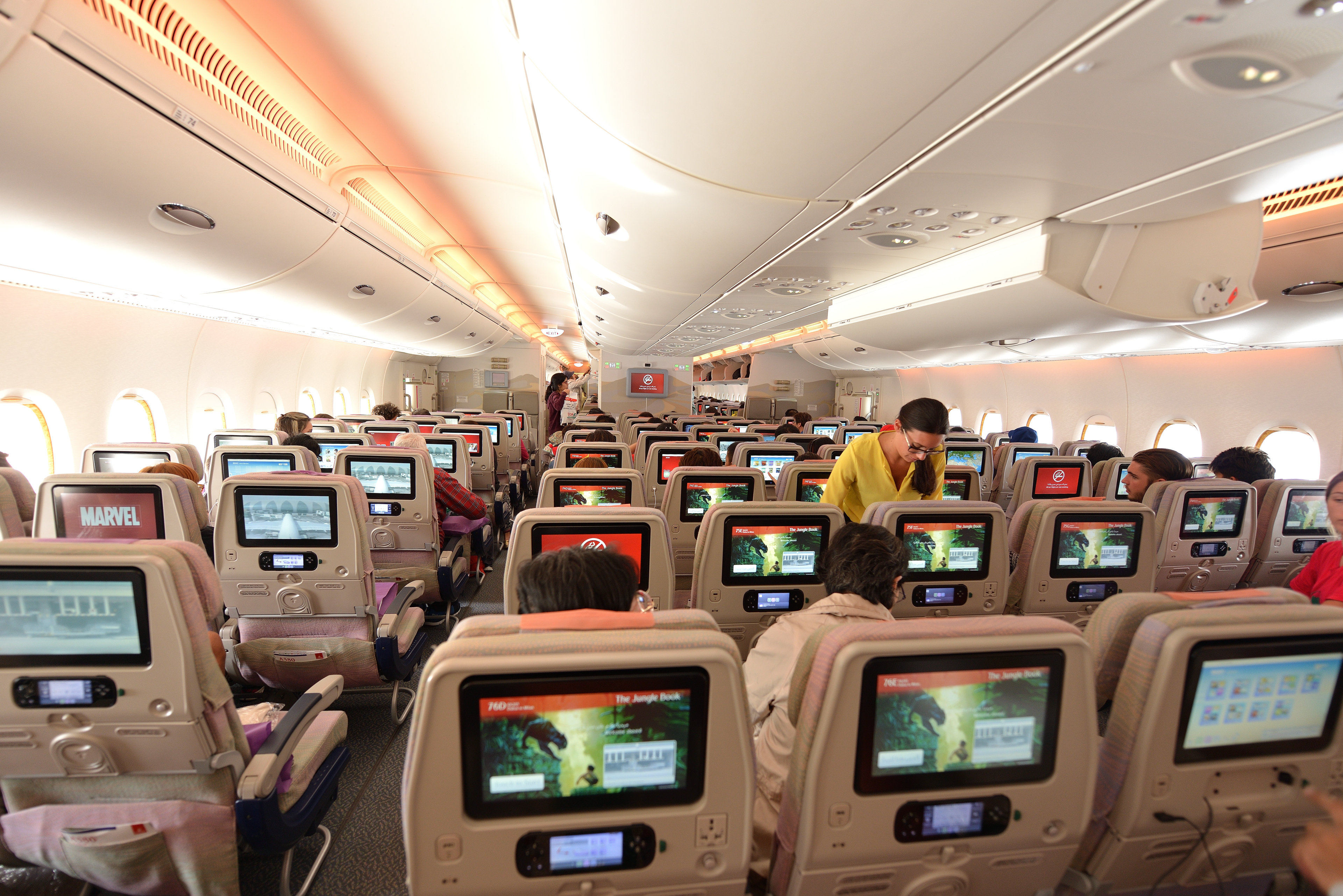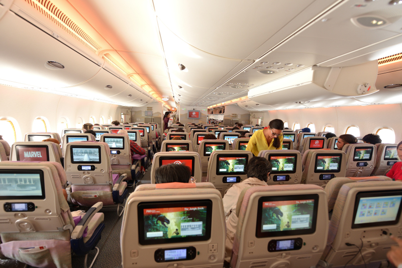 | ドバイ国際空港 [Dubai International Airport] (9:31) 離陸前のAIRBUS [A380-800] の機内 (エコノミー) 「南南西」MAP Lay.A |