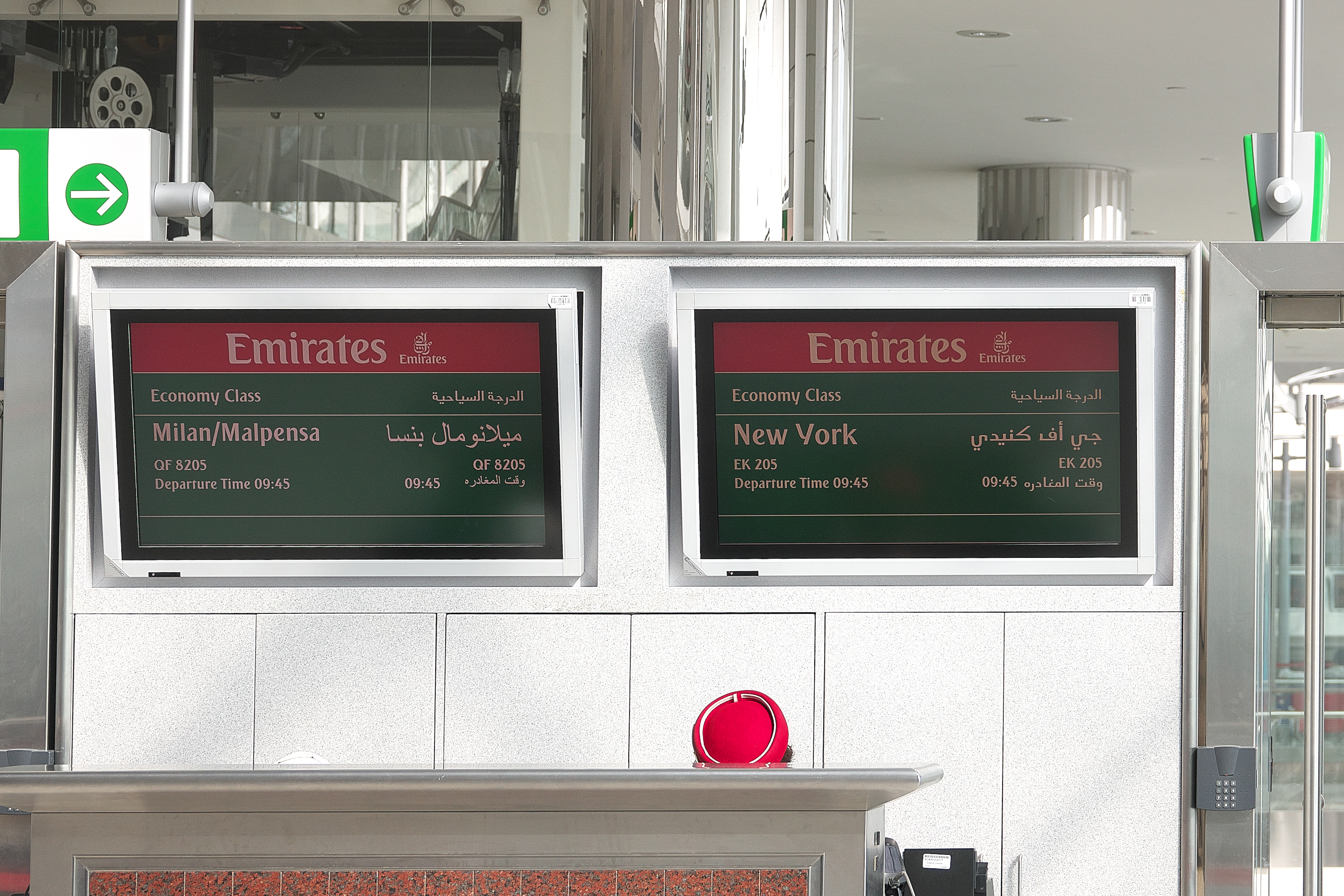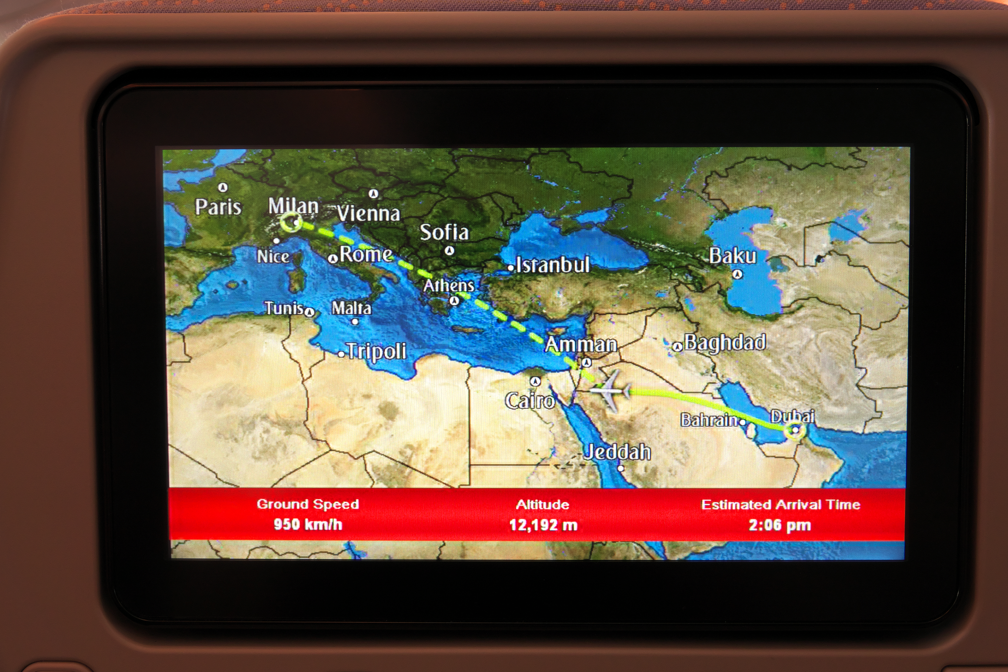 ドバイ着 (04:50) = [乗り継ぎ] = ドバイ発 (09:45 EK-205便) ~ ミラノ着 (14:20)