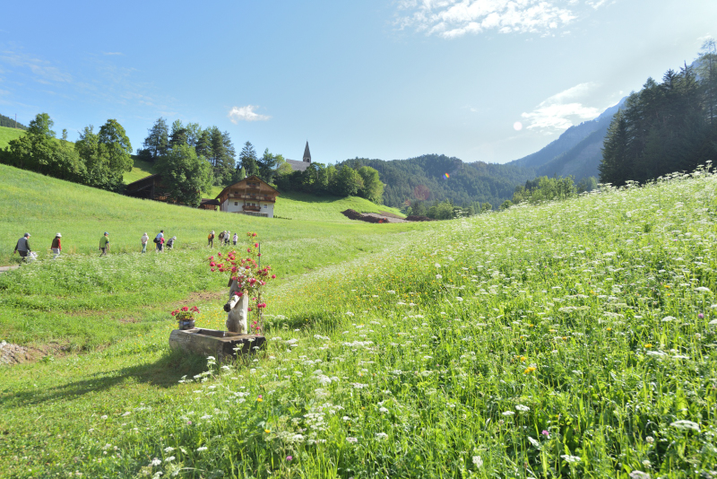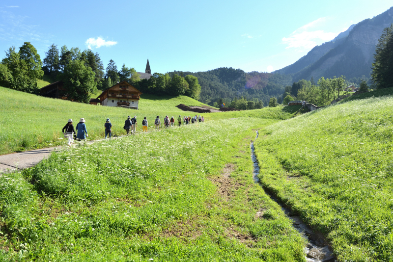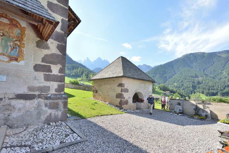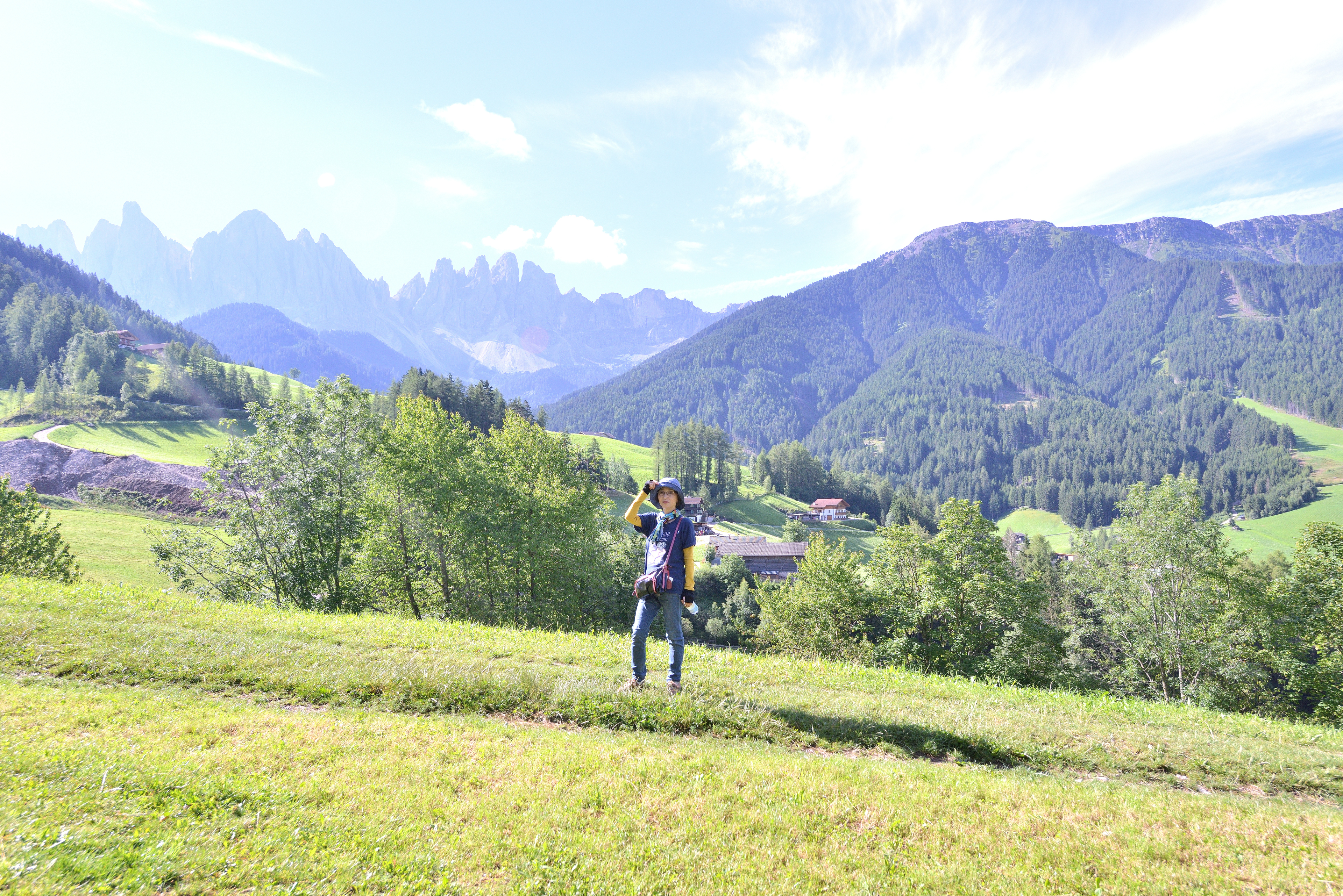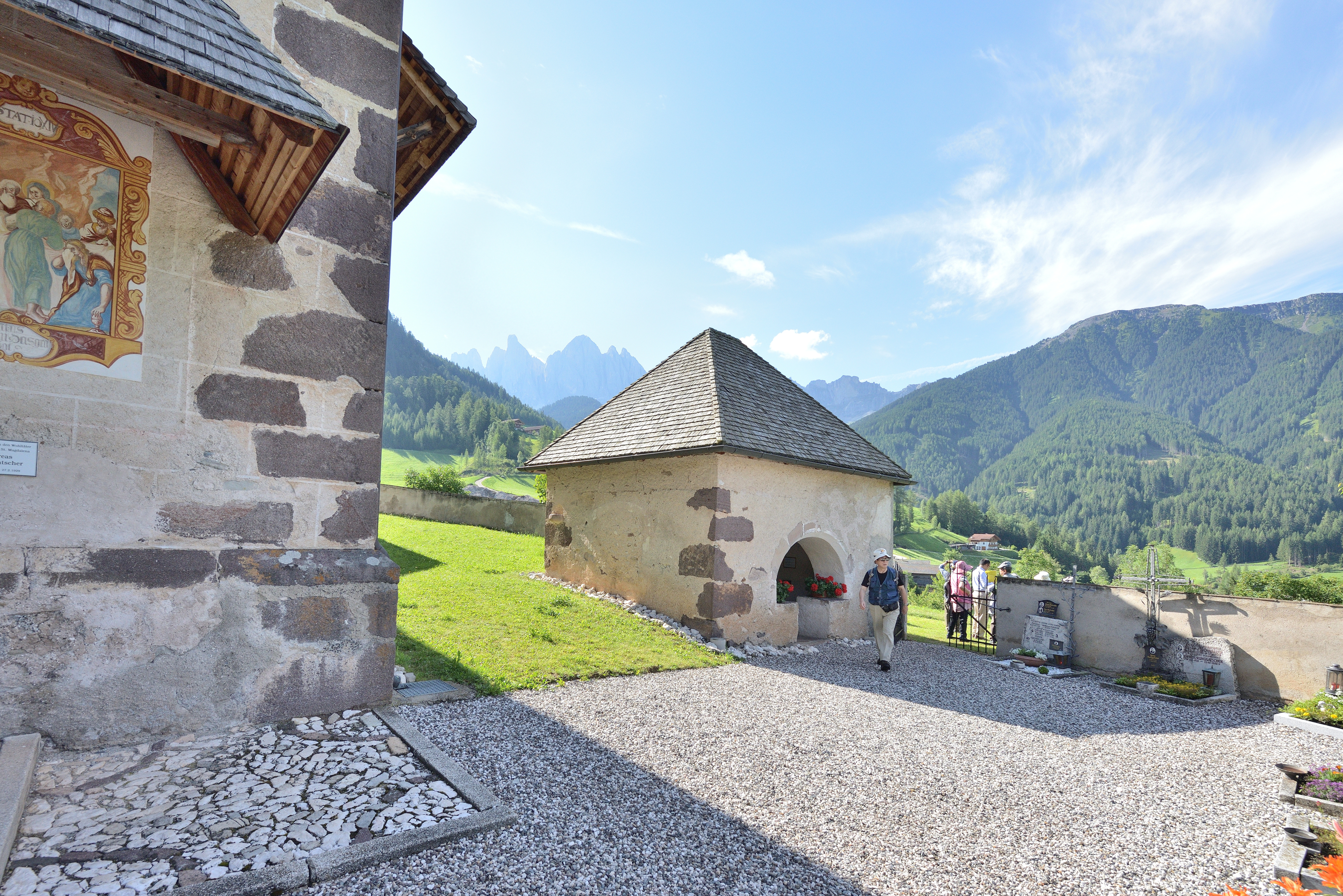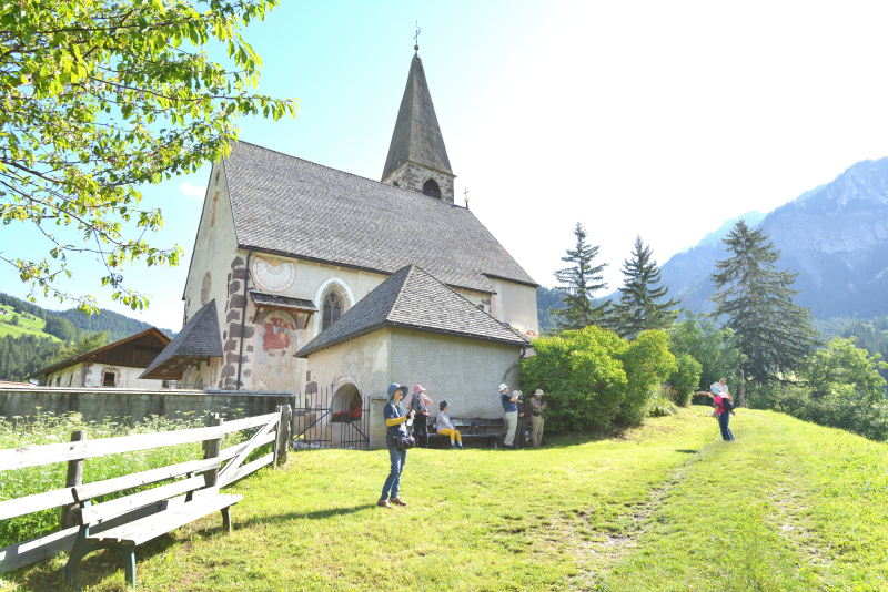 | 教会脇の草原にて (9:29) 後方に聳える山は、ガイスラー山 [ Geisler] (標高 3,025 メートル) 。 「南南東」MAP Lay.A |