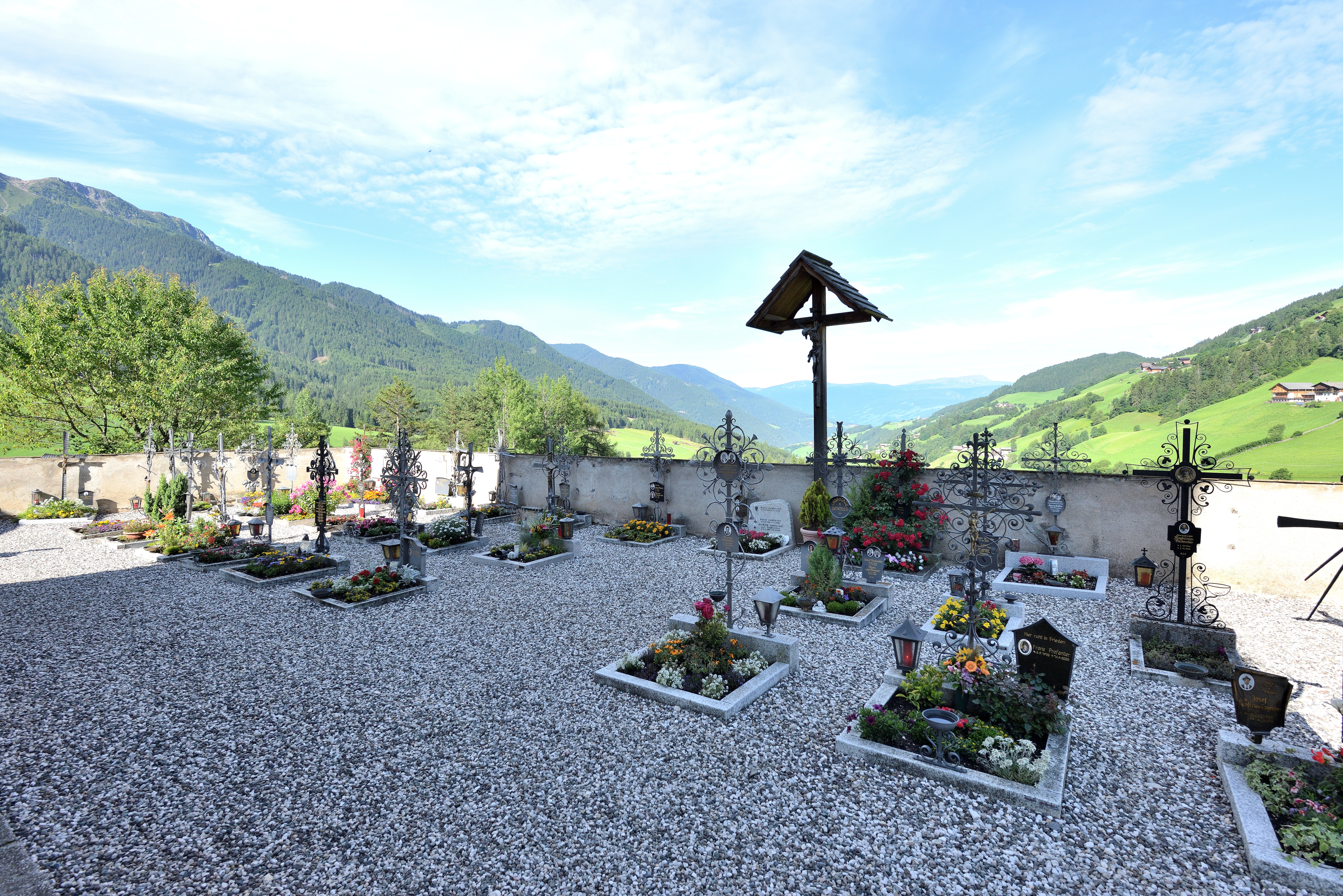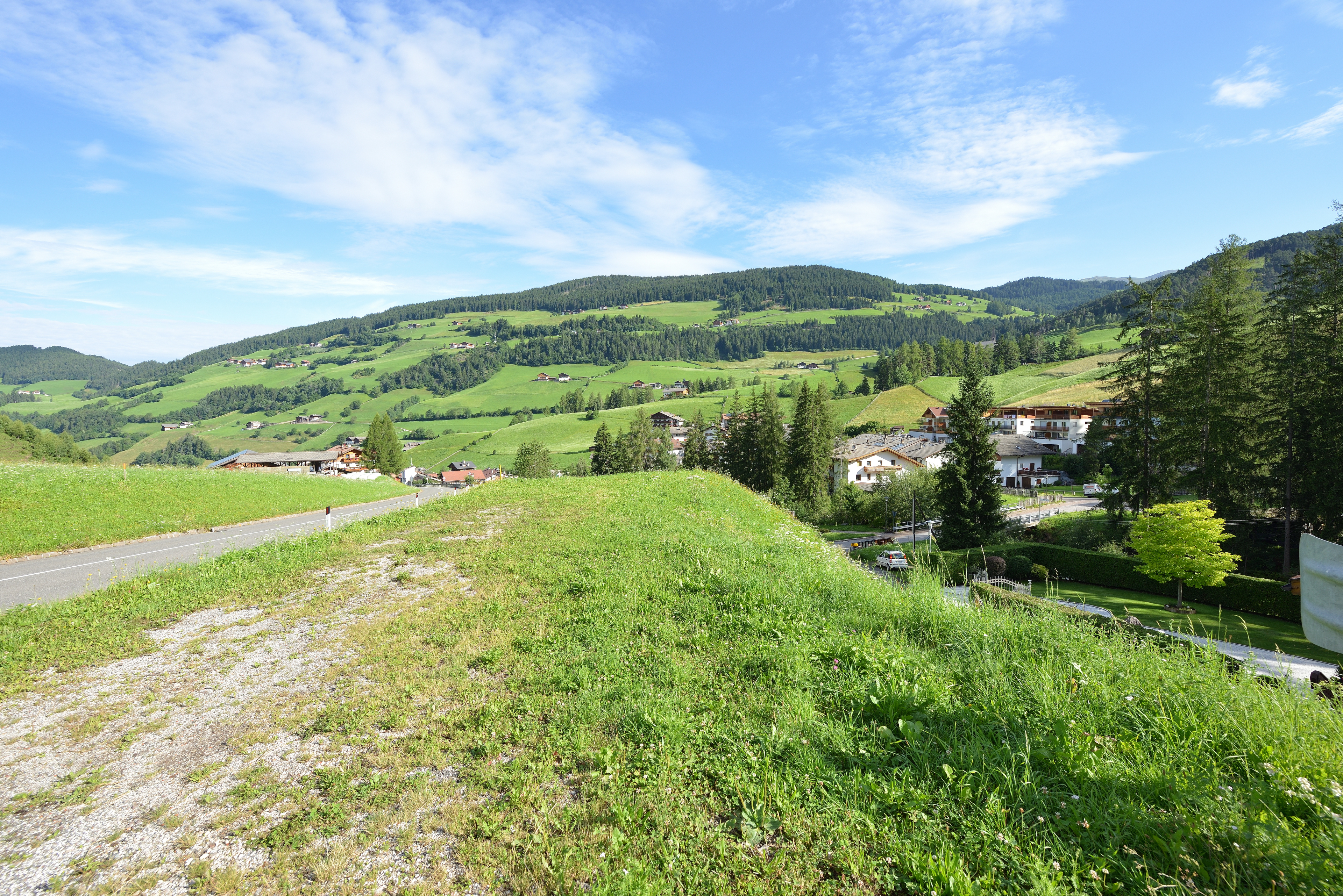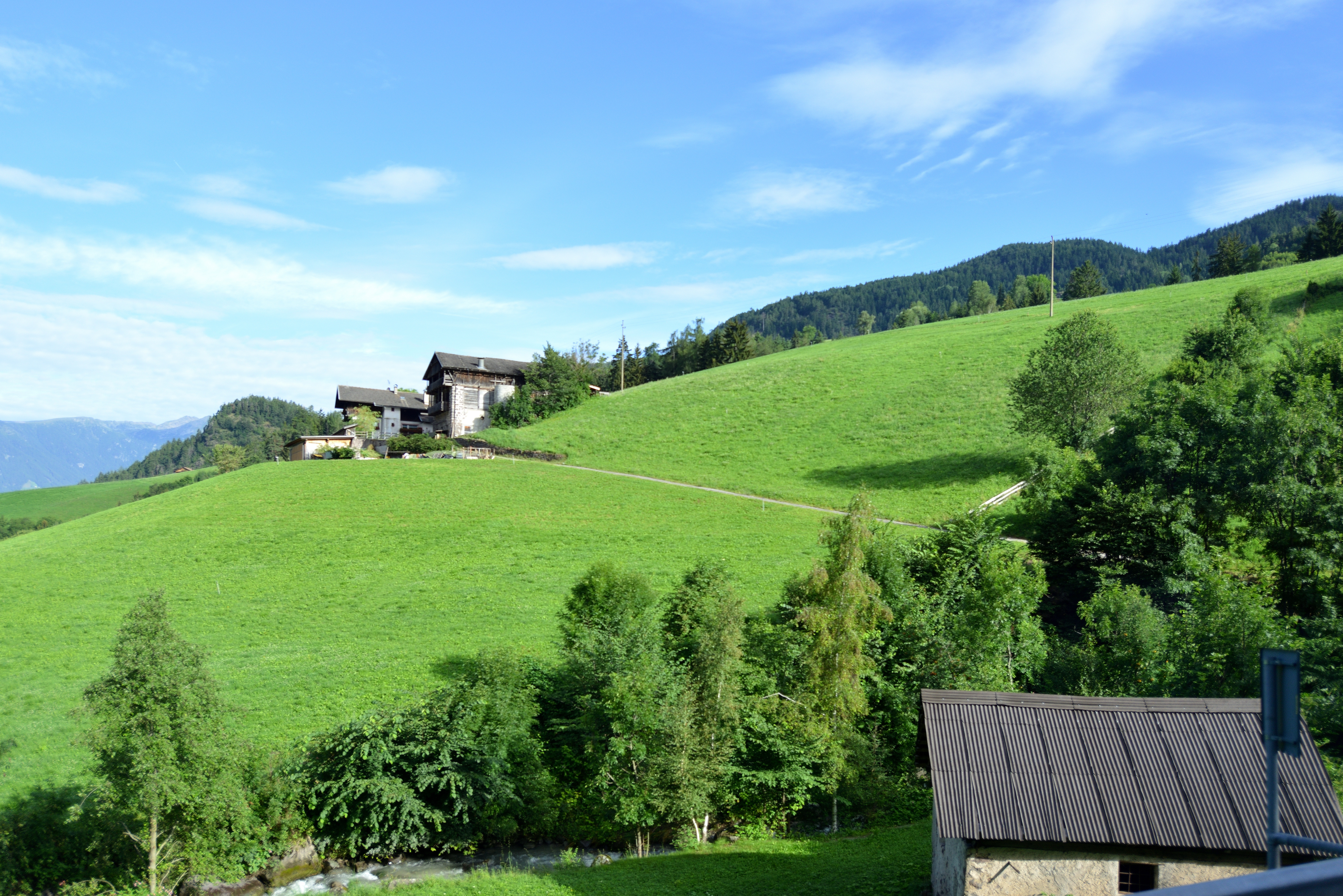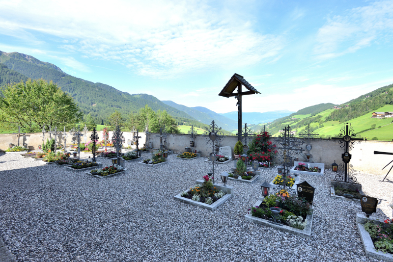 | 教会脇の草原にて (9:29) 後方に聳える山は、ガイスラー山 [ Geisler] (標高 3,025 メートル) 。 「南南東」MAP Lay.A |