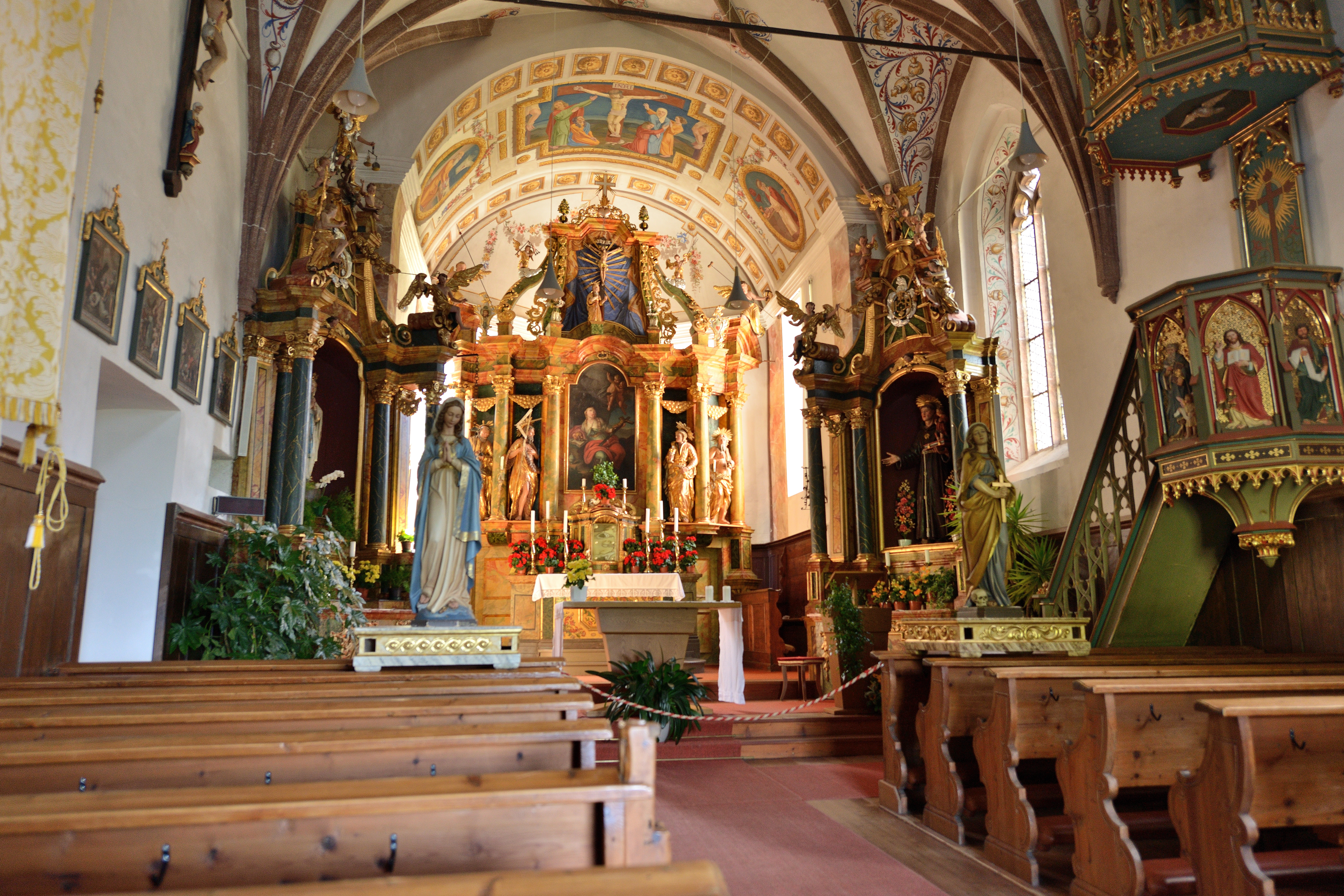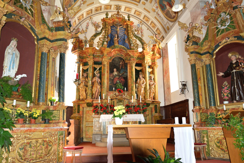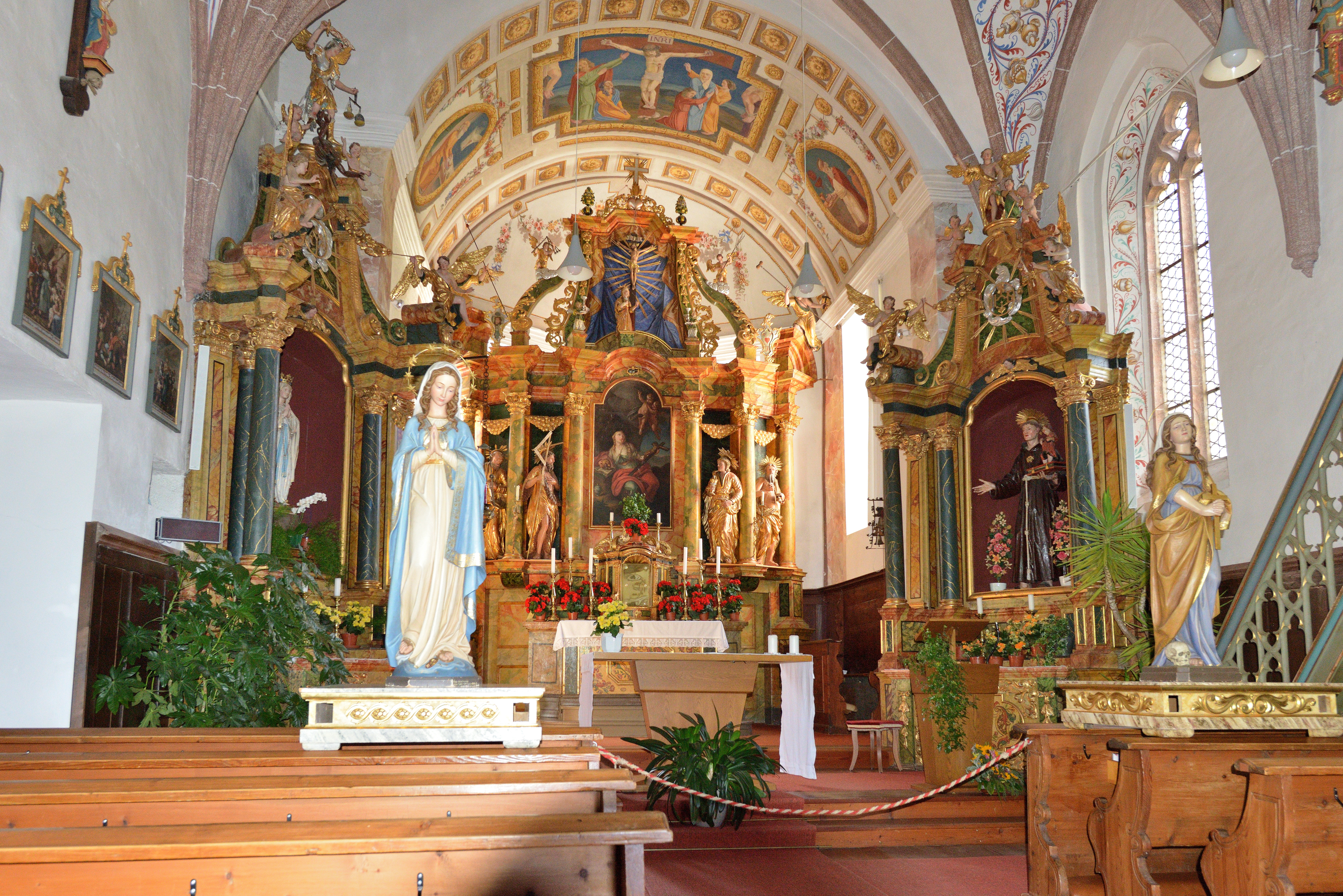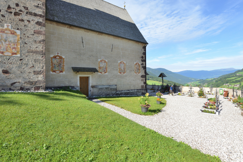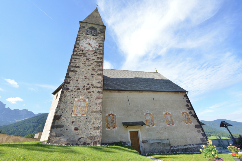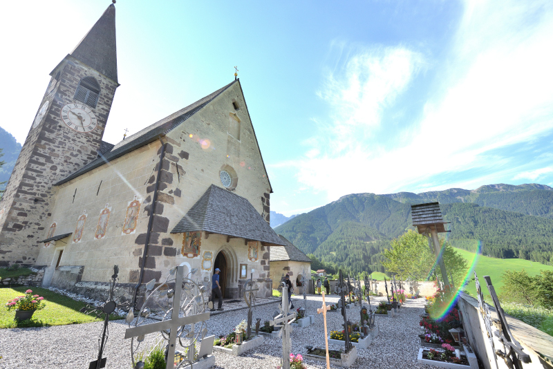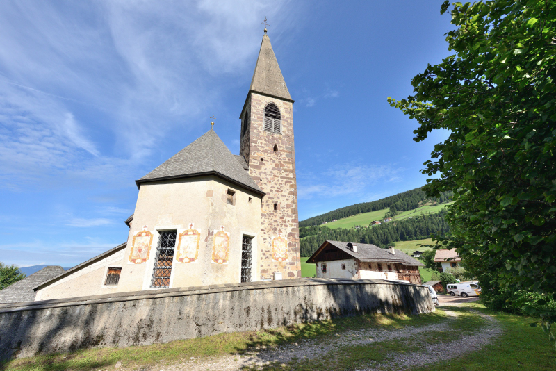 | サンタ・マッダレーナ 教会 [Chiesa di Santa Maddalena] (9:24) 注目に値するのは、1928 年にラディンの芸術家ヨハン M. ペスコラー [Johann M. Peskoller] によって描かれた聖歌隊のヴォールト [vault] (アーチ構造の曲面天井) の絵。 「東」MAP Lay.A |