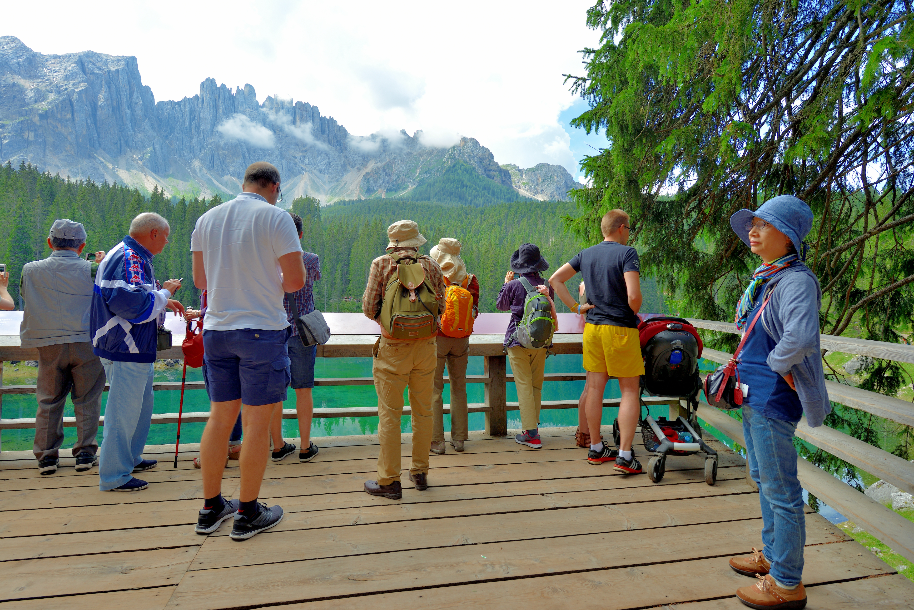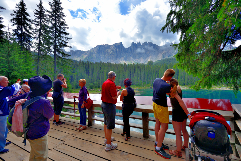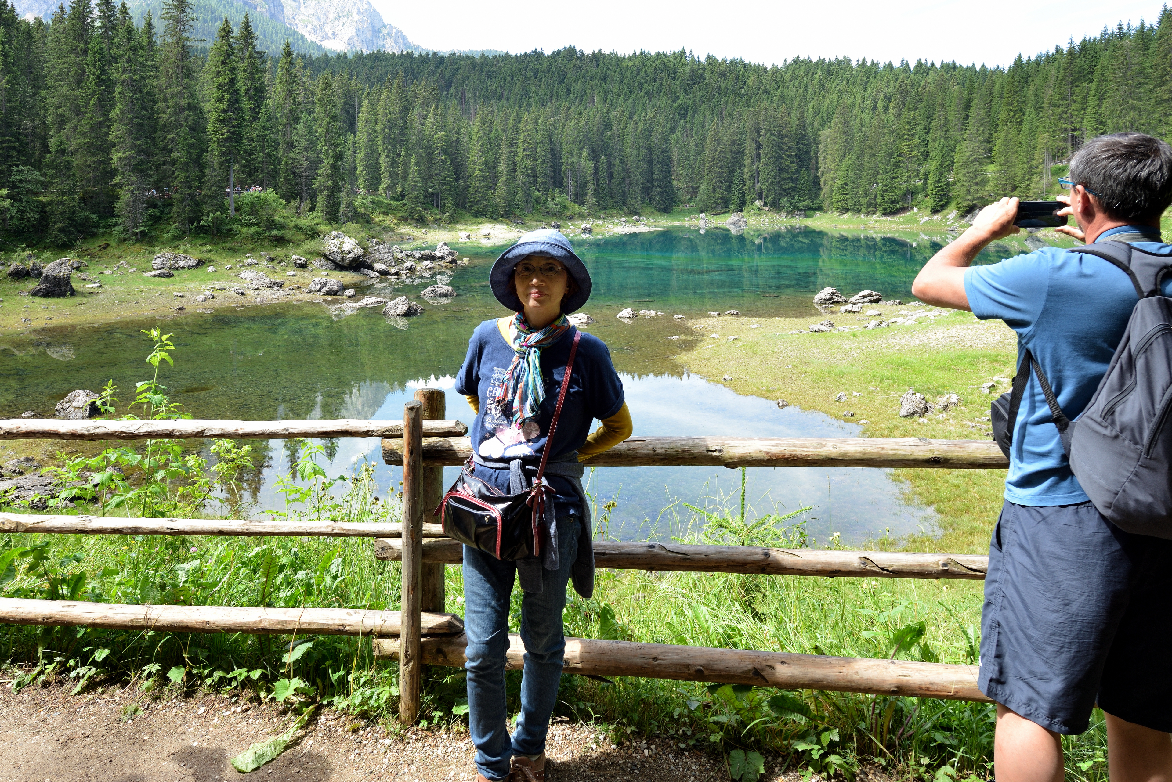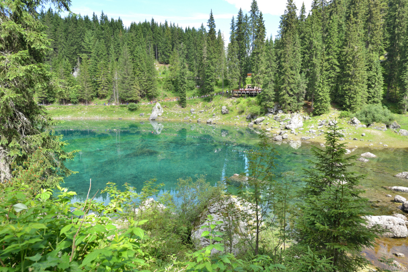 | カレッツァ湖 [Lago di Carezza] (11:29) 湖を展望できるデッキにて。 カレッツァ湖は標高1,534 メートルにある小さな高山湖で、鬱蒼としたモミの森に囲まれている。 この湖はその色で知られており、このためラディン語では「レク・デ・エルゴバンド」(または「アルコボアン」)、つまり「虹の湖」とも呼ばれている。 「南」MAP Lay.B |
