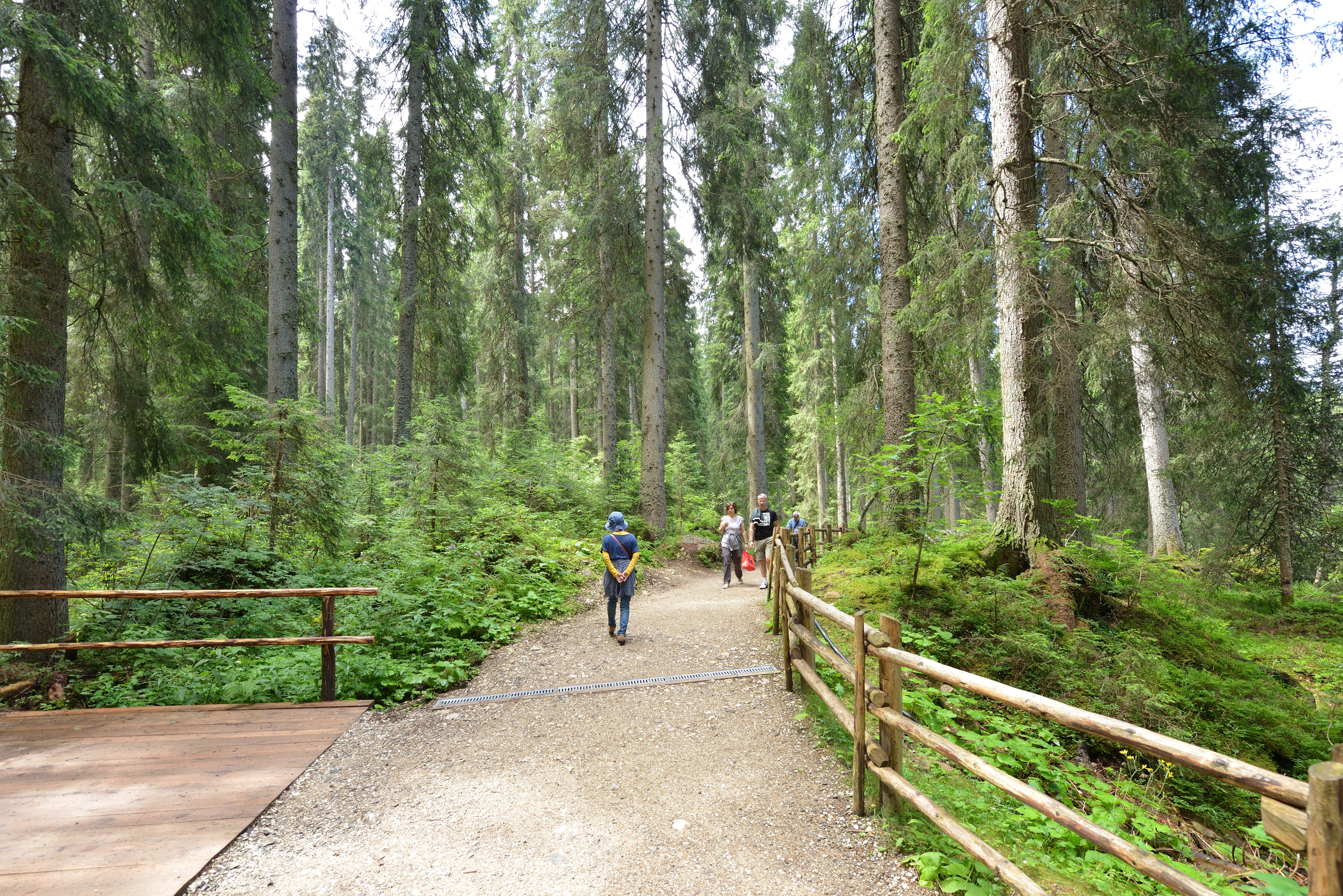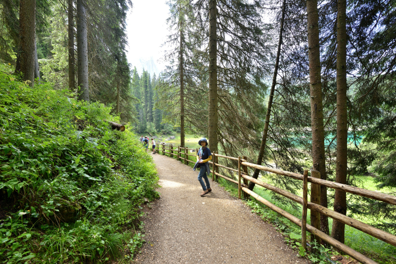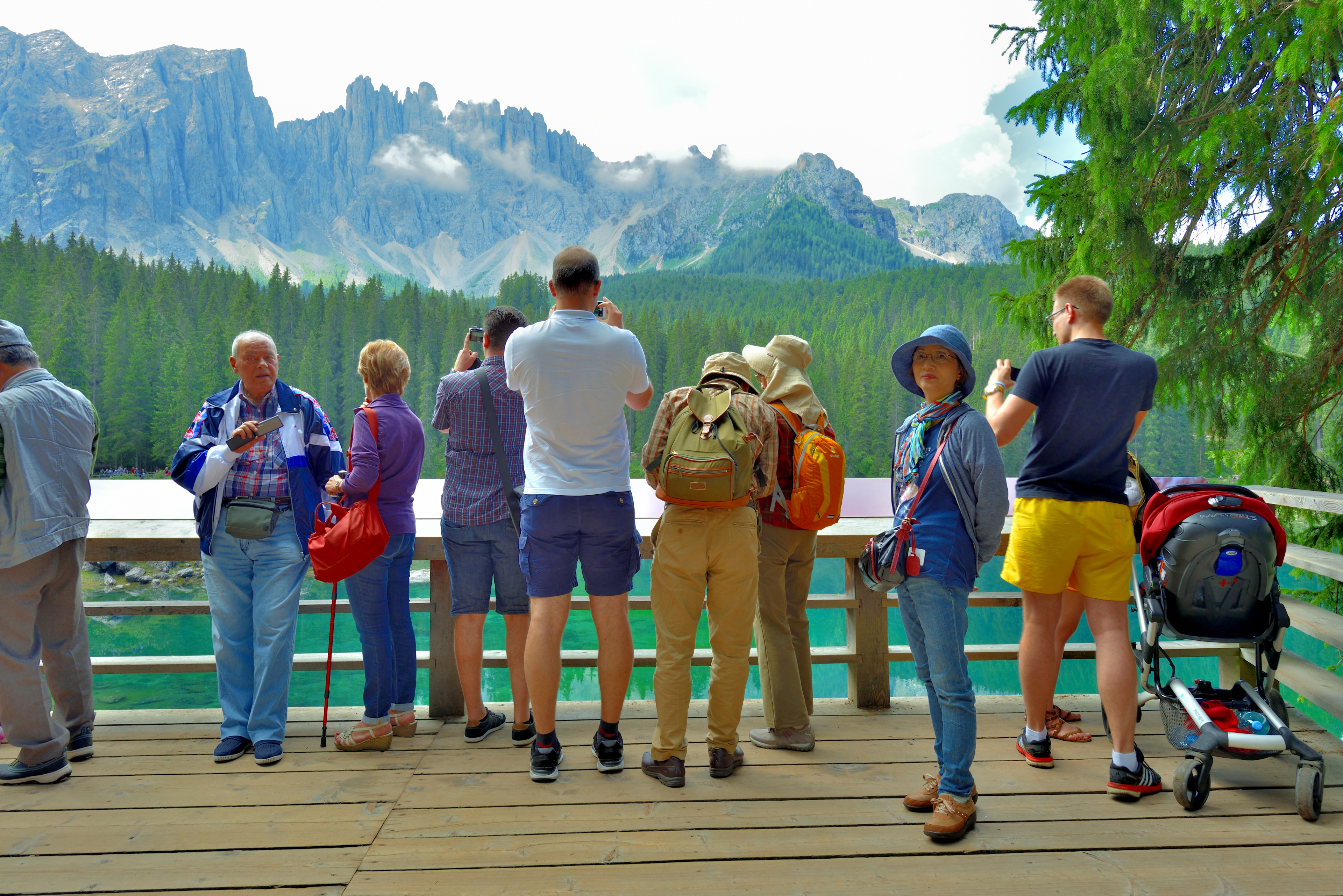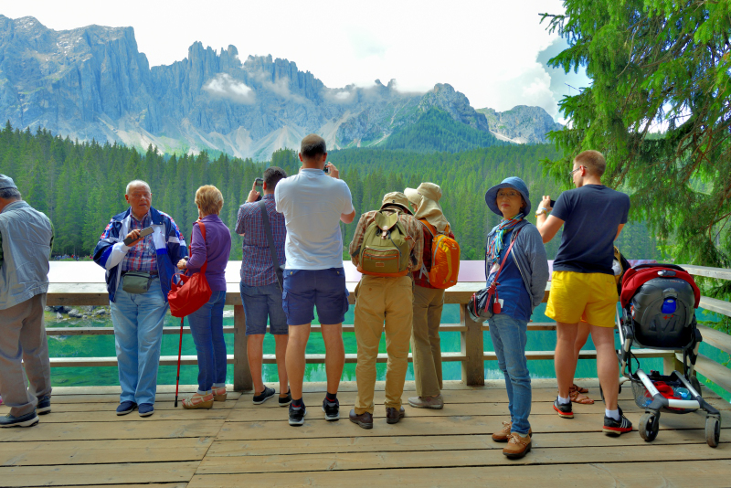 | カレッツァ湖 [Lago di Carezza] (11:29) 湖を展望できるデッキにて。 カレッツァ湖は標高1,534 メートルにある小さな高山湖で、鬱蒼としたモミの森に囲まれている。 この湖はその色で知られており、このためラディン語では「レク・デ・エルゴバンド」(または「アルコボアン」)、つまり「虹の湖」とも呼ばれている。 「南」MAP Lay.B |