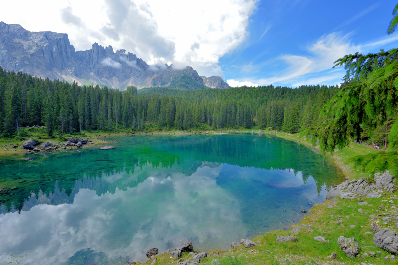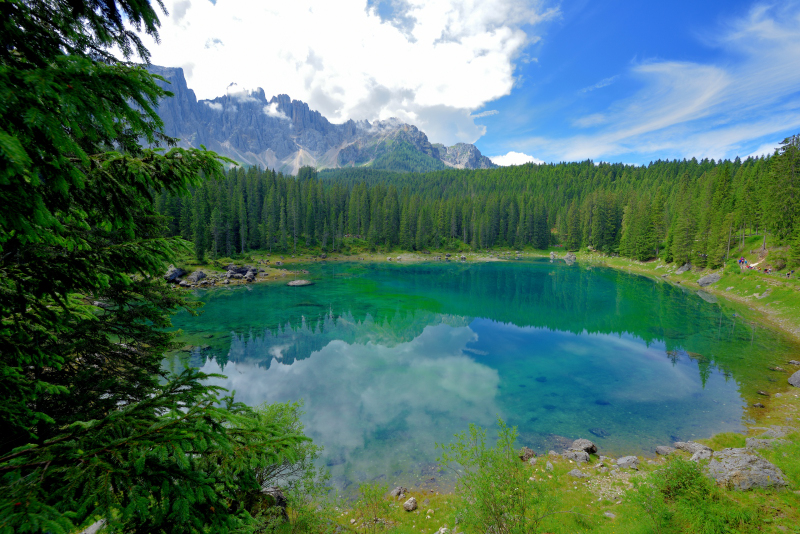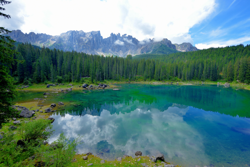 | カレッツァ湖 [Lago di Carezza] (12:03) 前方の岩山は、ラテマール山 [Latemar] (世界遺産) 。 「南」MAP Lay.B |