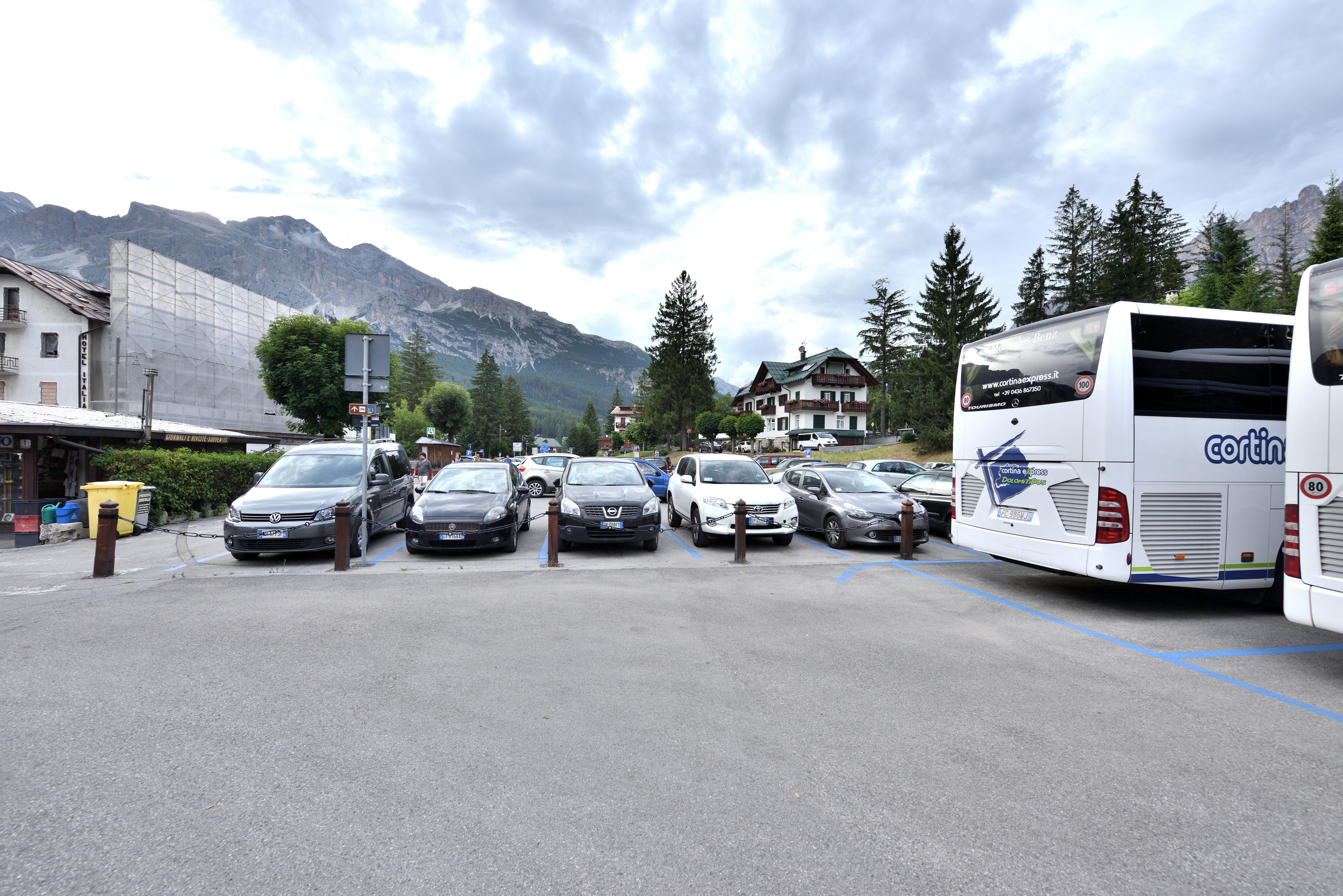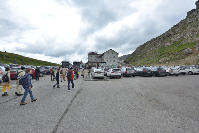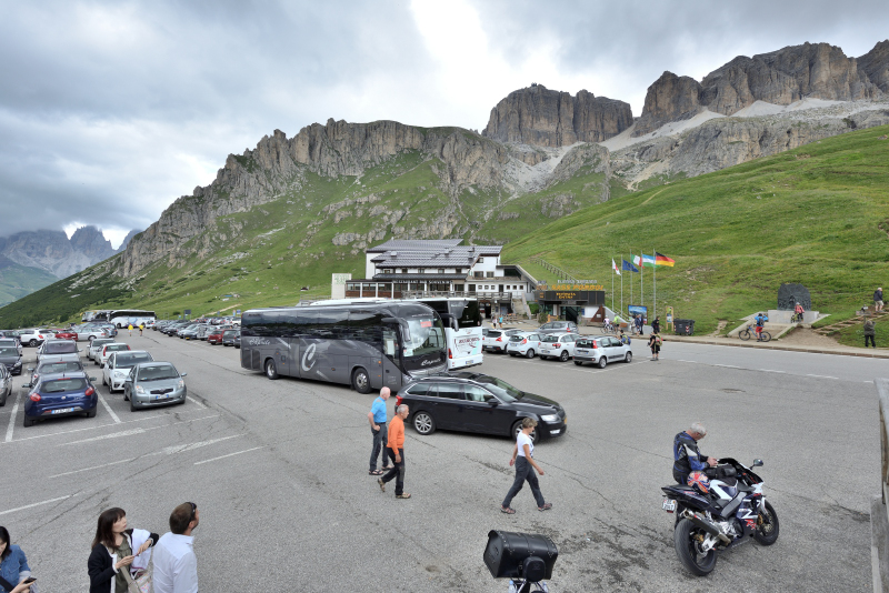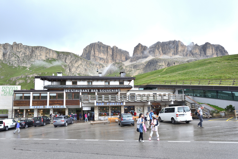 | サッソ・ポルドイ駐車場 [Parking Passo Pordoi] (13:29) 中央の建物に、サッソ・ポルドイへのロープウェイ駅がある。 「北北西」MAP Lay.C |