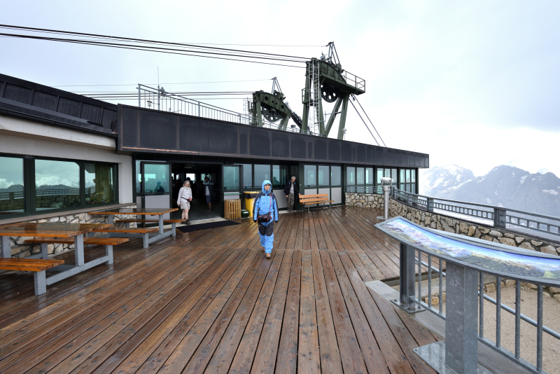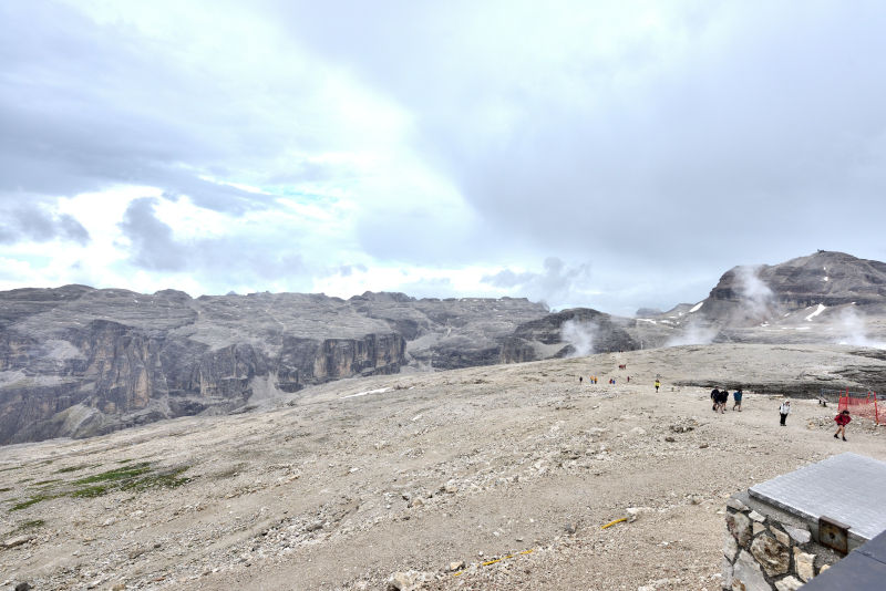 | Passo Pordoi ロープウェイ頂上駅構内 (15:17) 駅構内には、レストラン、お土産店など観光地でお馴染みの施設がある。 結局、悪天候のため駅構内から外に出ることはなかった。 天気が良ければ、このような景色を観ることが出来たのに残念。 「西北西」MAP Lay.C |