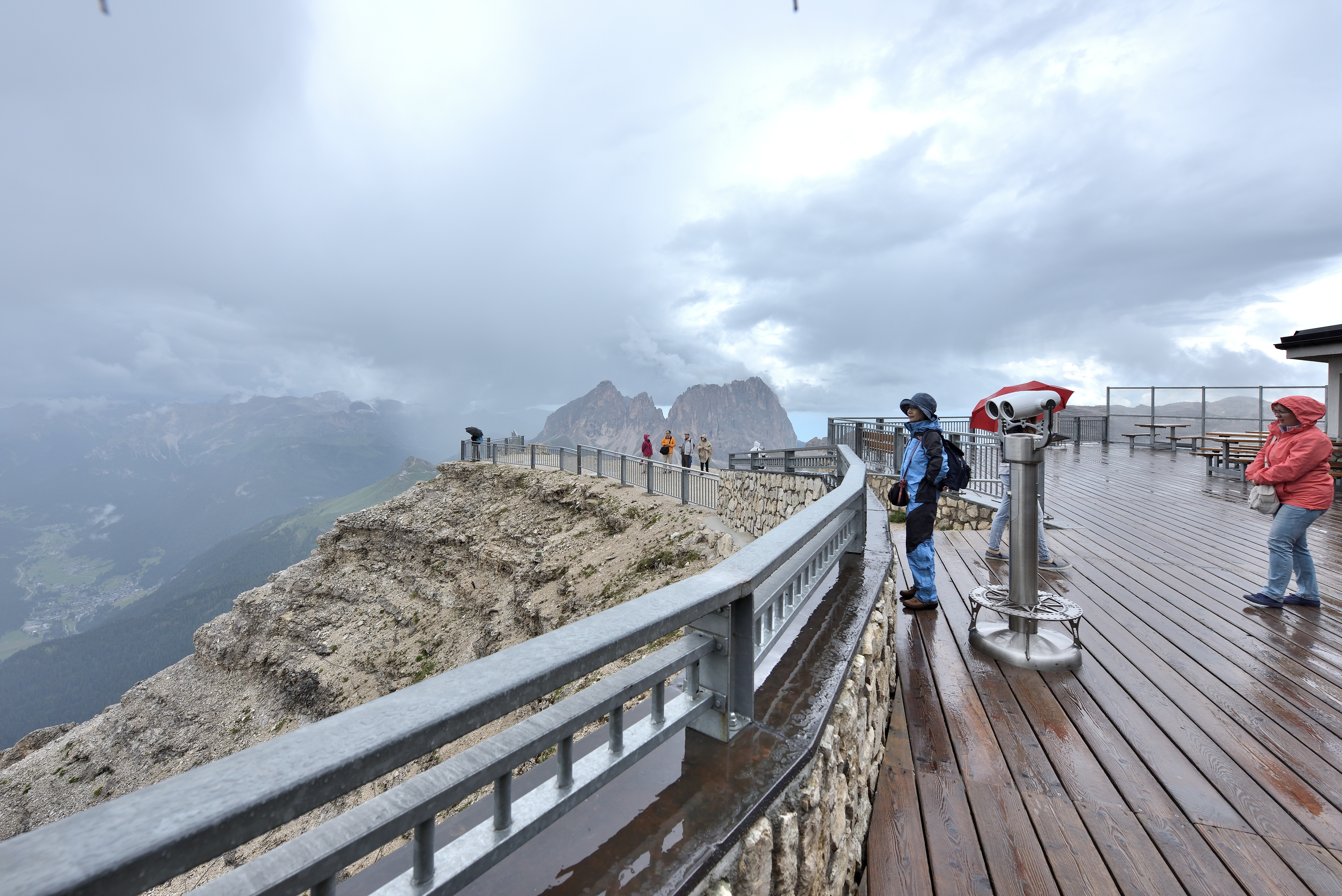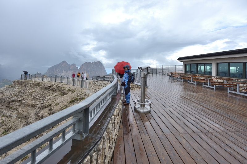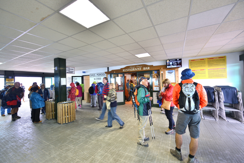 | Passo Pordoi ロープウェイ駅 (14:43) 1962 年にセッラ グループ *[Sella Group] のサッソ ポルドイ [Sass Pordoi] に建設されたロープウェイ。 高度700メートルを4分で登る。 残念ながら、悪天候のため絶景は望めない。 「北北西」MAP Lay.C * セッラ群は、イタリア北部のドロミテ山脈にある高原状の山塊です。セッラはマルモラーダの北、マルモラーダの東に位置する。 |