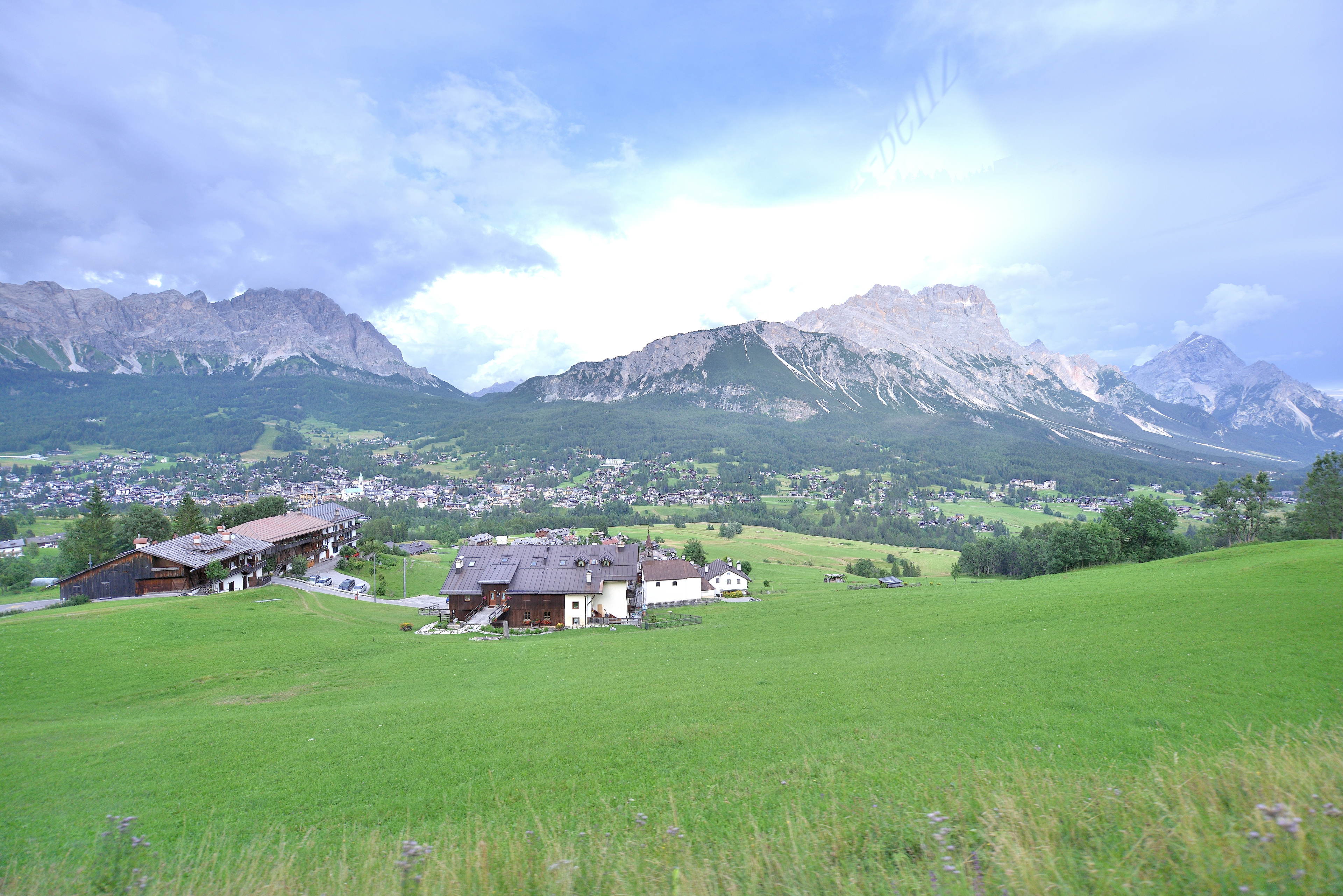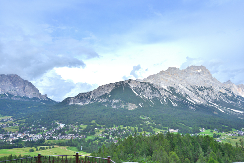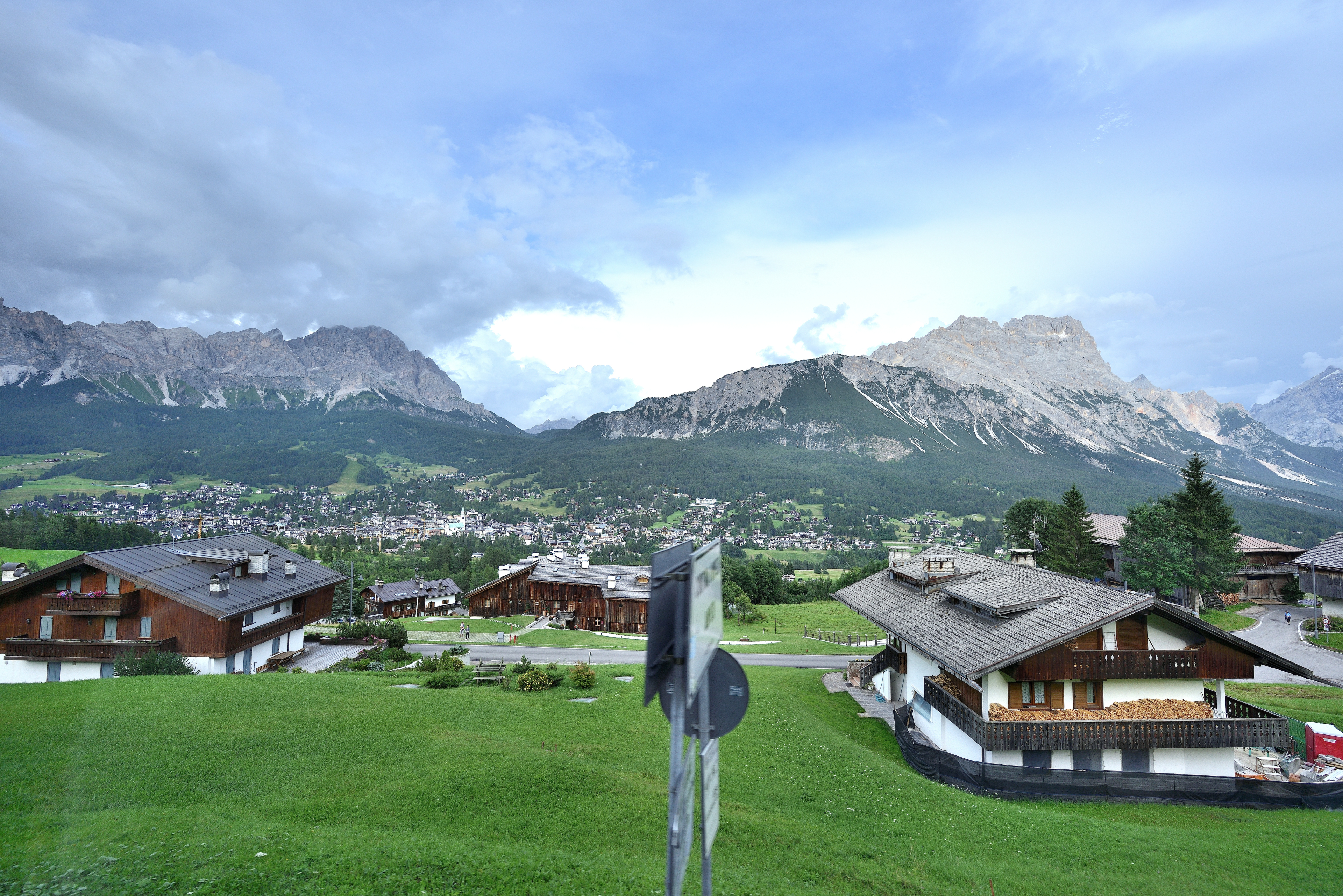 | コルティナ・ダンペッツォの中心街へ向かう途中の風景 (18:33) 中央に低く見えているピークは、モンテ・アンテラーオ [Monte Antelao] (3264m) 。 イタリア北東部のドロミテ東部で最も高い山であり、非常に目立つピークを持ち、それは「ドロミテの王」として知られている。 その左にある頂が右下がりに幾分平らになって、写真では1番高く見えている山は、プンタ ・ソラピス [Punta Sorapis] (標高は 3,205m) 。 「南東」MAP Lay.D |