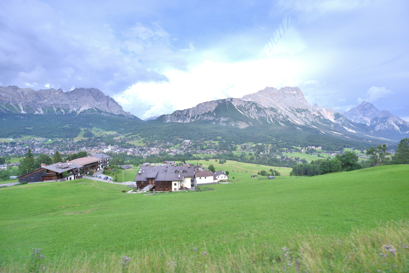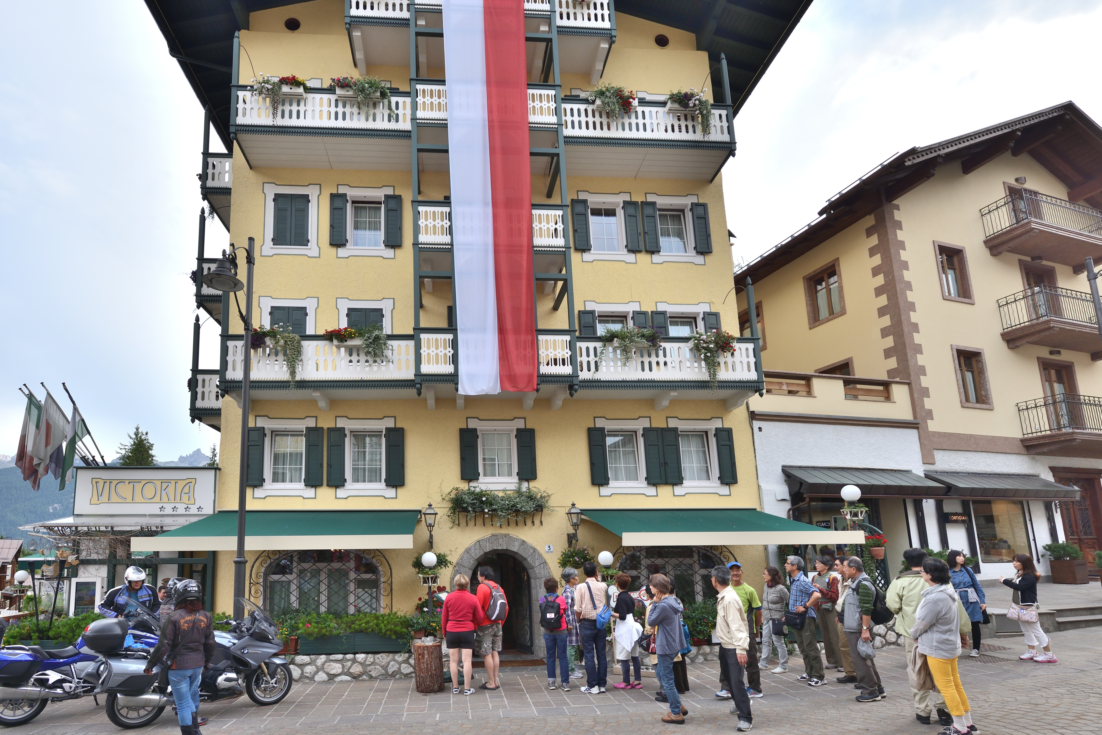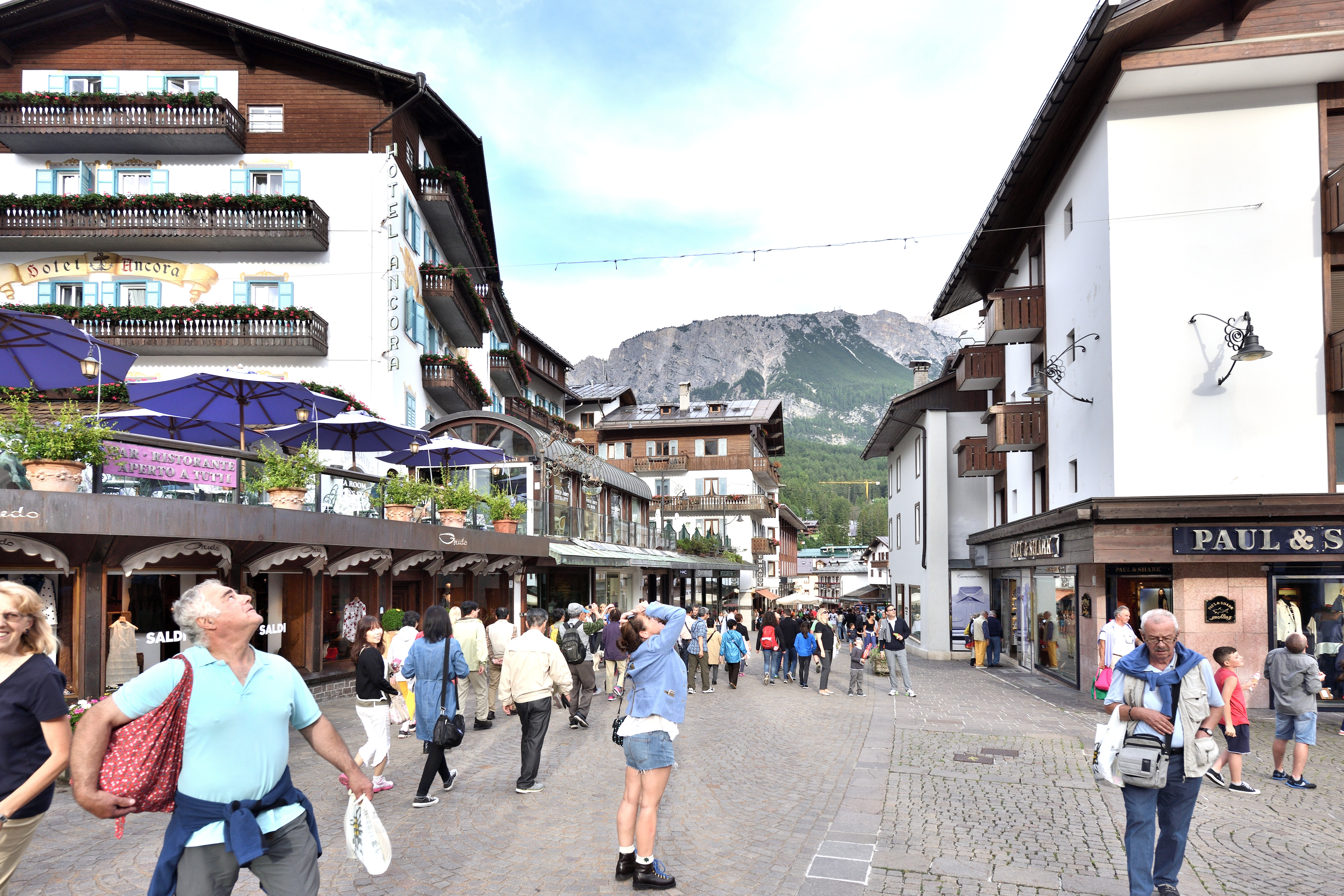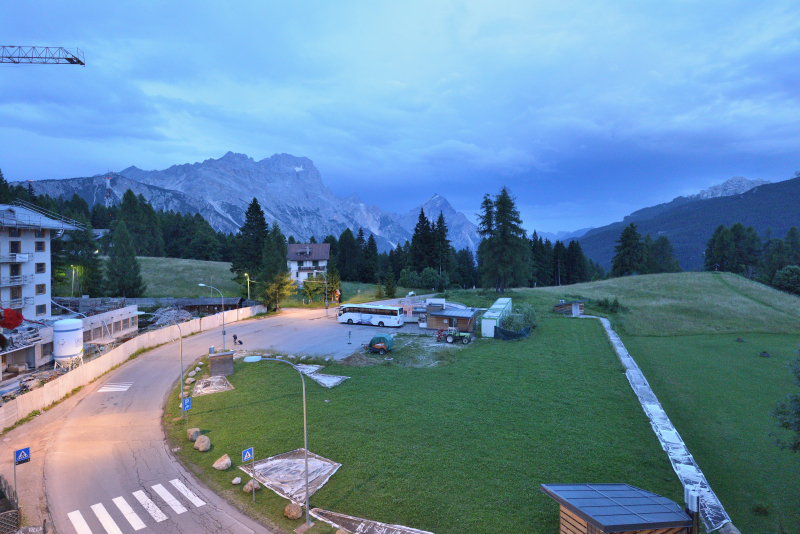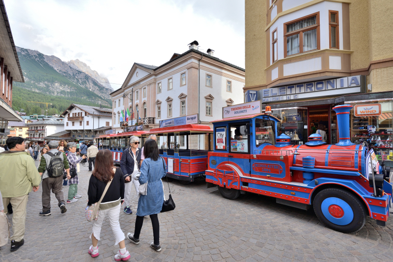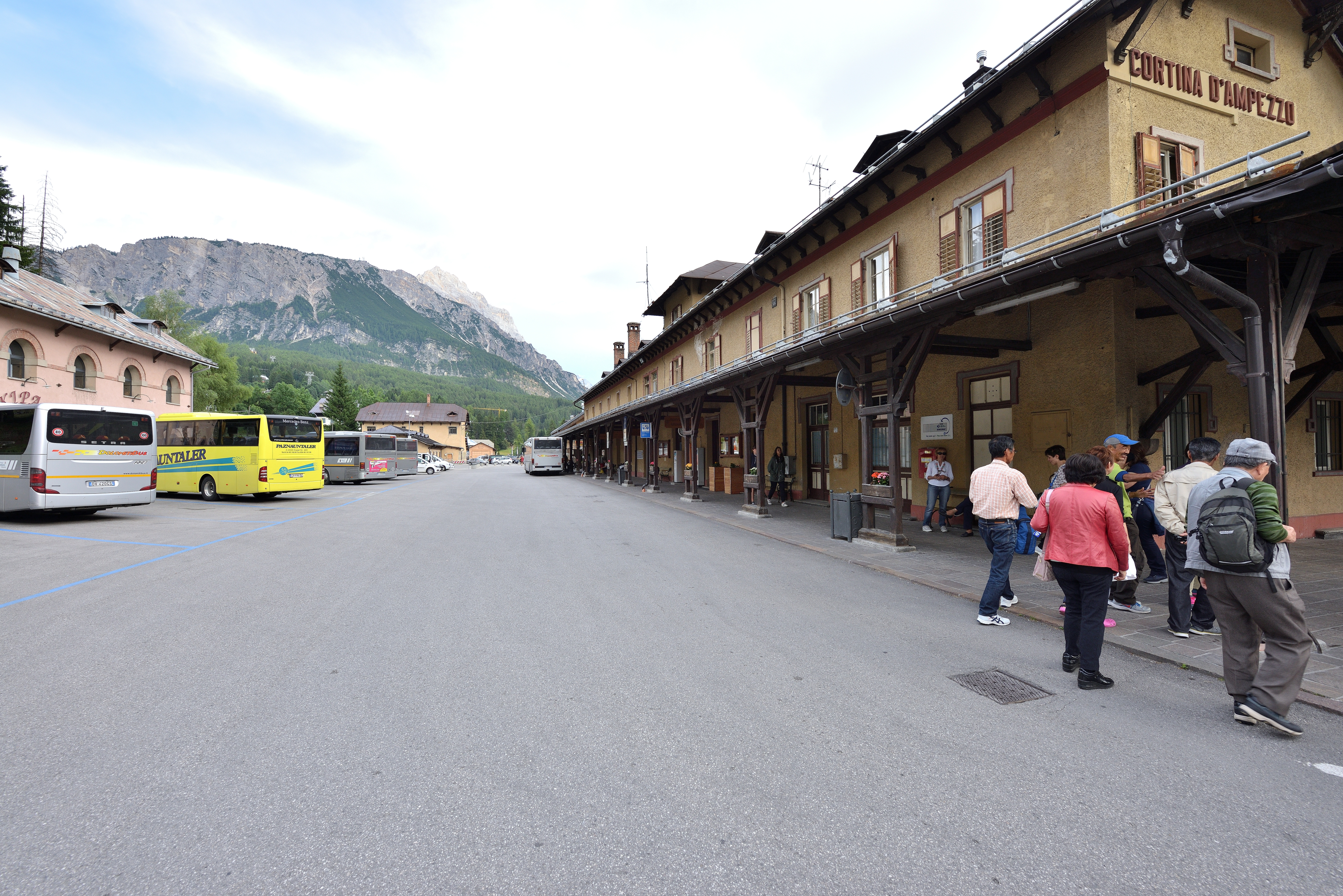 | 左のレストランは嘗ての駅舎 (18:44) 周囲を世界遺産の山塊に囲まれたコルティナ・ダンペッツォは、ドロミテ観光の東玄関口になっている。 「南東」MAP Lay.D |