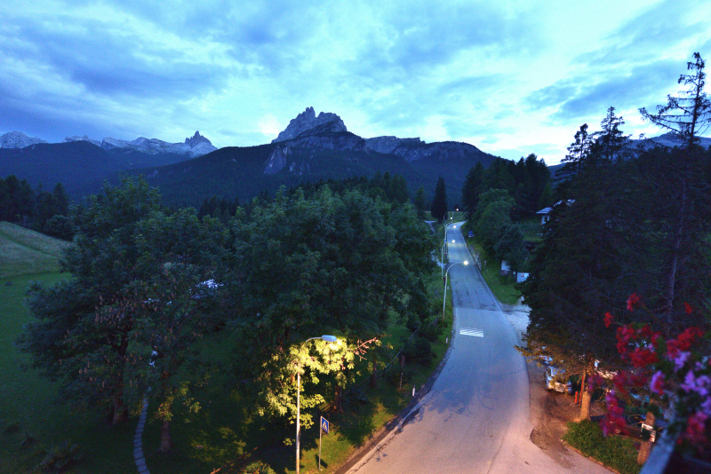 | 宿泊ホテルからの風景 (21:14) 中央のピーク (写真では低く見えている) は、アンテラーオ [Monte Antelao] (3,263 m) 。 モンテ アンテラオは、イタリア北東部のドロミテ東部で最も高い山。 コルティナ ダンペッツォの町の南東にあり、「ドロミテの王」として知られている。 ドロミテ東部の最高峰であるアンテラオは、単一の巨大な岩のピラミッド形で、多くのドロミテの山と同様、険しく、岩が多く、尖っている。 また、ドロミテ隆起の端近くに位置しているため、近くの谷への劇的な落ち込みがあり、天気が良いと、アドリア海のトリエステからアンテラオ山をはっきり観ることが出来る。 「南東」MAP Lay.D |