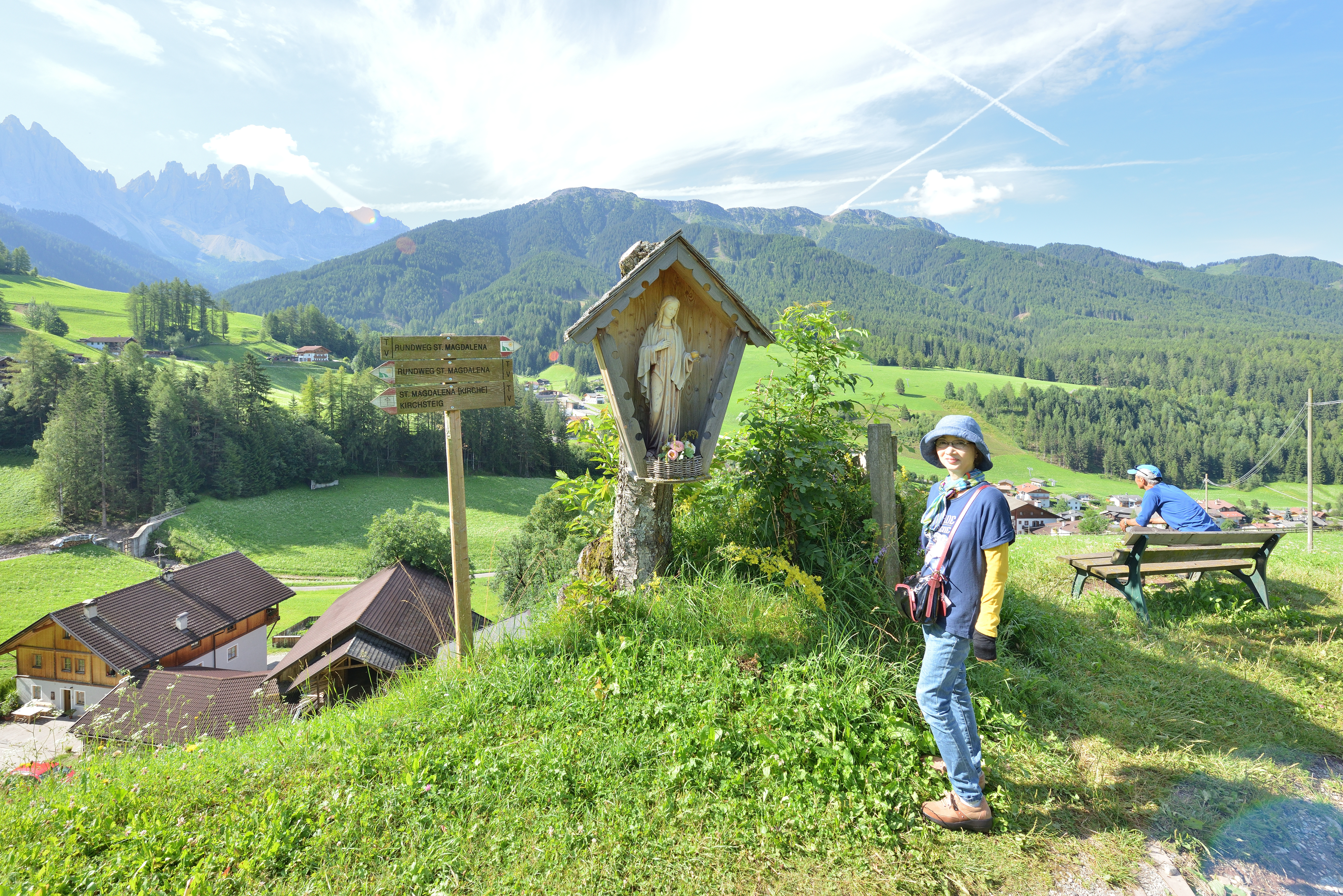 | サンタ マッダレーナ教会からの帰路 (9:35) 聖母マリア像の後方には標高3,025 mのガイスラー山 [ Geisler] (世界遺産 ) が聳えている。 「南南東」MAP Lay.A |
