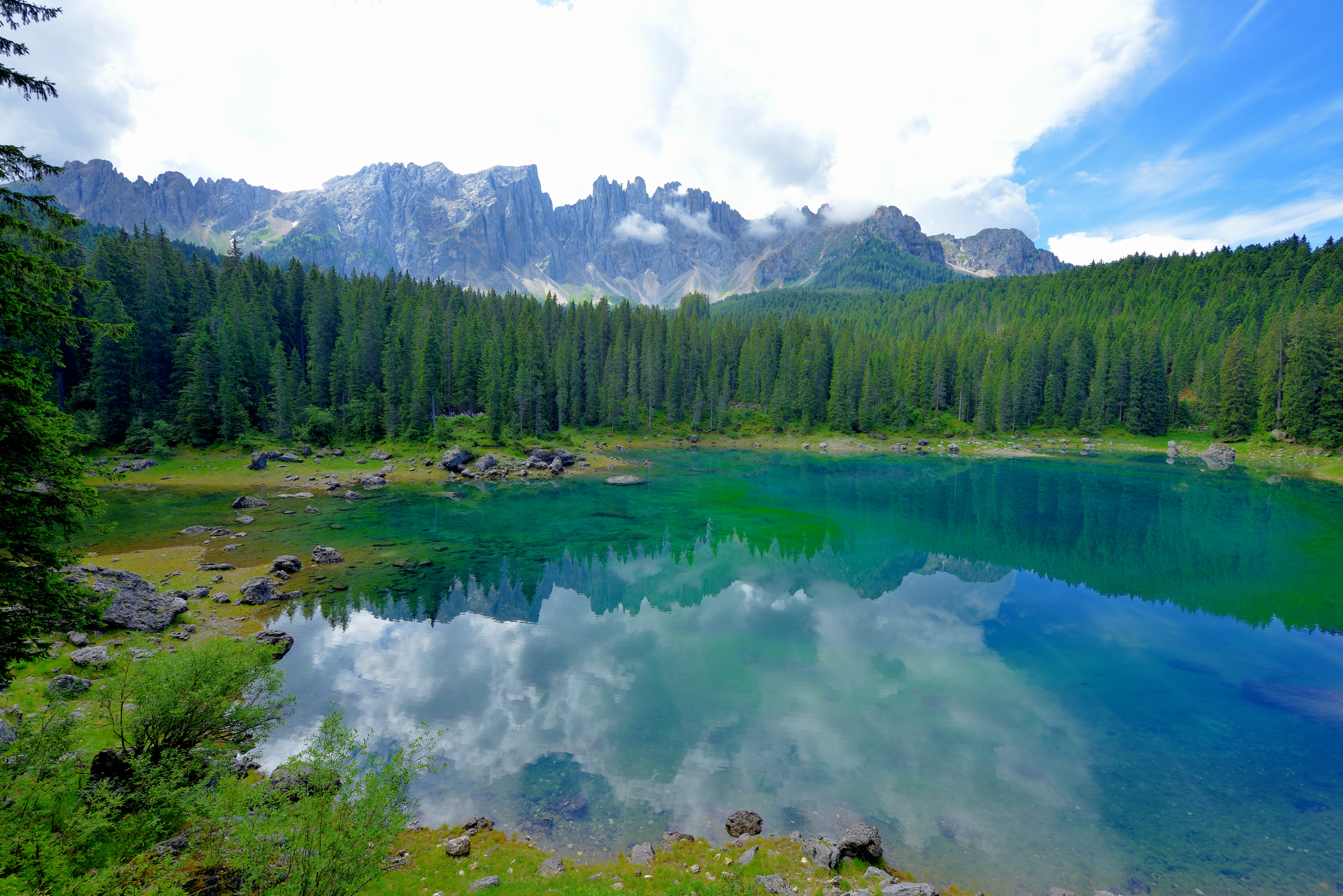 | カレッツァ湖 [Lago di Carezza] (12:01) カレッツァ湖の水は近くの雪山から溶けて地下水となり湖底から湧き出たもので、季節と温度の変化によって異なる色を呈する。 水深の深い春先の湖水は青く、その後水深が浅くなるにつれて緑色に変わり、7月と8月になると純粋なエメラルドグリーンに変化する。 この現象は、水は赤色を吸収するため、吸収されなかった他の光の色は青色がかった色になるが、春の雪解け水の多い季節には水深が深くなるため、赤い光の吸収が多くなり、湖底で反射された光は緑よりも青が濃いコバルトブルーと呼ばれる鮮やかな色になる。 夏になると水深が浅くなり、湖底までたどり着いた光が反射しても、赤い光の吸収が少ないため青と緑色が混じったようなエメラルドグリーンになる。 また、湖は周りの木々の色が反射して、緑色が強くなる傾向がある。 「南」MAP Lay.B |