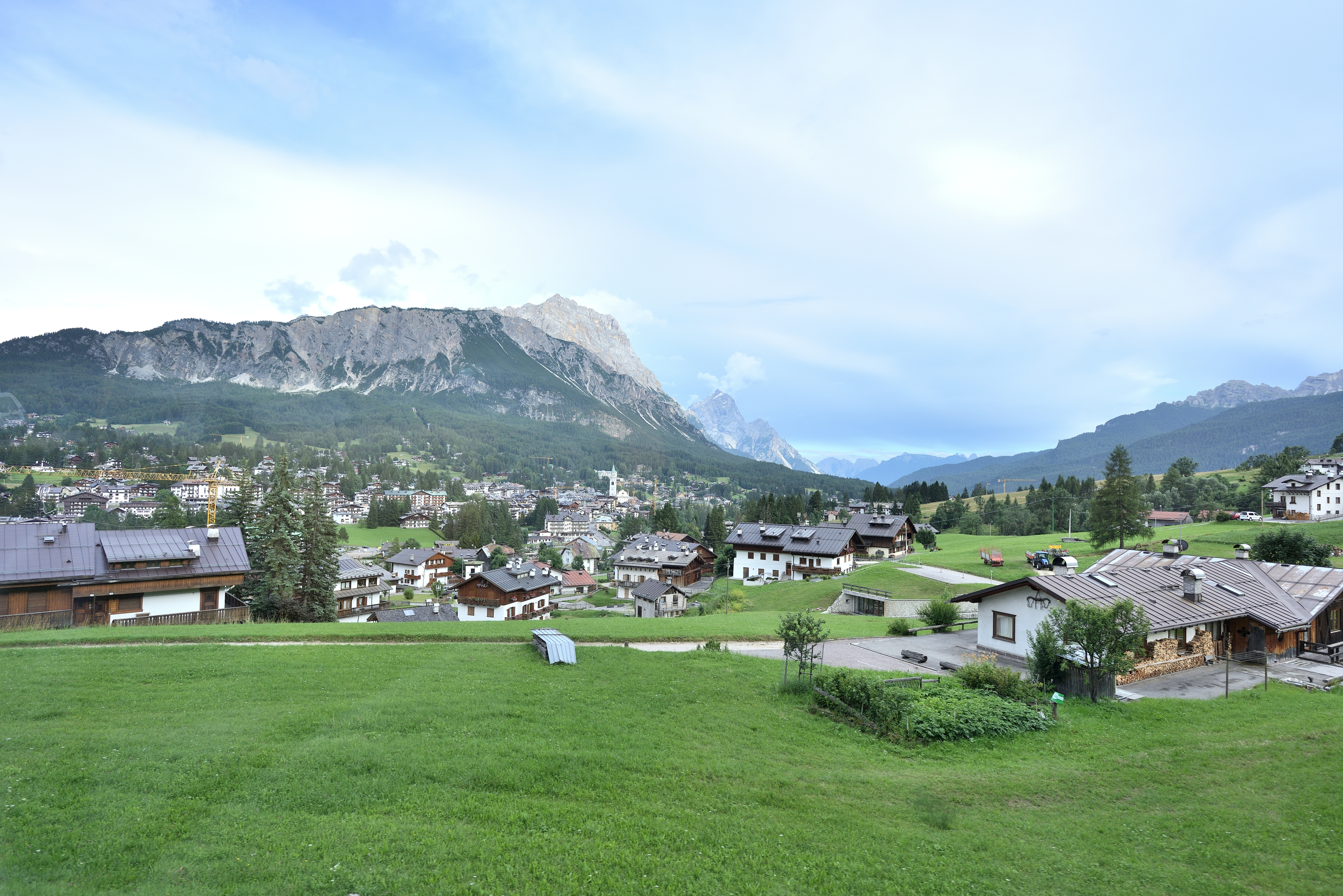 | コルティナ・ダンペッツォの中心街へ向かう途中の風景 (18:31) 中央やや左の谷を挟んで左側の山は、モンテ・クリスタッロ [Monte Cristallo] 。 「東北東」MAP Lay.D クリスタッロは、イタリア北部のヴェネト州ベッルーノ県にあるコルティナ・ダンペッツォの北東にあるイタリアのドロミテにある山塊で、3,000メートルを超える4つの頂上がある長くへこんだ尾根。 山脈は「アンペッツォドロミテの自然公園」の一部となっている。 出典:Wikipedia |
