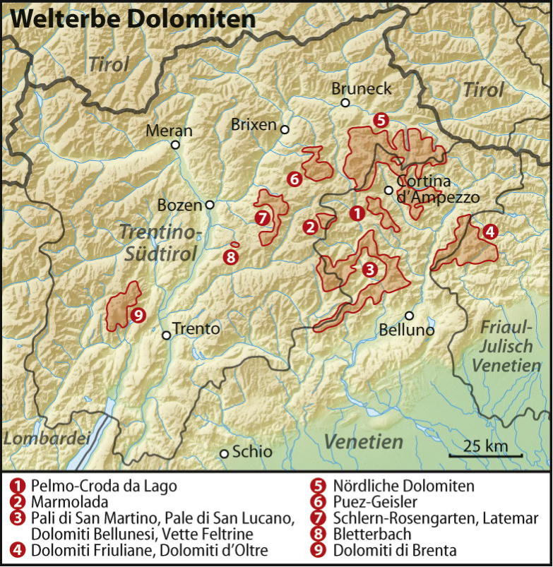| (コピー、ペースト用に再掲) Welterbe Dolomiten (世界遺産ドロミテ) 1. Pelmo-Croda da Lago 2. Marmolada 3. Pali di San Martion,Pale di San Lucano,Dolomiti Bellunesi,Vette Feltrine 4. Dolomiti Friuliane,Dolomiti d'Oltre 5. Nördliche Dolomiten 6. Puez-Geisler 7. Schlern-Rosengarten, Latemar 8. Bletterbach 9. Dolomiti di Brenta |