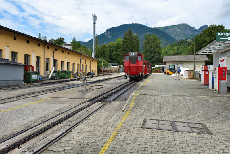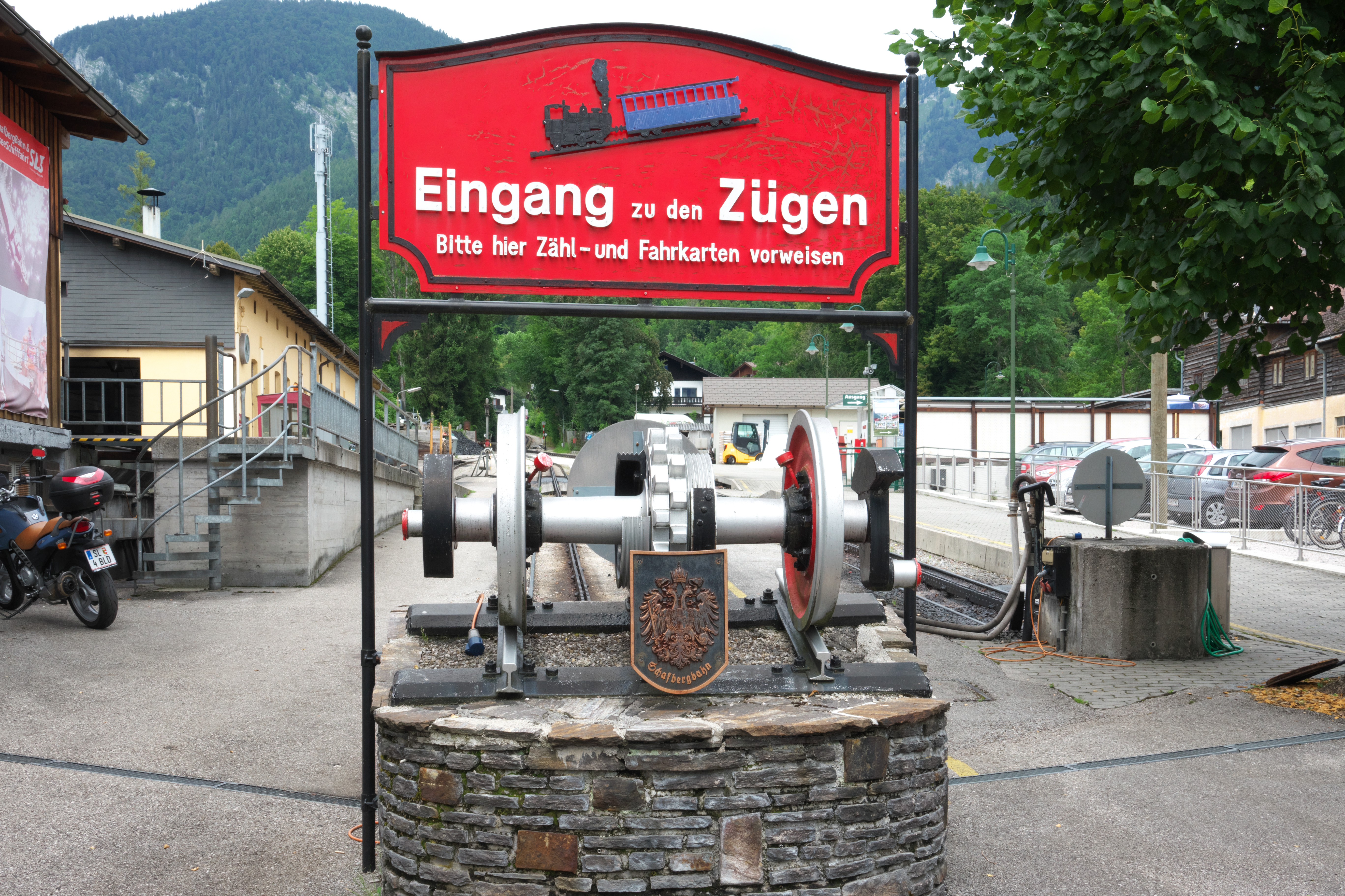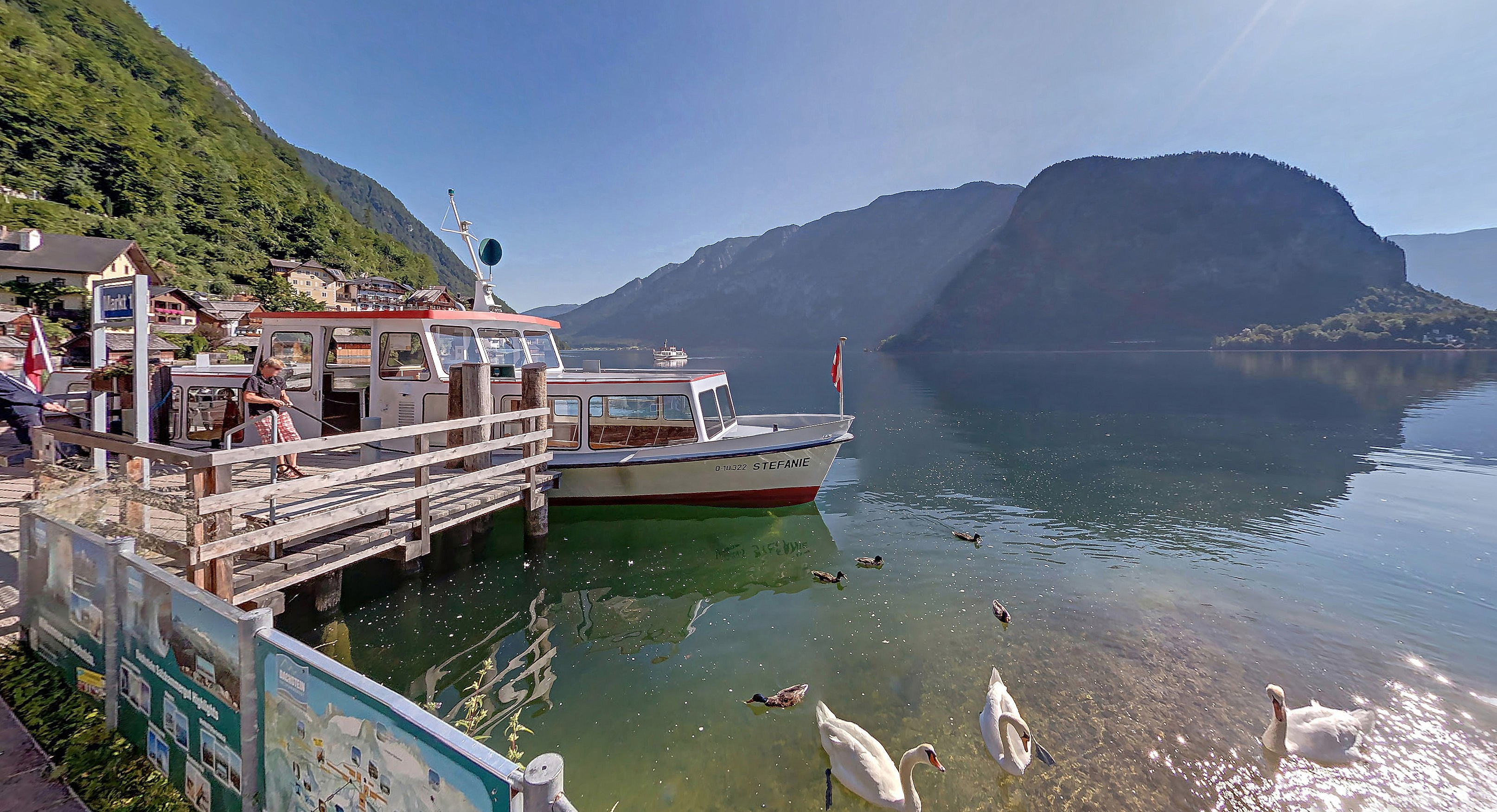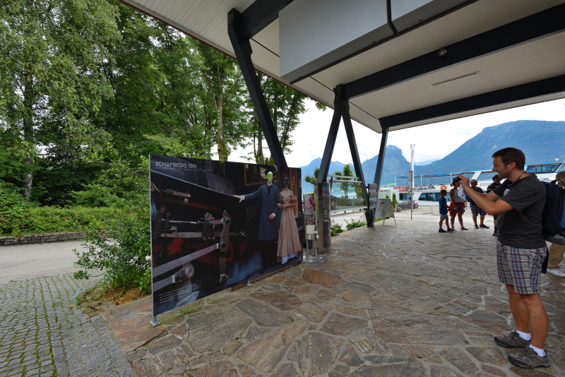 中央やや右の、湖に出っ張った岬に、東岸沿いを走るザルツカンマーグート鉄道駅 "Hallstatt" がある。 ハルシュタットの町はその対岸の西側にあるため、 ハルシュタット駅で降りたら、 駅のすぐ脇にある船着場から約10分の船旅で、ハルシュタットの中心部に渡る事が出来る。