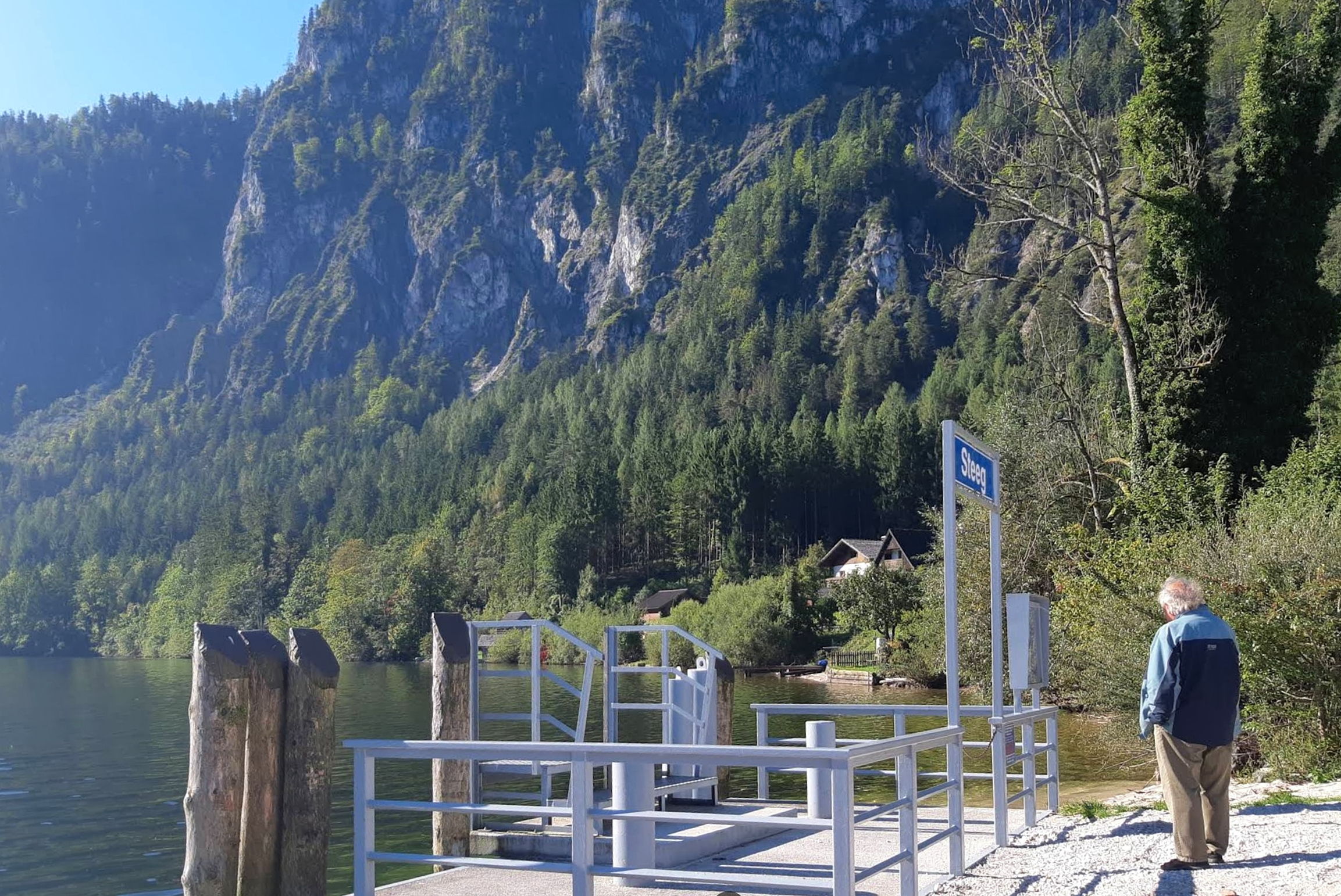 手前の道を左へ行くと、町の中心部と対岸 (東岸) にある鉄道駅 "Hallstatt" を10分で結ぶ、渡し船ターミナルがある。