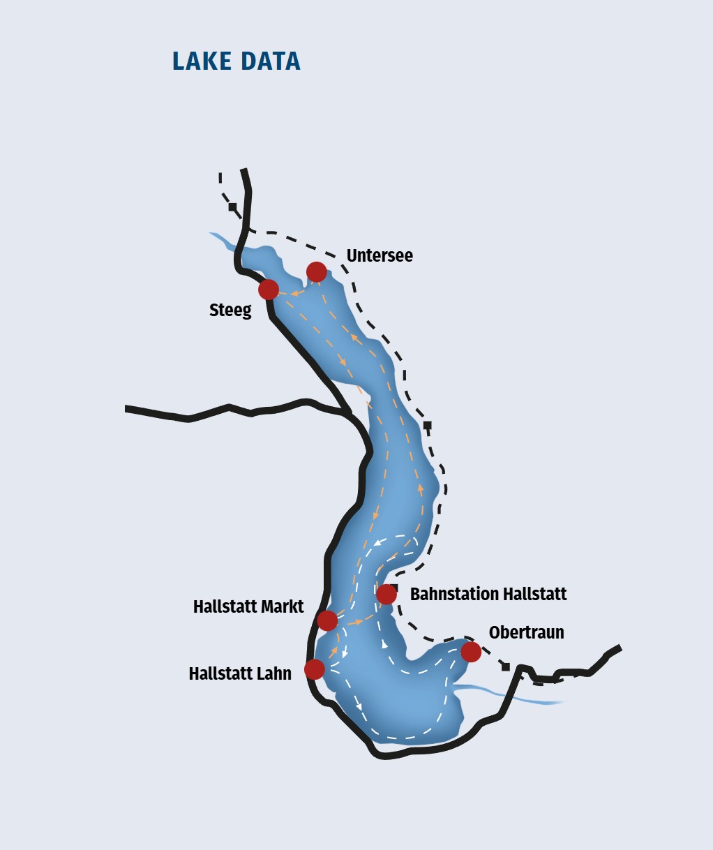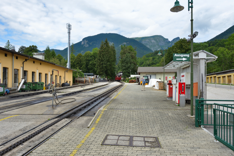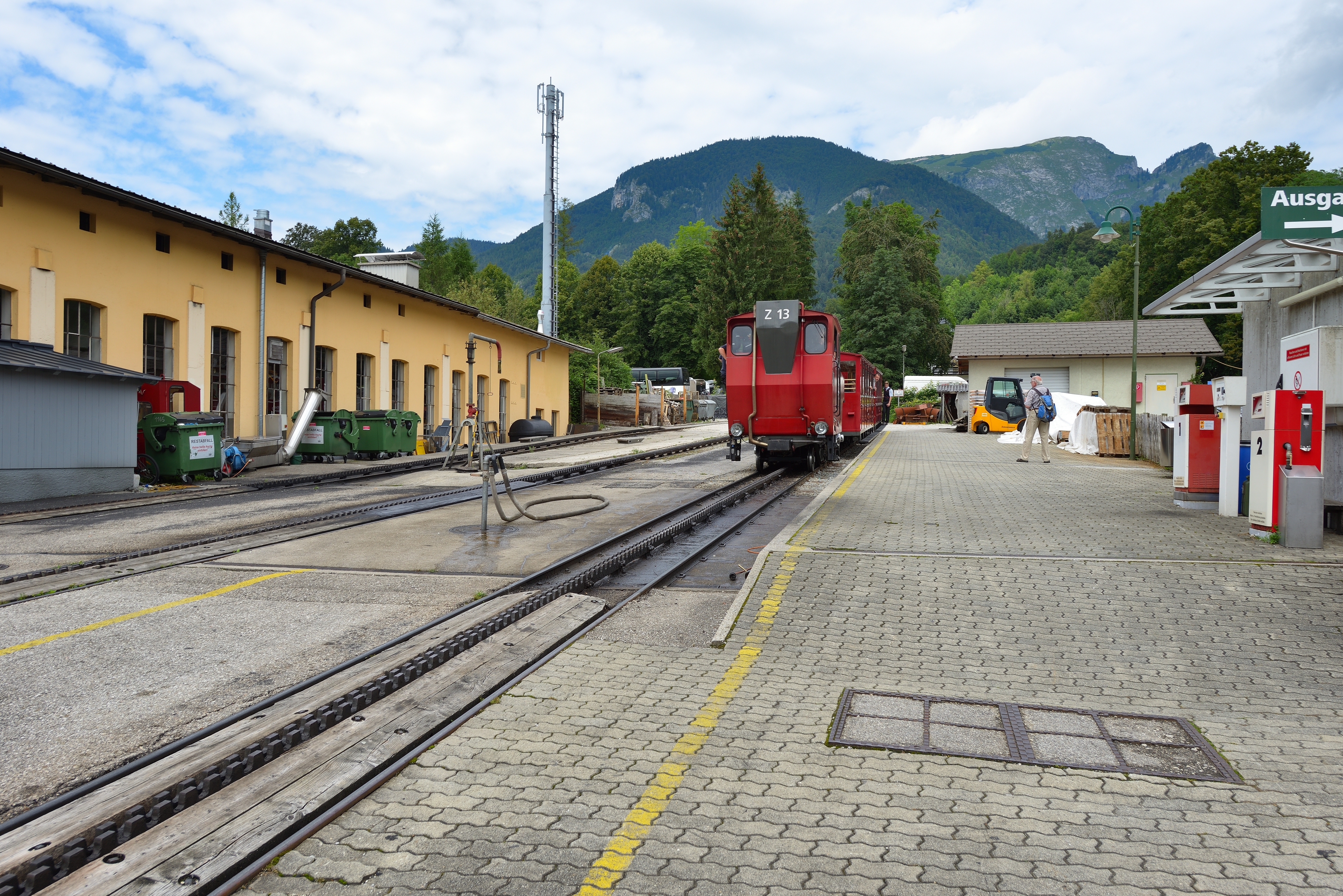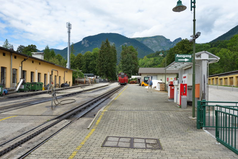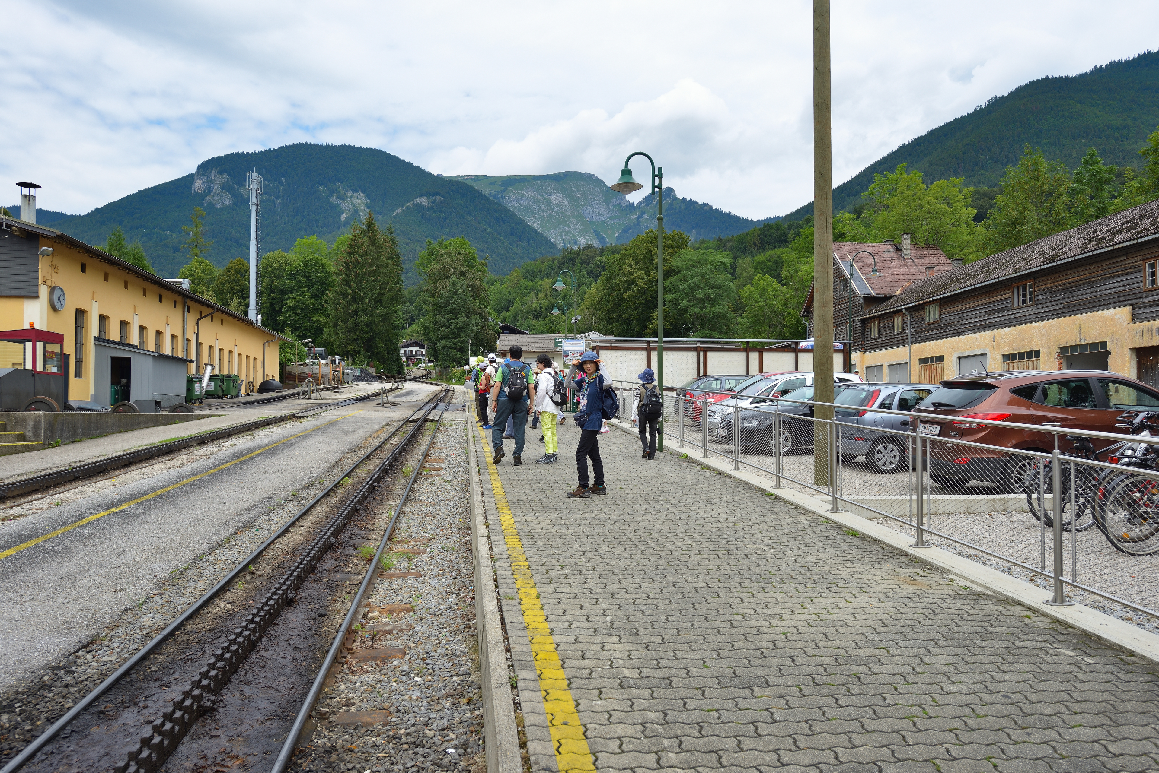 対岸 (東岸) には、湖岸沿いを走るザルツカンマーグート鉄道駅 "Hallstatt" がある。