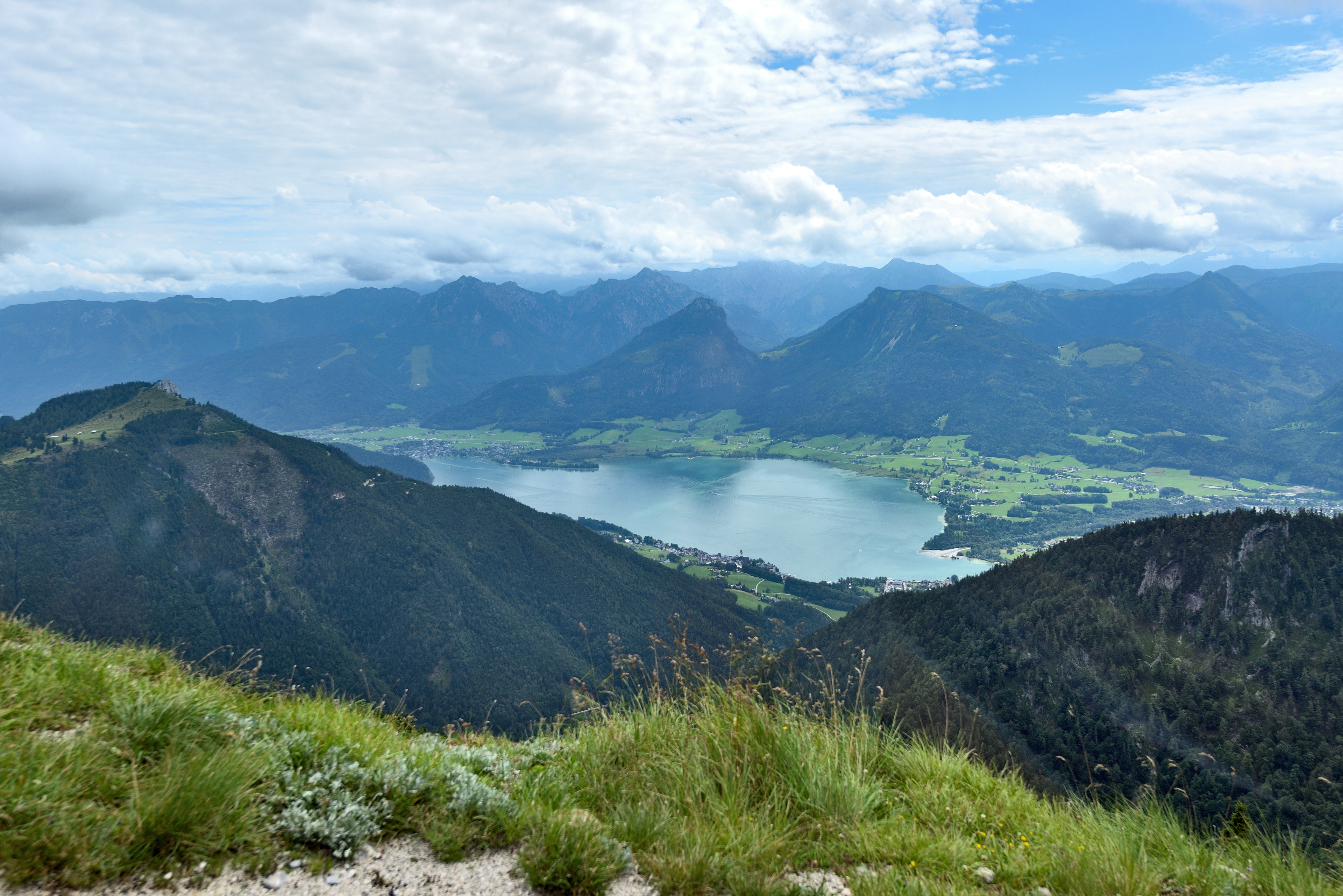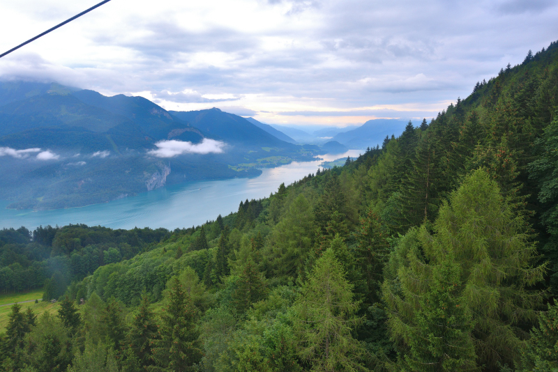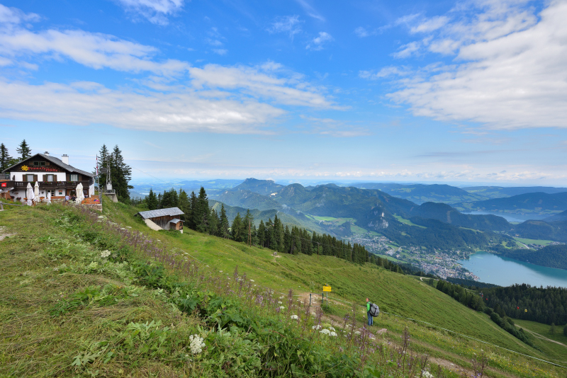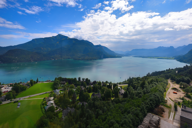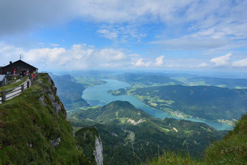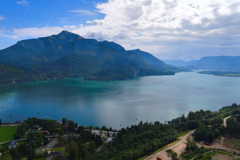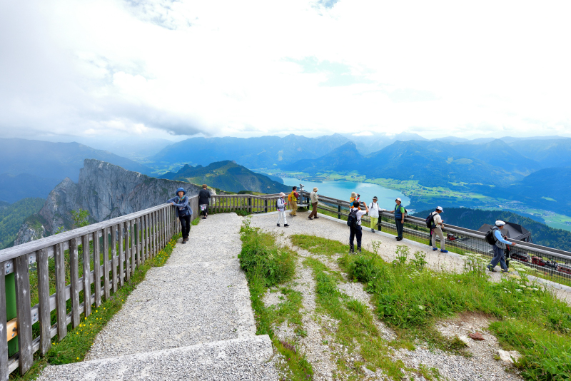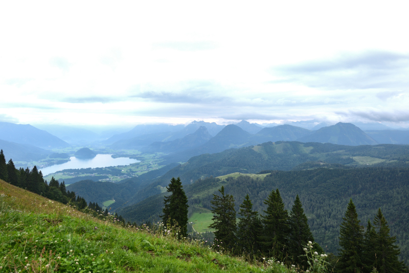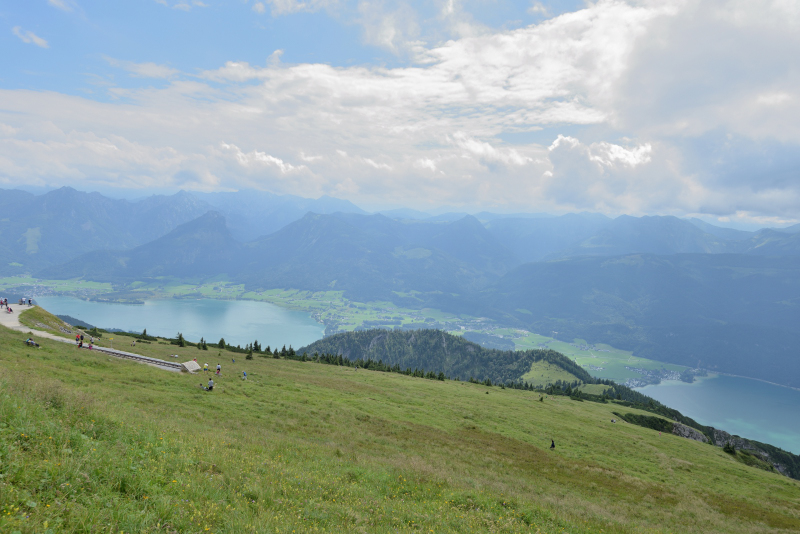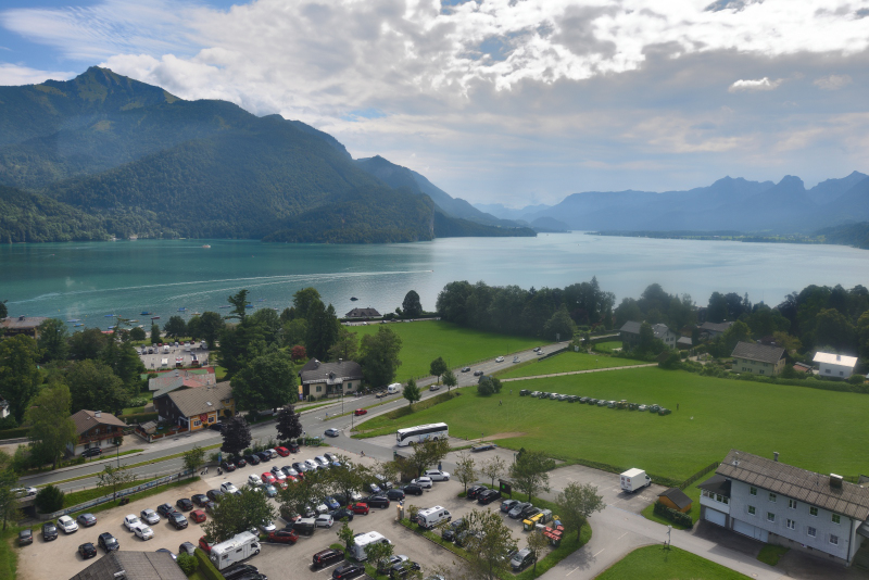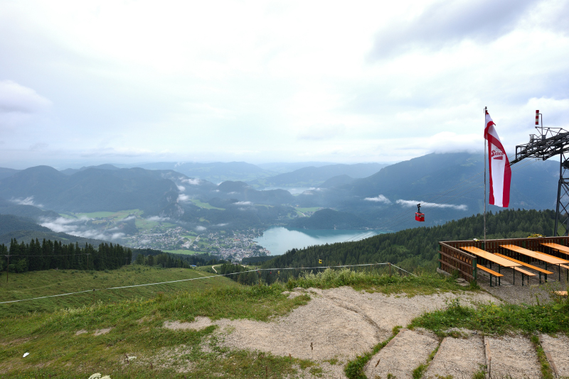 眼下に見えるのは、ヴォルフガング湖 [Wolfgangsee] と、その北西湖畔に位置するザンクト ギルゲン [Sankt Gilgen] の町。