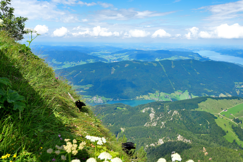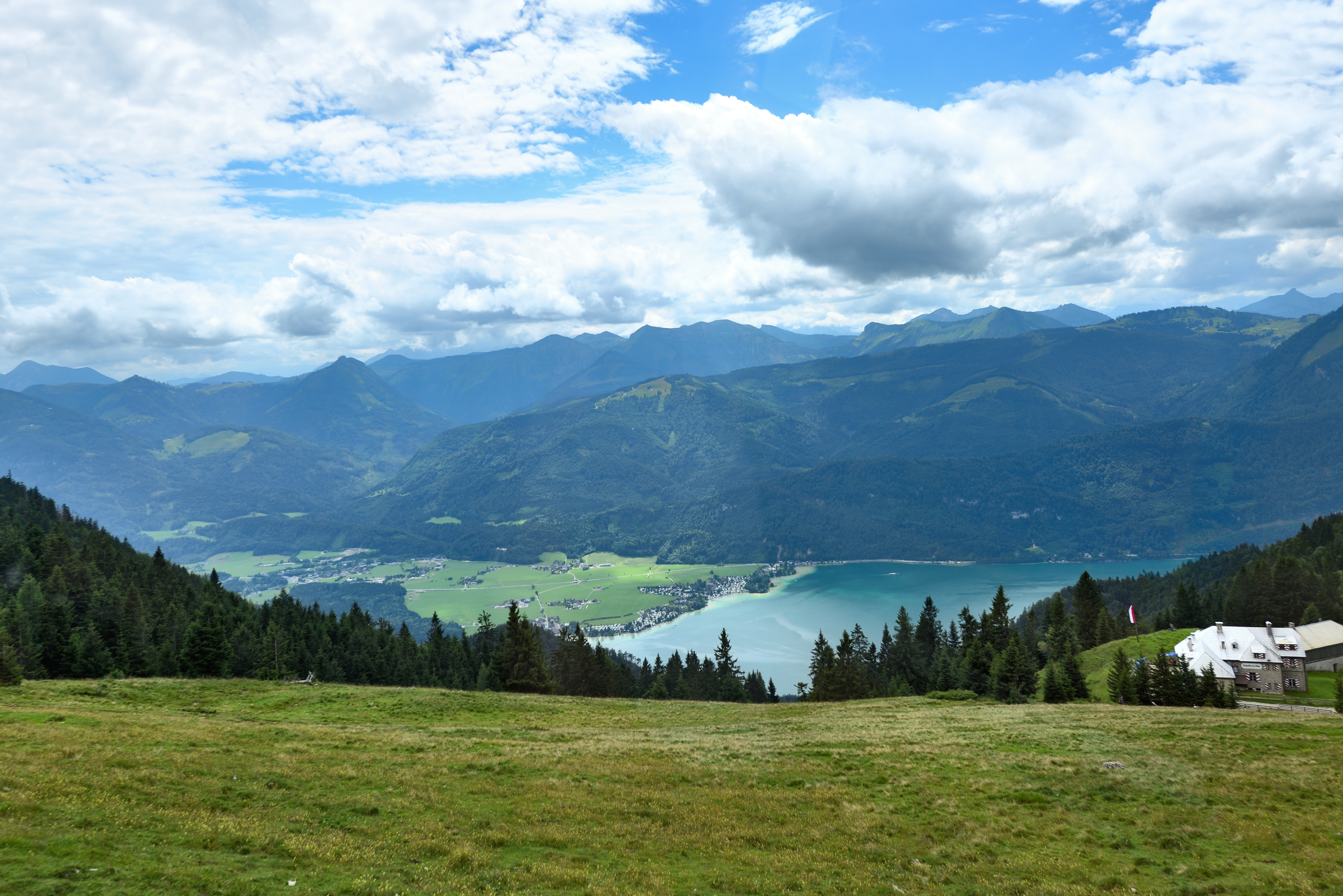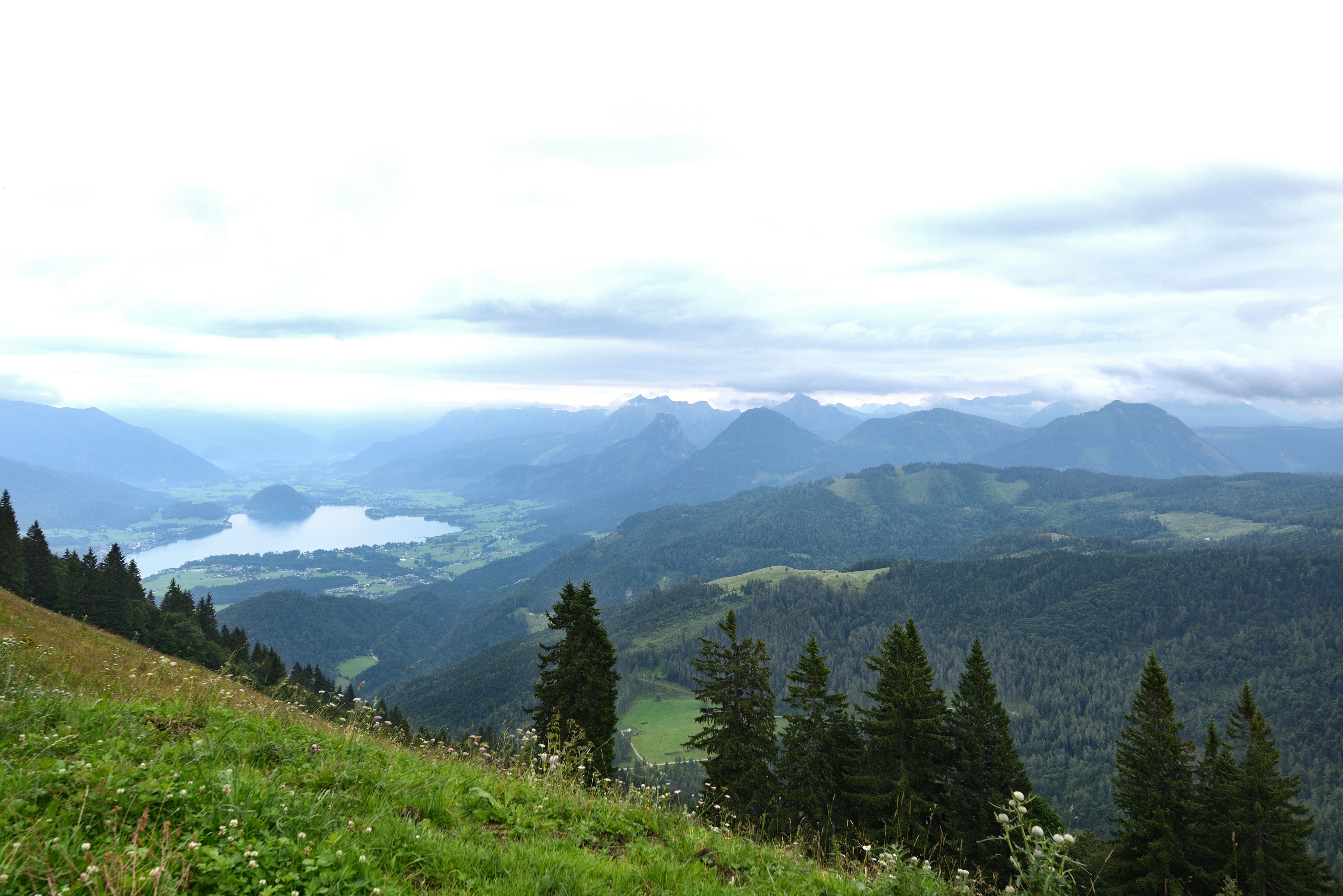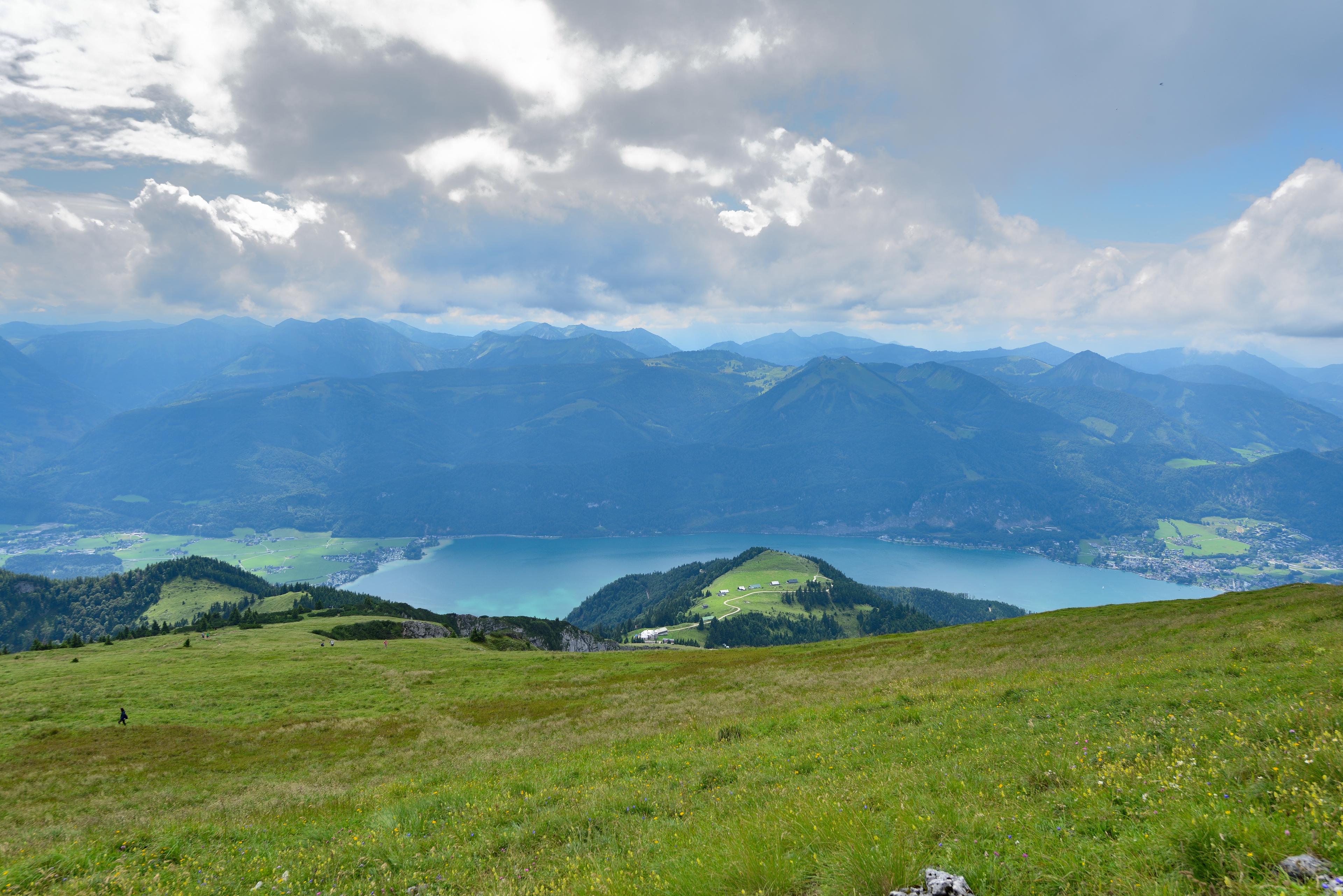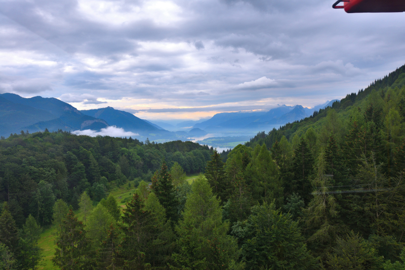 眼下に見えるのは、ヴォルフガング湖 [Wolfgangsee] と、その北西湖畔に位置するザンクト ギルゲン [Sankt Gilgen] の町。