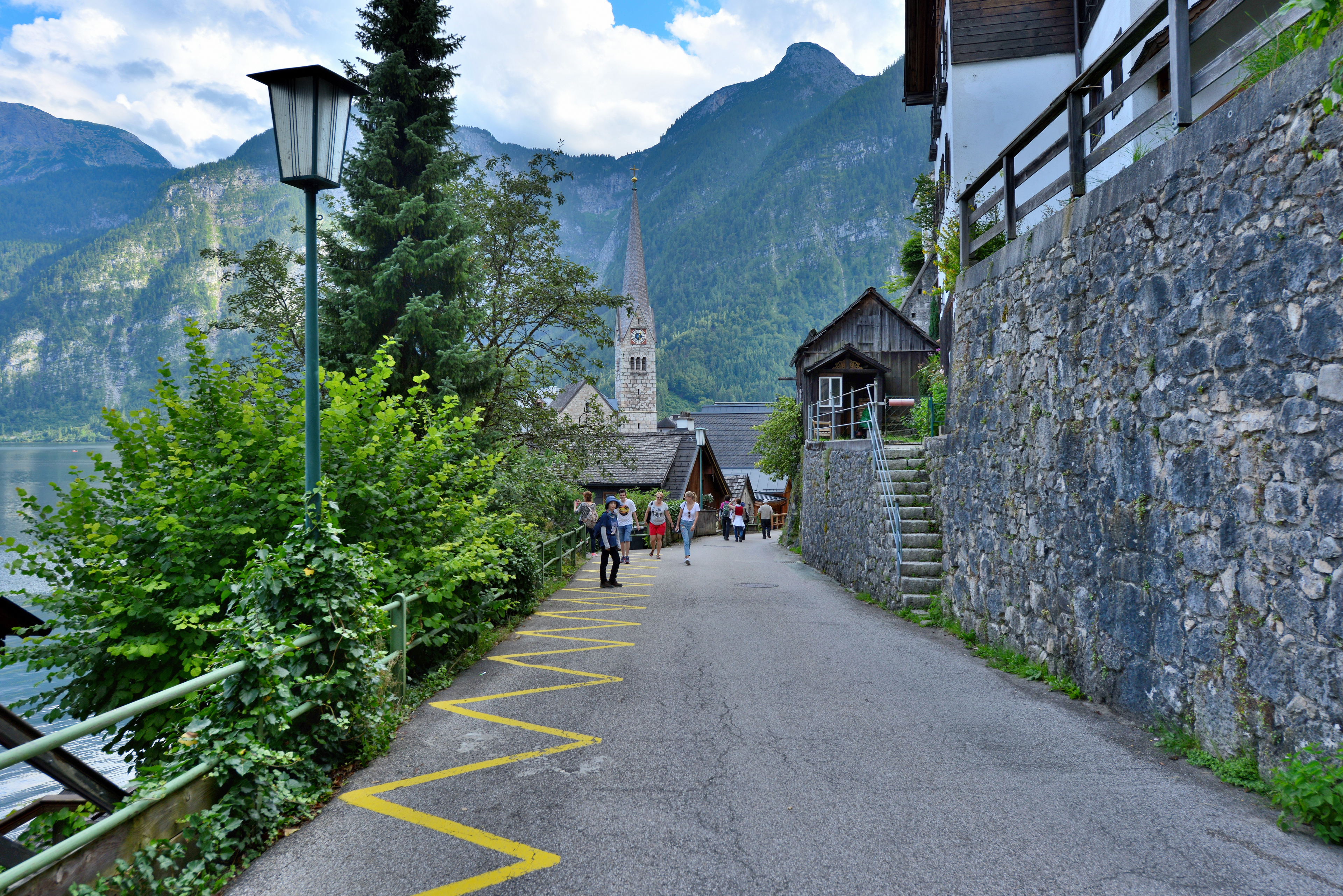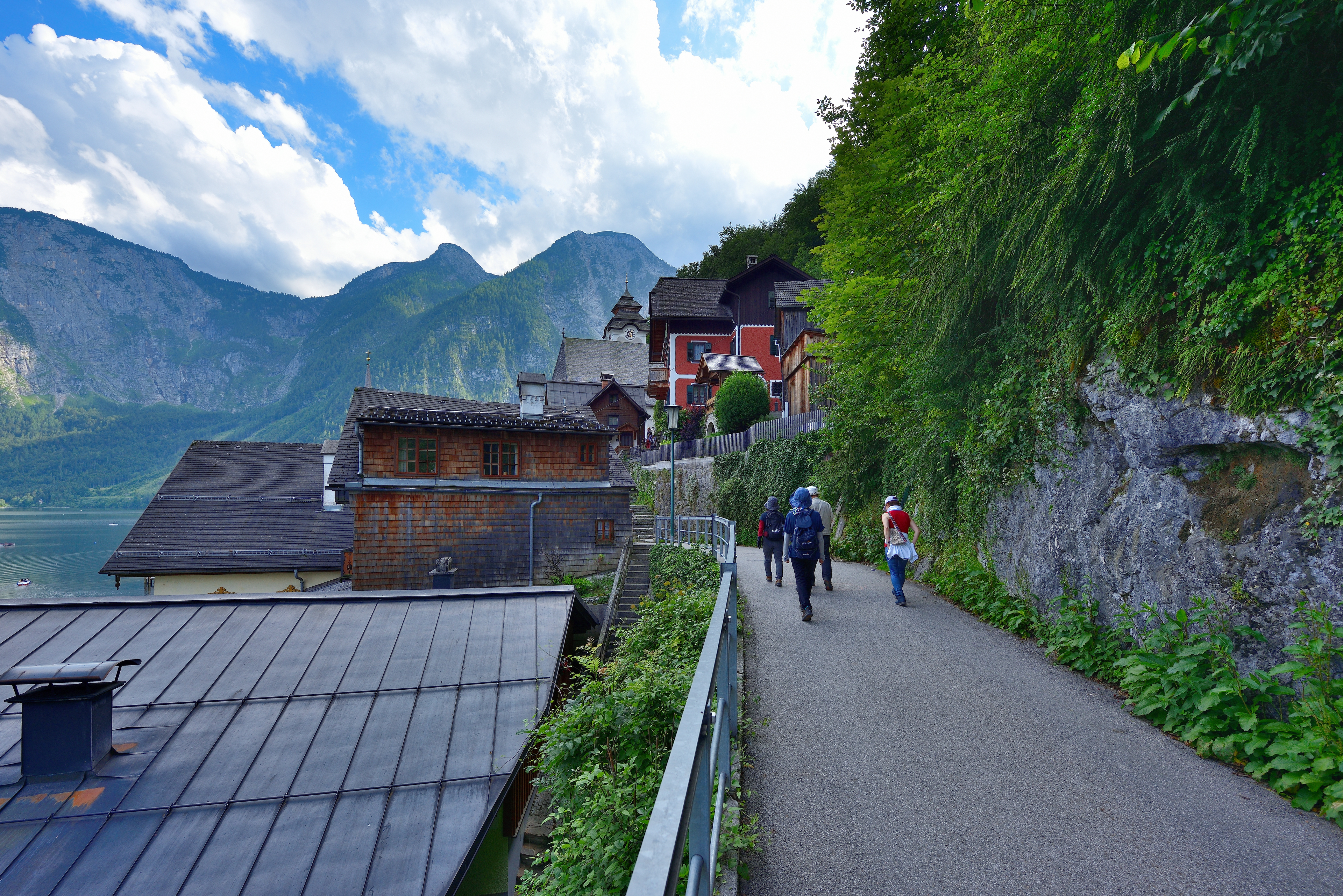 ハルシュタットの町は、湖と急峻な山の斜面の間にある細長い湖岸沿いに、家々が密集しており、湖に杭を打ち込んで建てられたものもある。