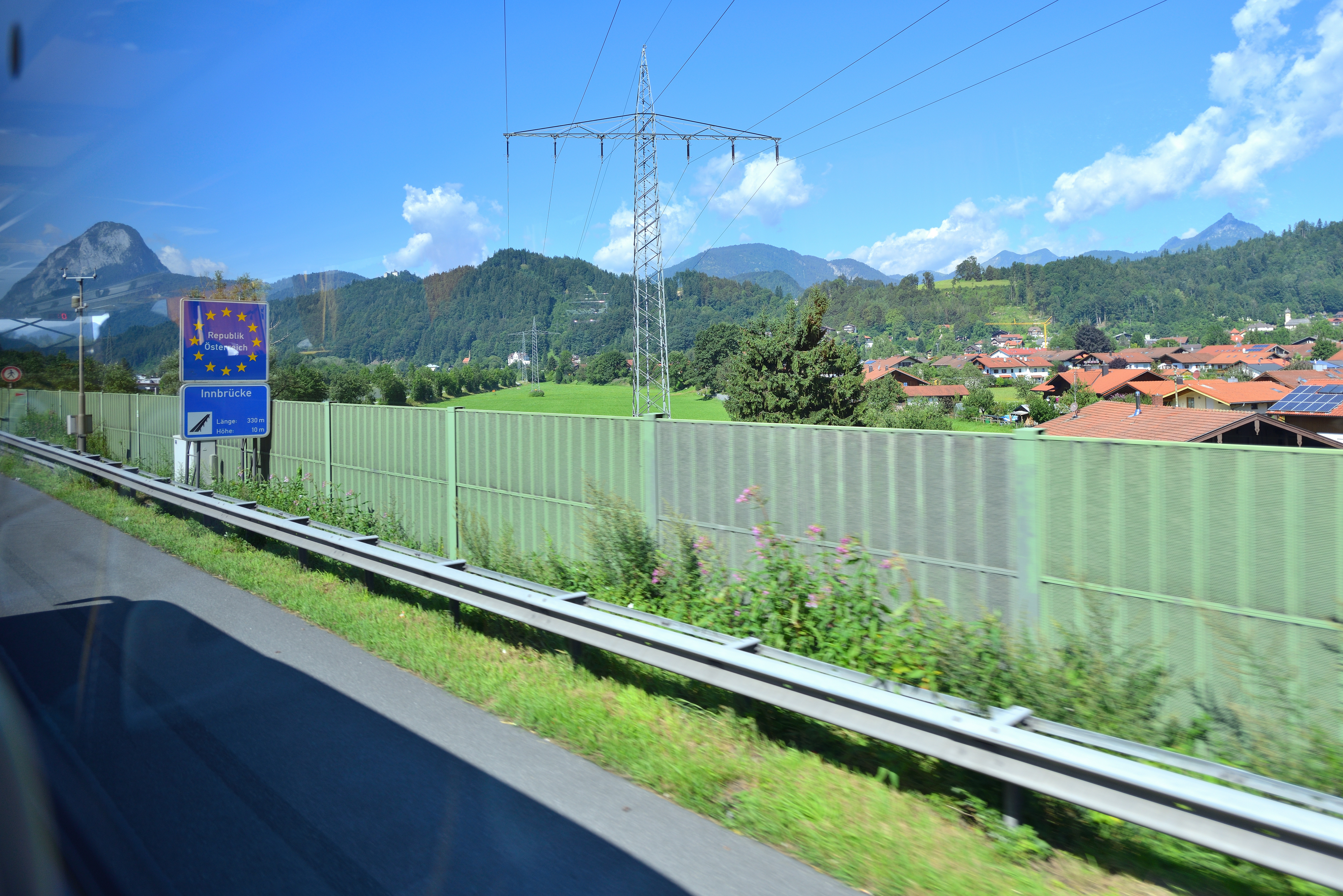 | オーストリア国境の道路標識 (10:34) ここで、ドイツからオーストリアに戻る。 ドイツからオーストリアに入る場合は、検問所は設けられていない。 道路標識は、オーストリア共和国への入国と、特定の橋に関する情報を提供。
