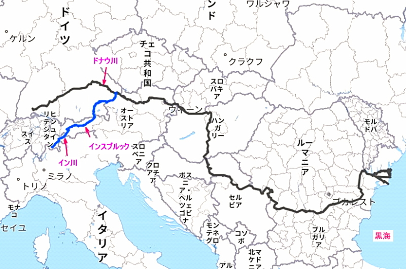 | イン川 [Inn] (11:12) イン川は、スイス,オーストリア,ドイツを流れるドナウ川最大の右岸支流で、 アルプス中央部を貫流する全長517kmの川。 スイス南東隅に源を発し、北東に向かってオーストリアのインスブルックを経てドイツのバイエルン地方に流入し、最後は黒海へと注ぐ。 川の水は、アルプスを形成する石灰岩の氷食により、多くの石灰分が氷河水に溶け込むため白濁している。 氷食(ひょうしょく)とは、岩石や土砂が氷河によって削られ、侵食されることを指す。 「北西」 |
