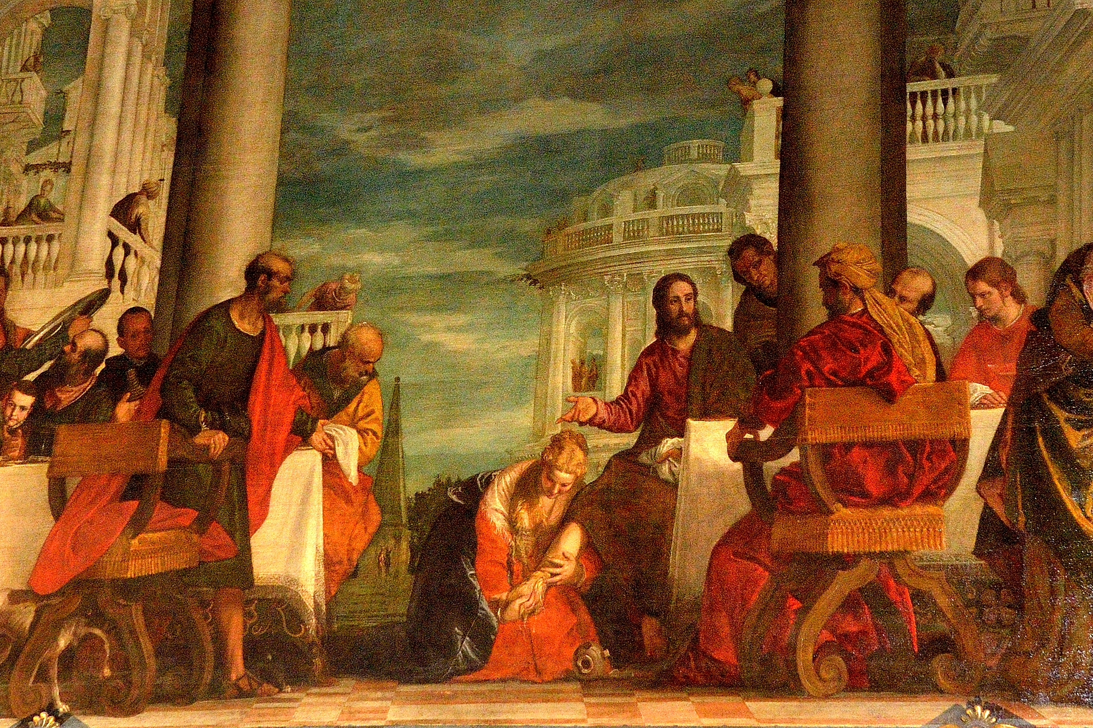イエスがファリサイ派のシモンの家に招かれて食事をしている時、一人の招かれざる客、「罪深い女」が現れた。