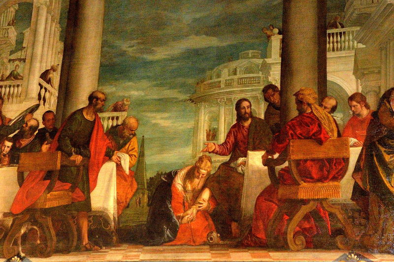 『あるファリサイ派の人が、一緒に食事をしてほしいと願ったので、イエスはその家に入って食事の席に着かれた。この町に一人の罪深い女がいた。イエスがファリサイ派の人の家に入って食事の席に着いておられるのを知り、香油の入った石膏の壺を持って来て、後ろからイエスの足もとに近寄り、泣きながらその足を涙でぬらし始め、自分の髪の毛でぬぐい、イエスの足に接吻して香油を塗った。』(ルカ 七・36-38)