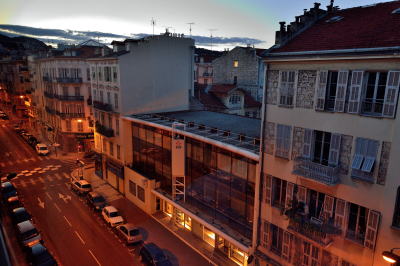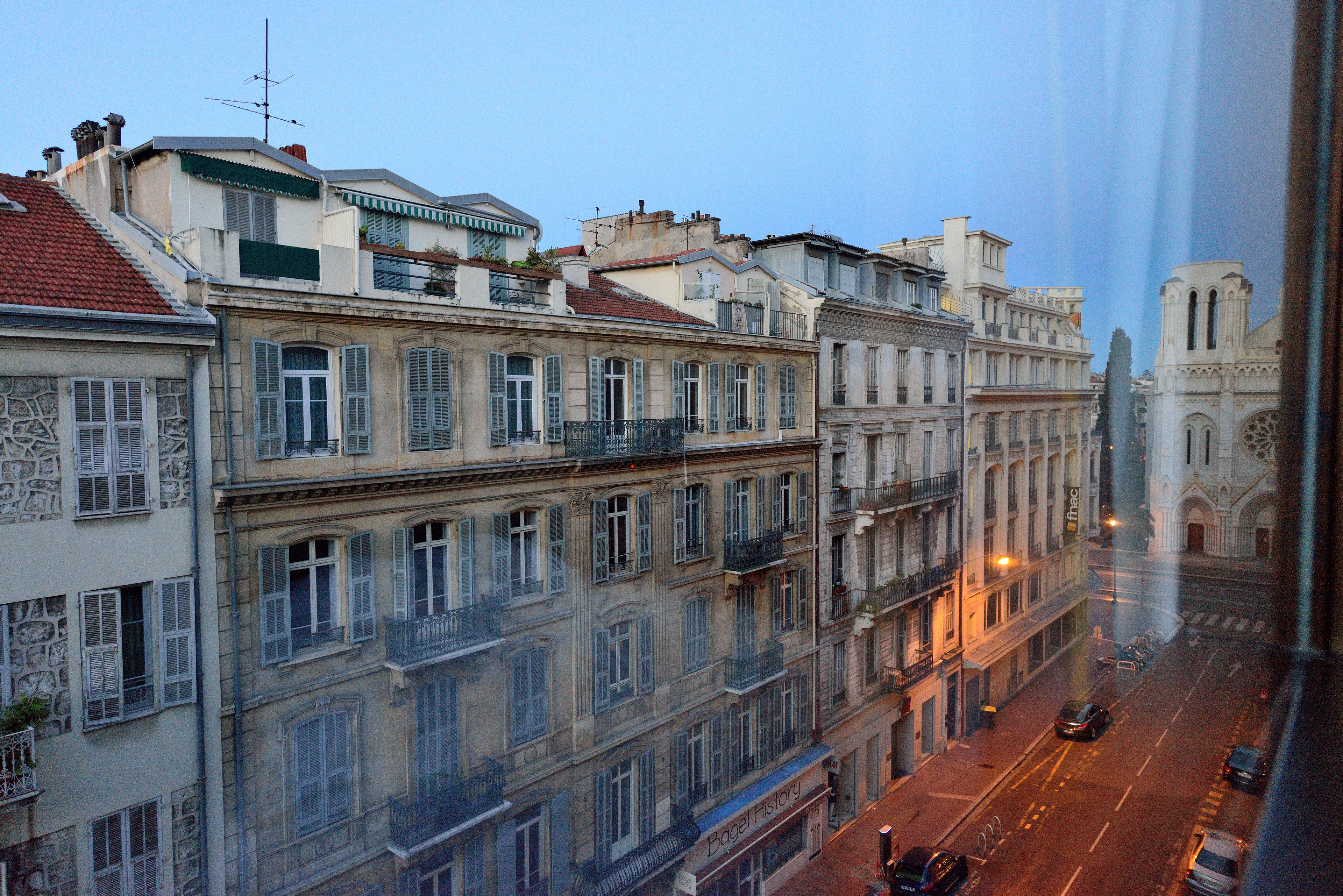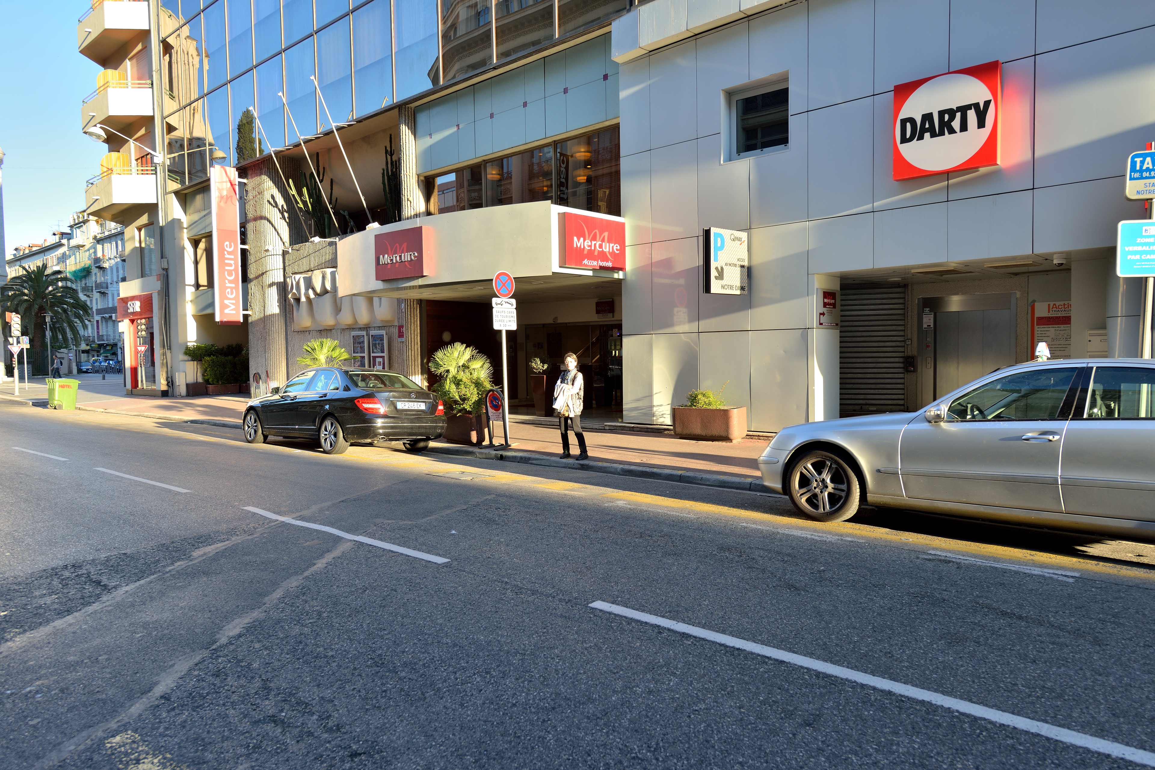 | ノートル=ダム通り [Avenue Notre Dame] (ホテル周辺を散策) (06:59) 中央のガラス張りの建物は、 宿泊ホテル、メルキュール・ニース・センター・ノートルダム [Hotel Mercure Nice Centre Notre Dame] 。 「北北東」MAPLay. A |