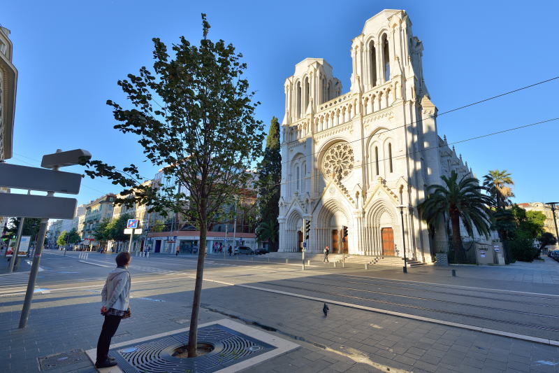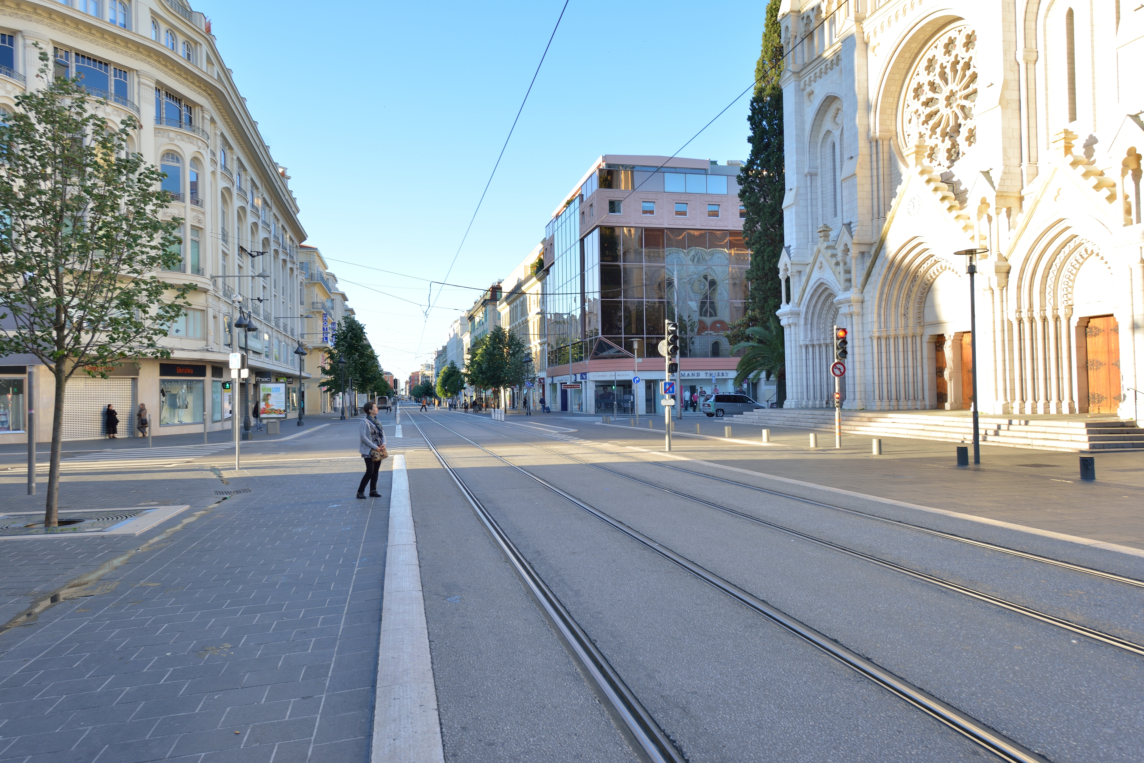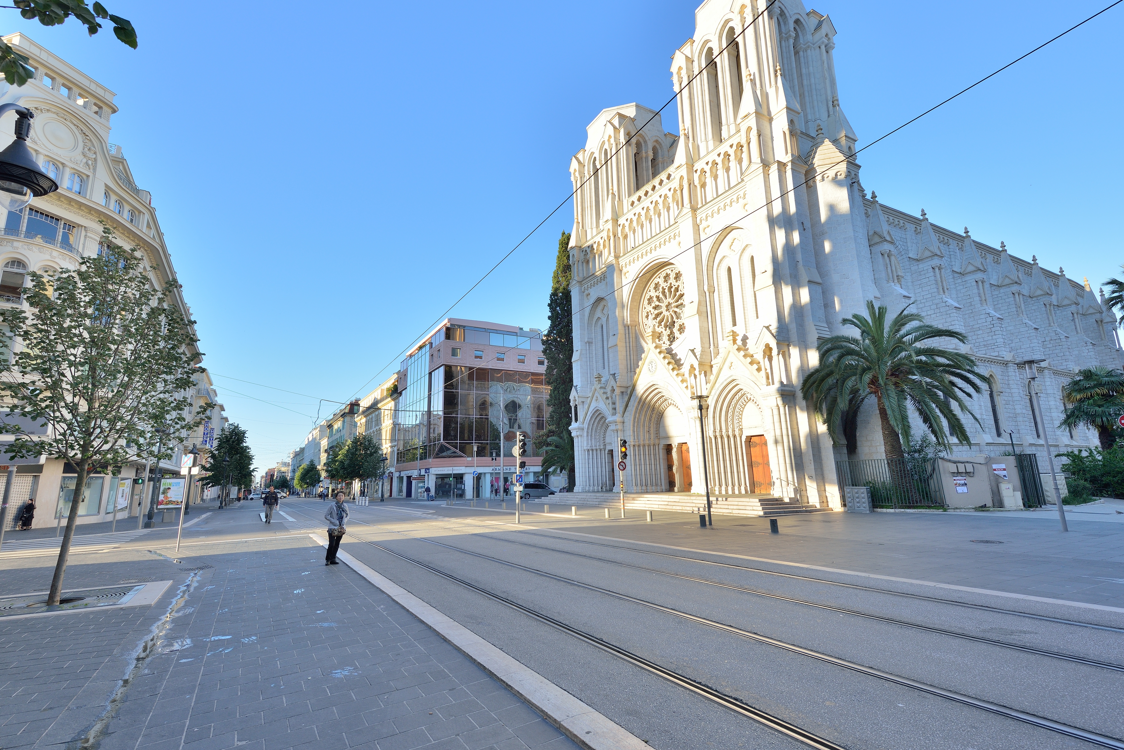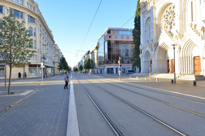 | ニースのメインストリート、ジャン・メドサン通り [Avenue Jean Médecin] (ホテル周辺を散策) (06:57) 右手に見える大きな建物は、昇天の聖母大聖堂 [Basilique Notre-Dame de l’Assomption] 。 建設はニースのフランス併合の後だったので、フランス化を意図して、ロワール地方にあるアンジェ大聖堂 [la cathédrale d'Angers] の設計を取り入れたフランス風ネオ·ゴシック様式で造られている。 「南南東」MAPLay. A |