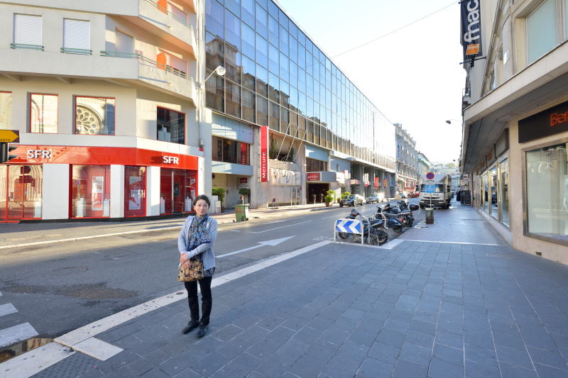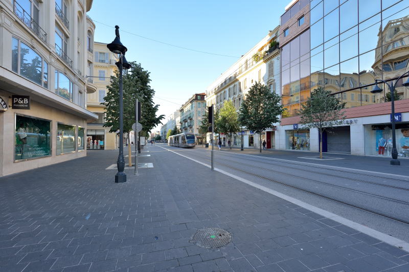 | ジャン・メドサン通り [Avenue Jean Médecin] (ホテル周辺を散策) (07:00) デパートや銀行、レストランなどが軒を連ねている、ニースで一番の目抜き通り。 「南南東」MAPLay. A |