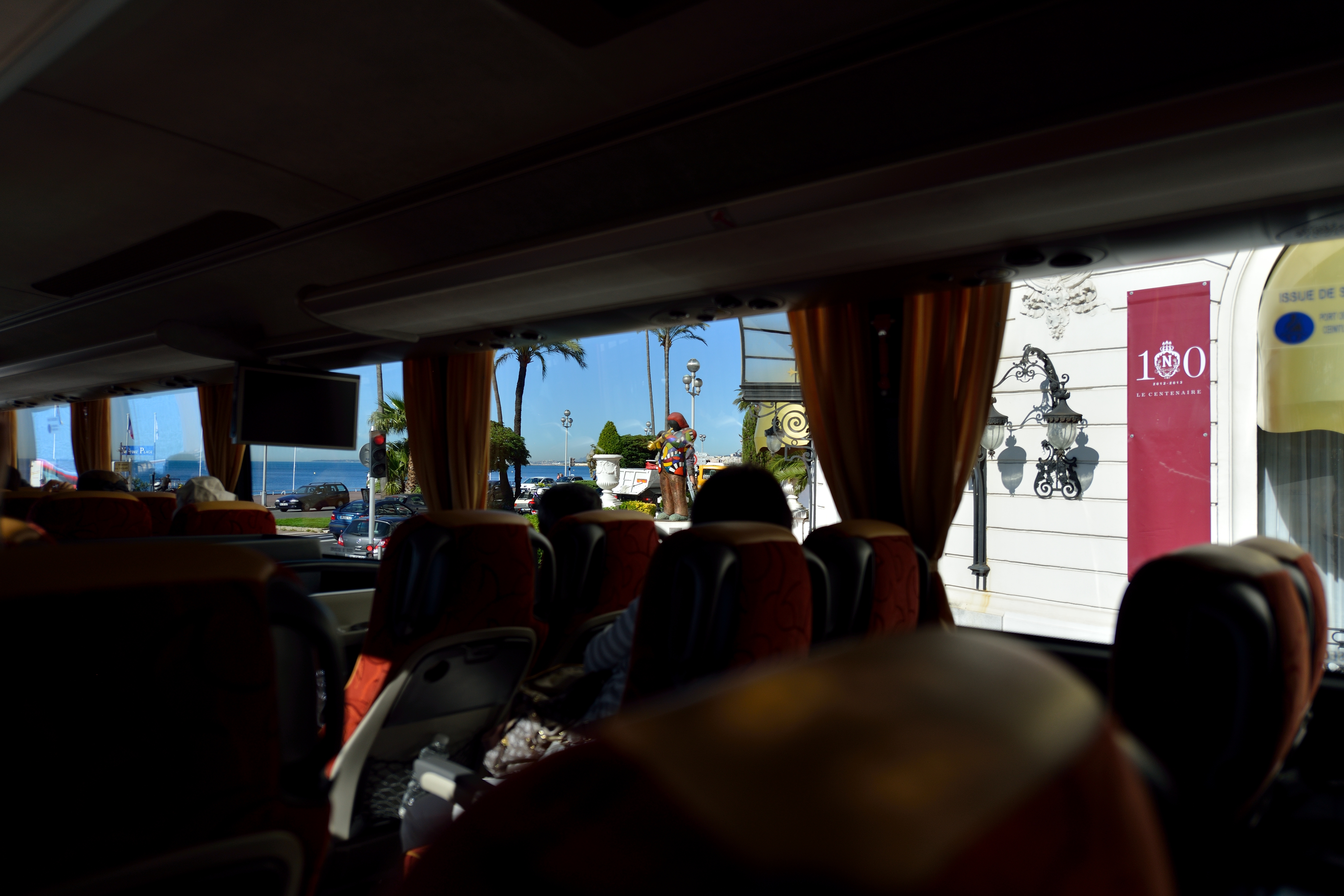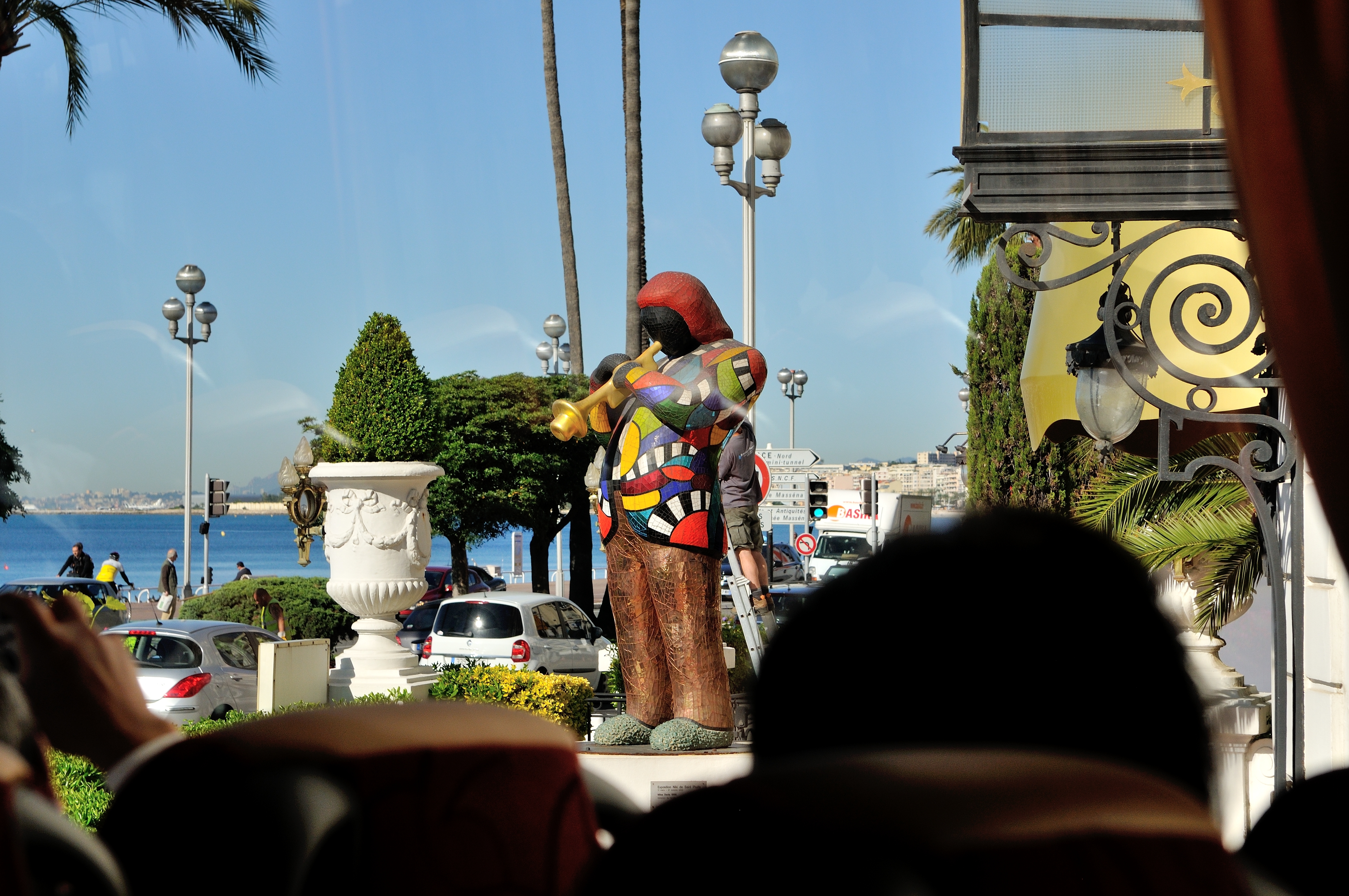 | ネグレスコ・ホテル前の音楽家 [Le musicien devant le Négresco] (09:13) 1913年1月8日に開業したホテル・ネグレスコ [Hôtel Le Negresco] は、コートダジュールに滞在中の著名人たちが、よく利用する高級ホテルで、その前に置かれたシンボリック像。 因みに、このホテルは歴史的建造物に指定されている。 (車窓からの風景) 「南南西」MAPLay. A |