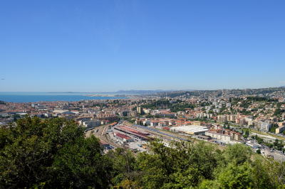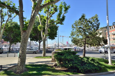 | シミエ・フランシスコ会修道院の庭園からの景色 (09:43) 中央はニース港。 その右手のこんもりした森は、城の丘 [La Colline du Château] 。 「南東」MAPLay. A |
