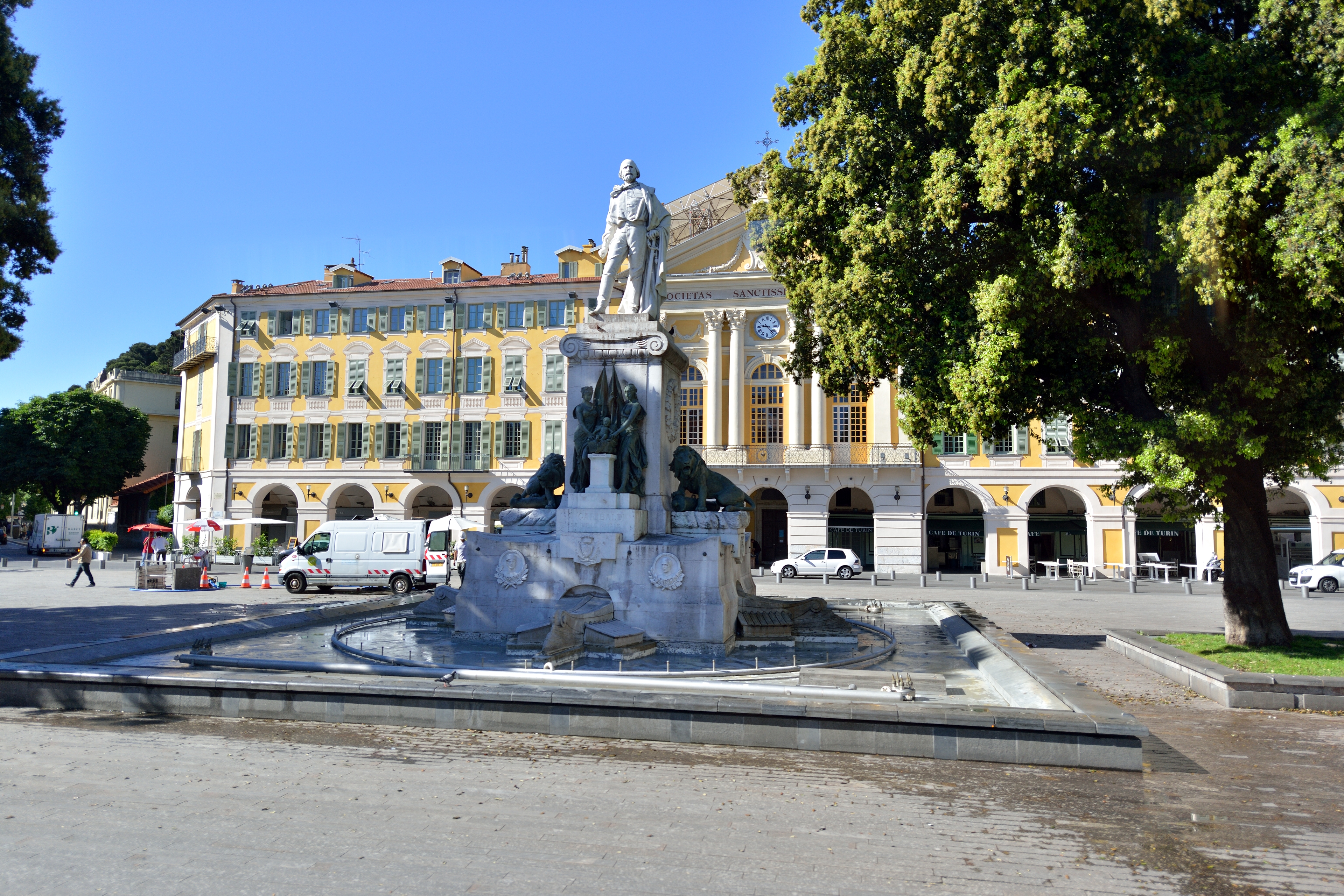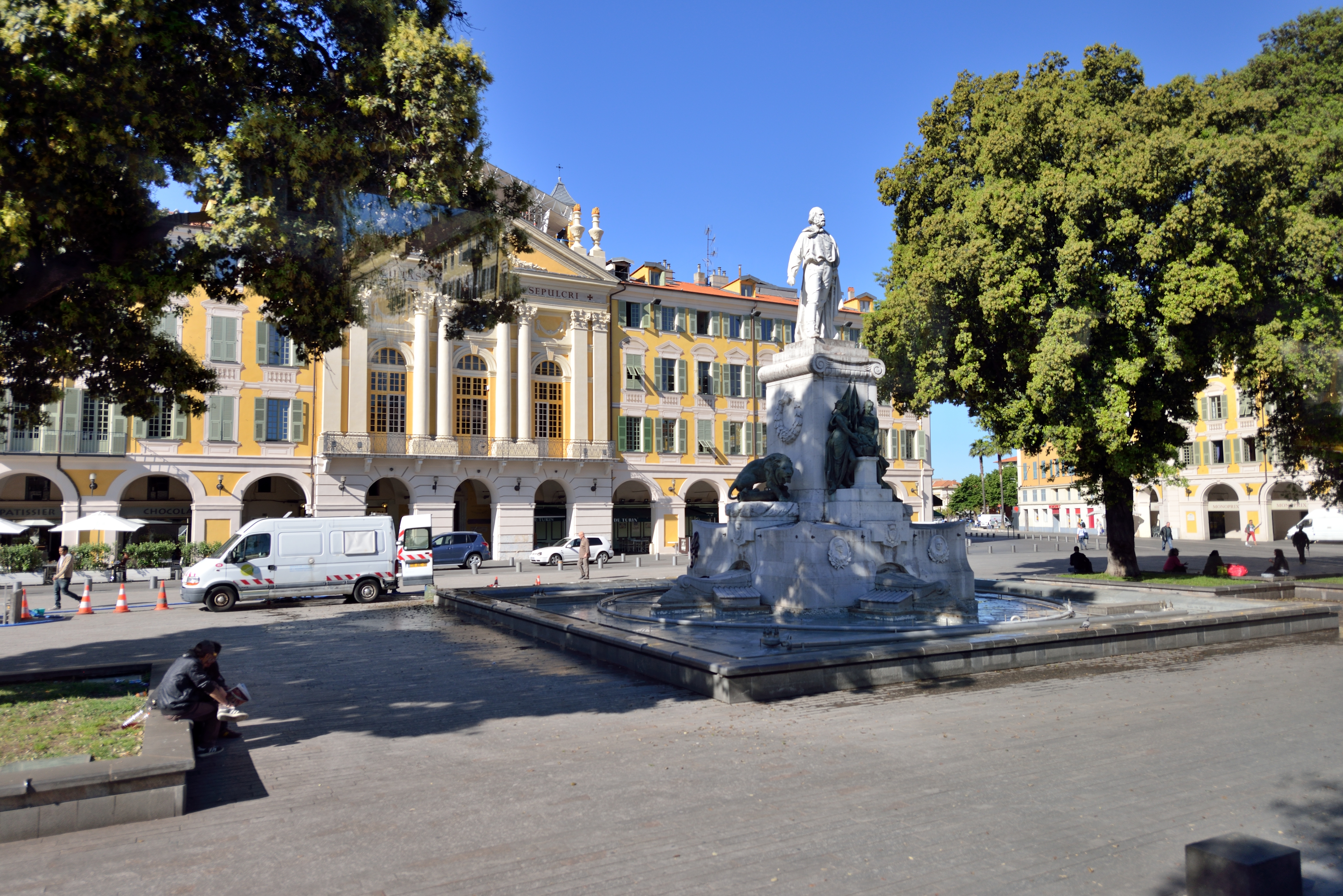 | ガリバルディ広場 [Place Garibaldi] (09:23) ジュゼッペ・ガリバルディ [Giuseppe Garibaldi] の銅像。 後ろの建物は ニースの聖墳墓教会 [Nice Chapelle du Saint-Sépulcre] 。 (車窓からの風景) 「西」MAPLay. A |