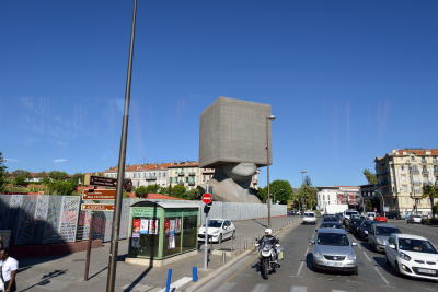| スクエアヘッド (四角い頭) [Tête Carrée] (09:24) 中央に見える頭の四角い建物は、市立図書館に付随した文化行政事務所の建物。 (車窓からの風景) 「西」MAPLay. A |