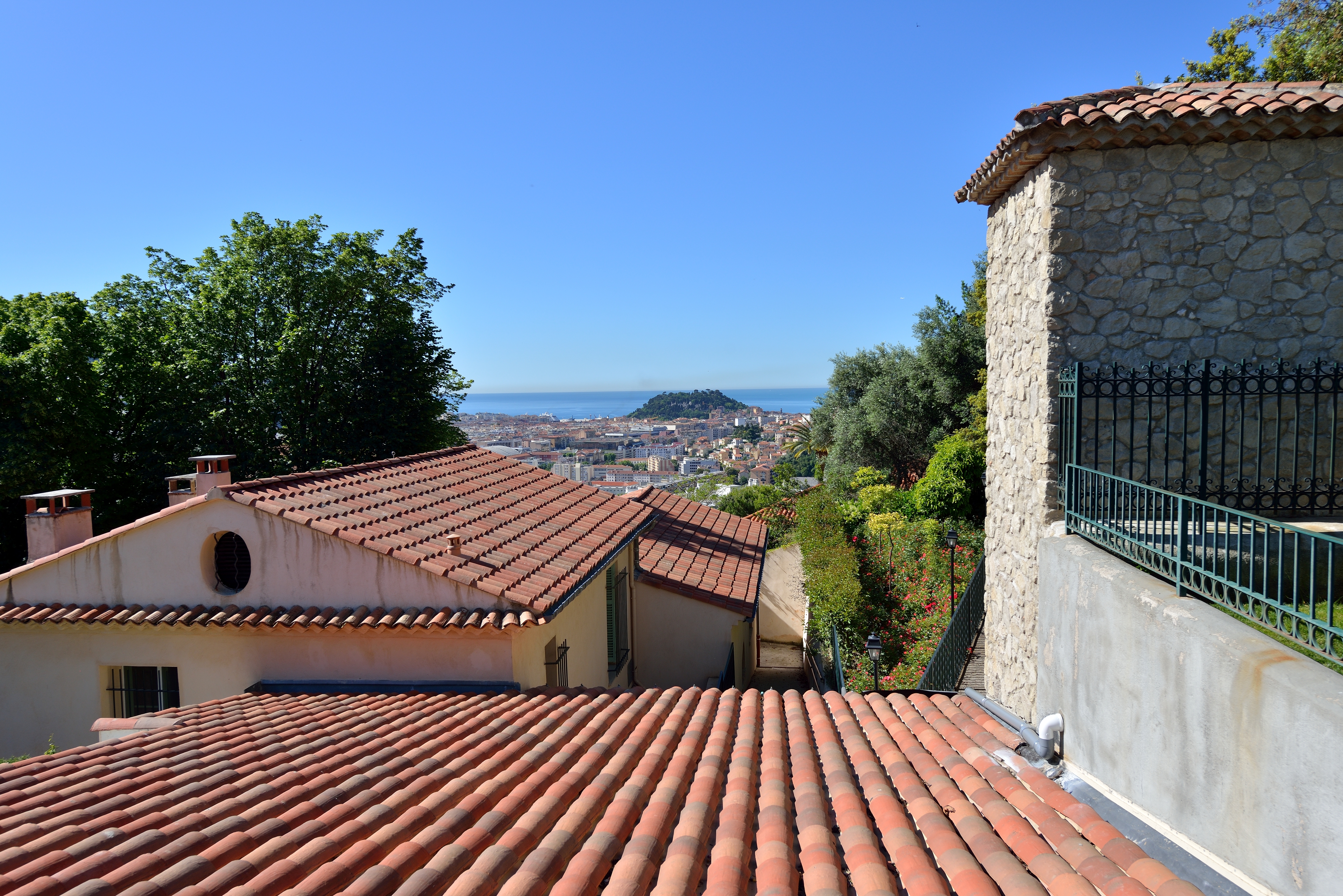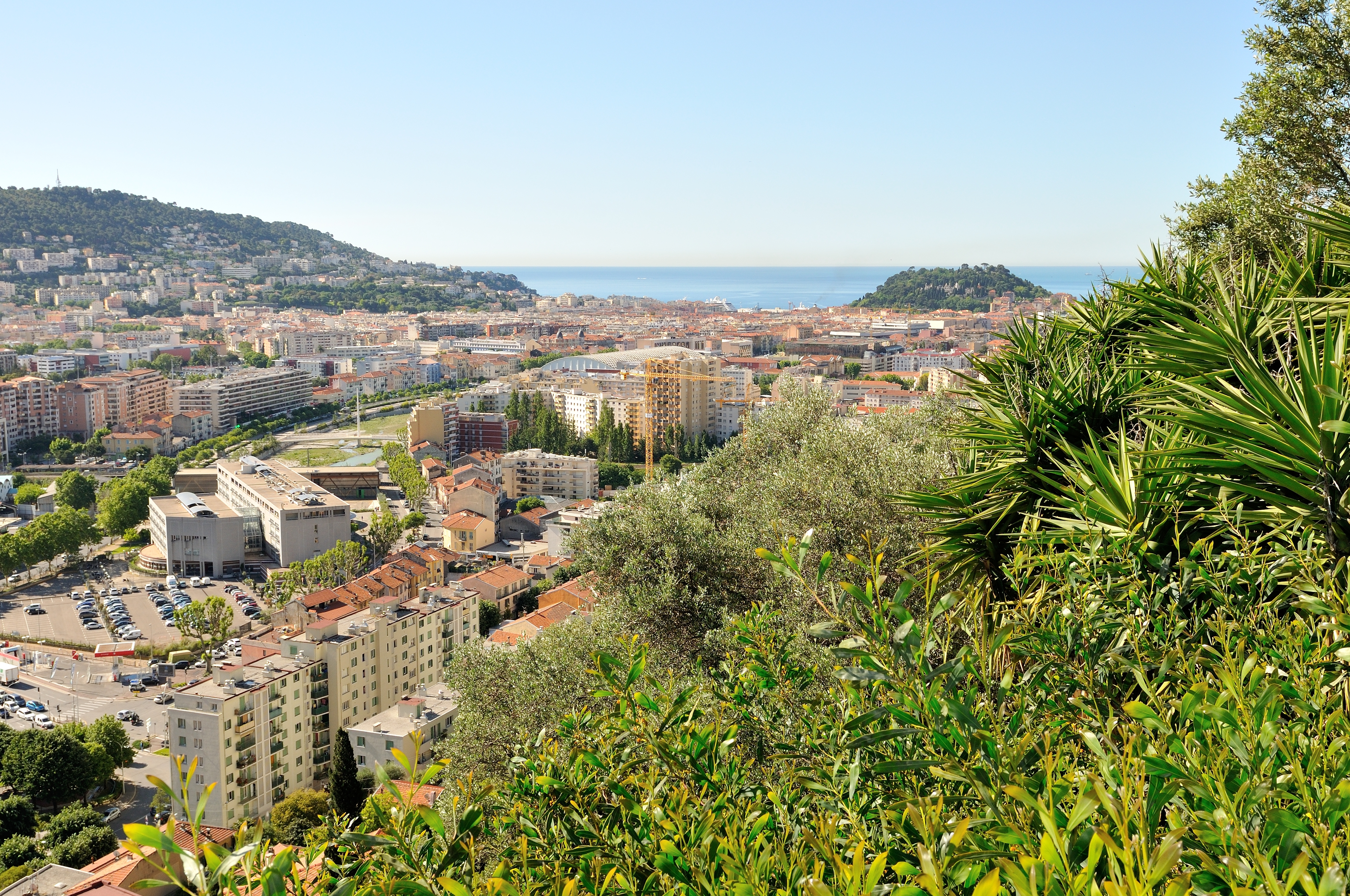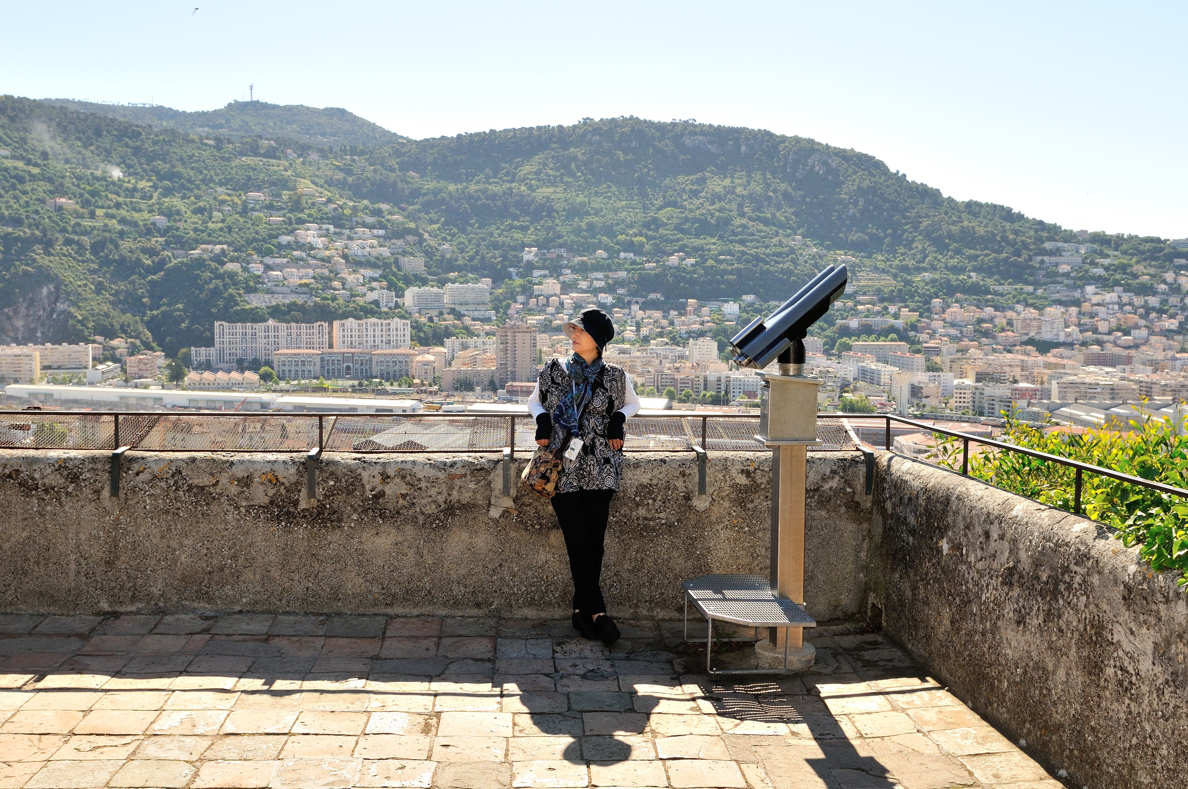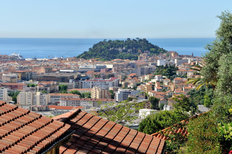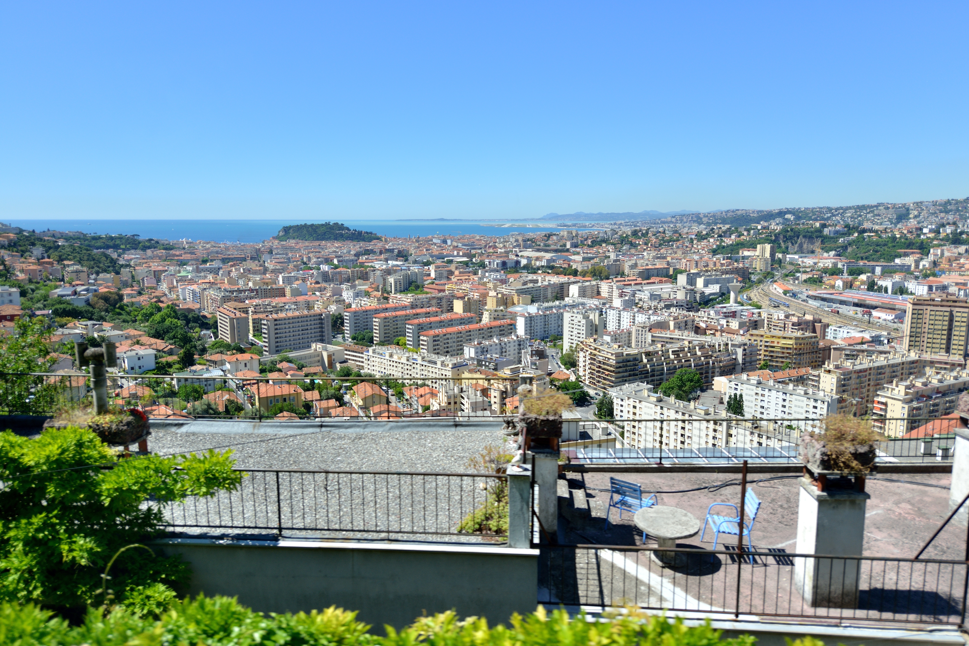 | シミエ・フランシスコ会修道院の庭園からの景色 (09:46) 中央のこんもりした森は、城の丘 [La Colline du Château] 。 「南東」MAPLay. A |