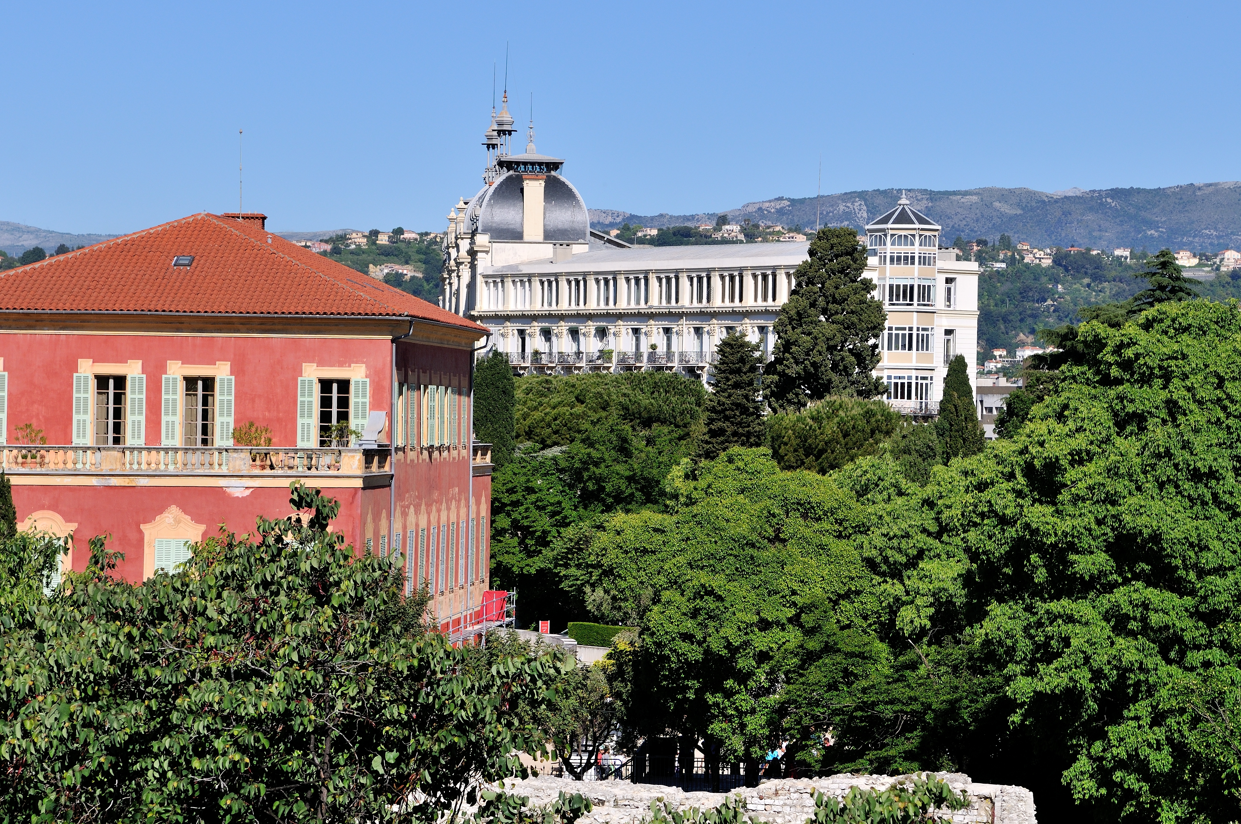| マティス美術館 [Musée Matisse] と レジーナパレスホテル [Palais Regina] (09:50) 左の赤い建物は、マティス美術館。 右の白い建物は、前述のレジーナパレスホテル。 「西北西」MAPLay. B |