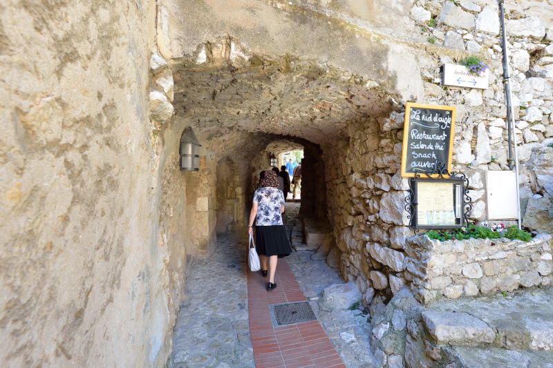 | ペリ通り [Rue de la Paix] からエズ庭園 [Jardin d'Eze] へ向かう (13:49) レストラン "La Taverne d'Antan à Eze" にあるトンネル状の通路をくぐると、庭園に至る。 「西南西」MAPLay. B |