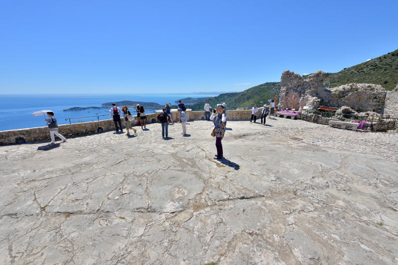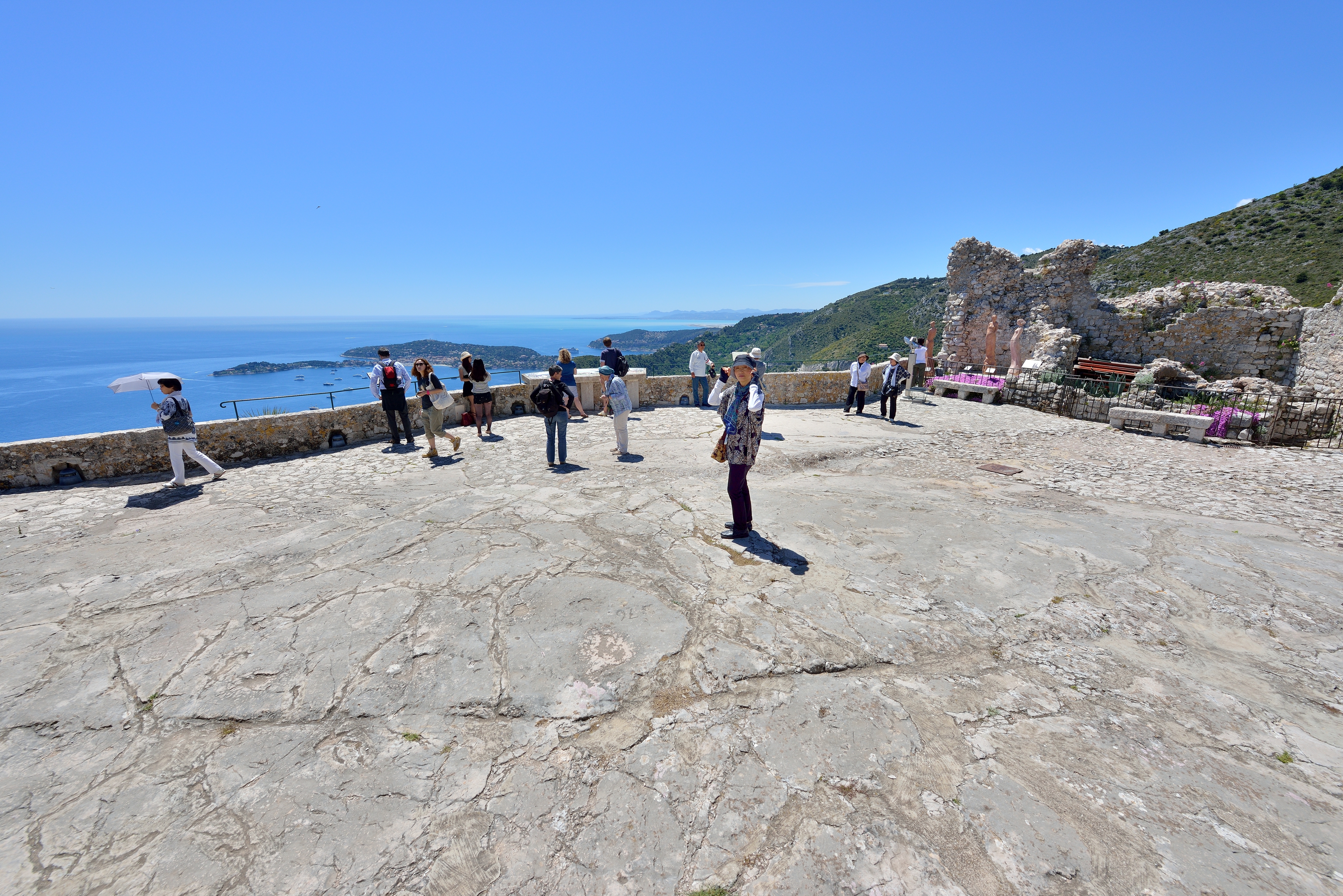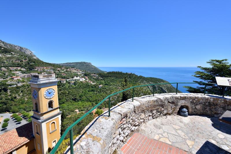 | 頂上にある展望台 [Table panoramique] からの眺望 (13:55) 中央下部にある建物は、昇天の聖母に捧げられたエズの教会 [L'église d'Èze] で、12世紀に建てられた教会の基礎の上に、1764年 ~1778年にイタリアの建築家アントワーヌ・スピネッリによって再建された。 「北東」MAPLay. B |