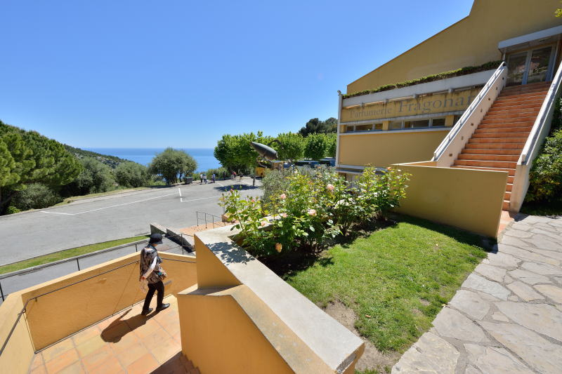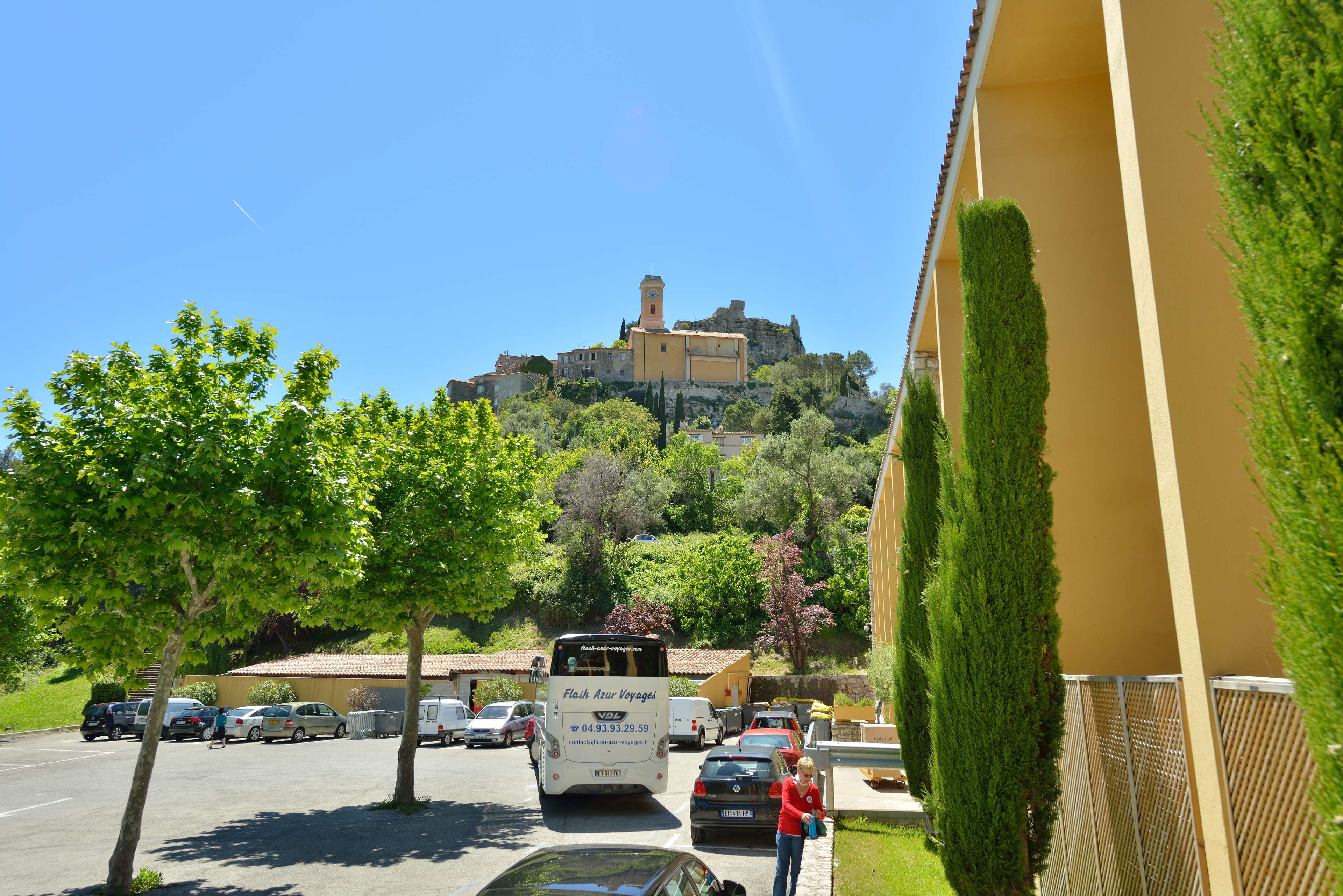 | フラゴナール [Fragonard] 前から見るエズ村 (14:29) 前方の丘がエズ村で、右手の建物は香水専門店 "フラゴナール" 。 フラゴナールは香水のメッカと謳われる南フランスの街グラース [Grasse] で、1926年に誕生した老舗パフューマリー [Parfumerie] (香水専門店) 。 「南西」MAPLay. C |