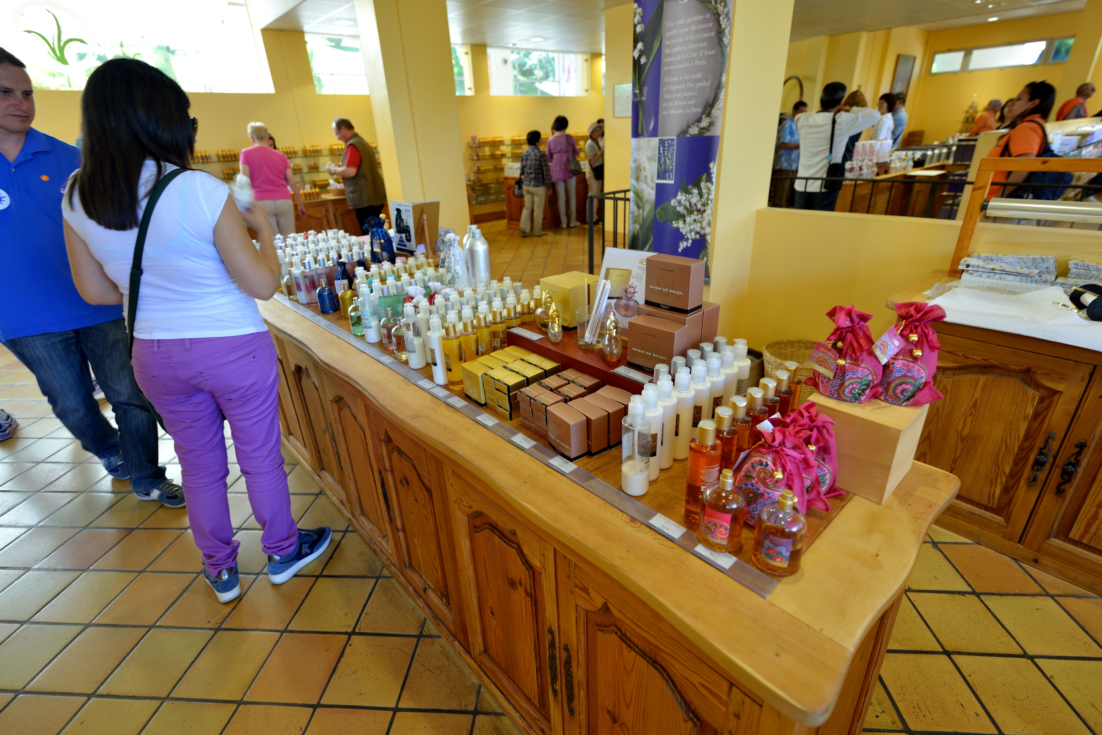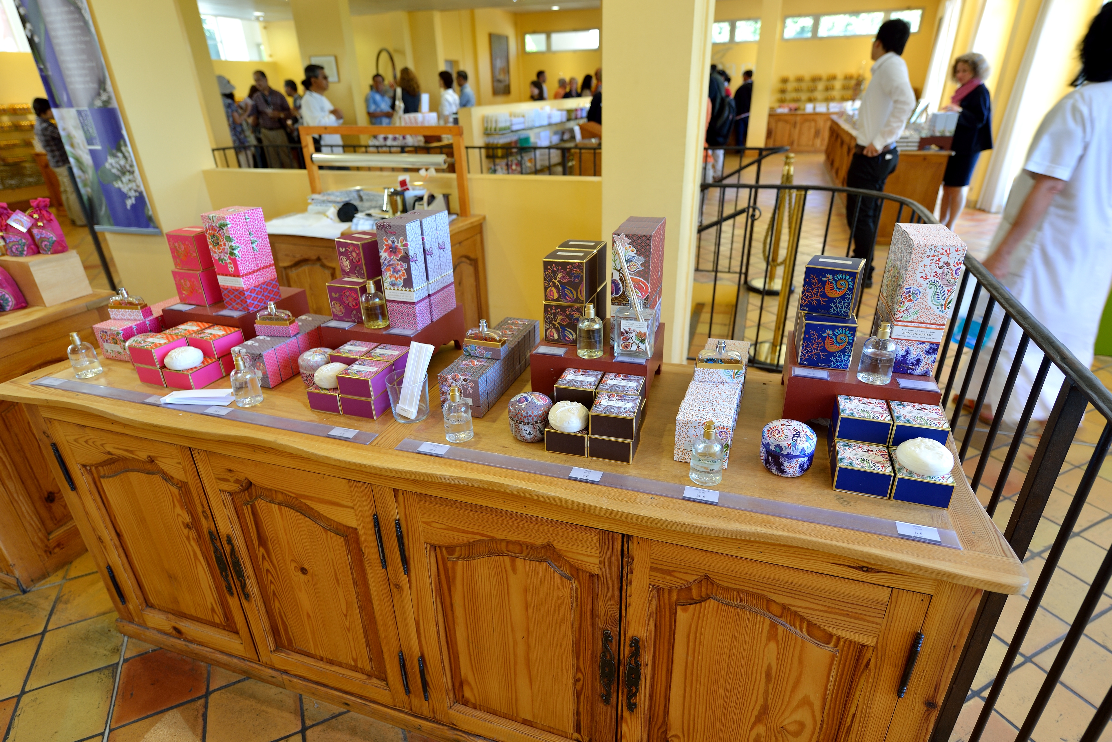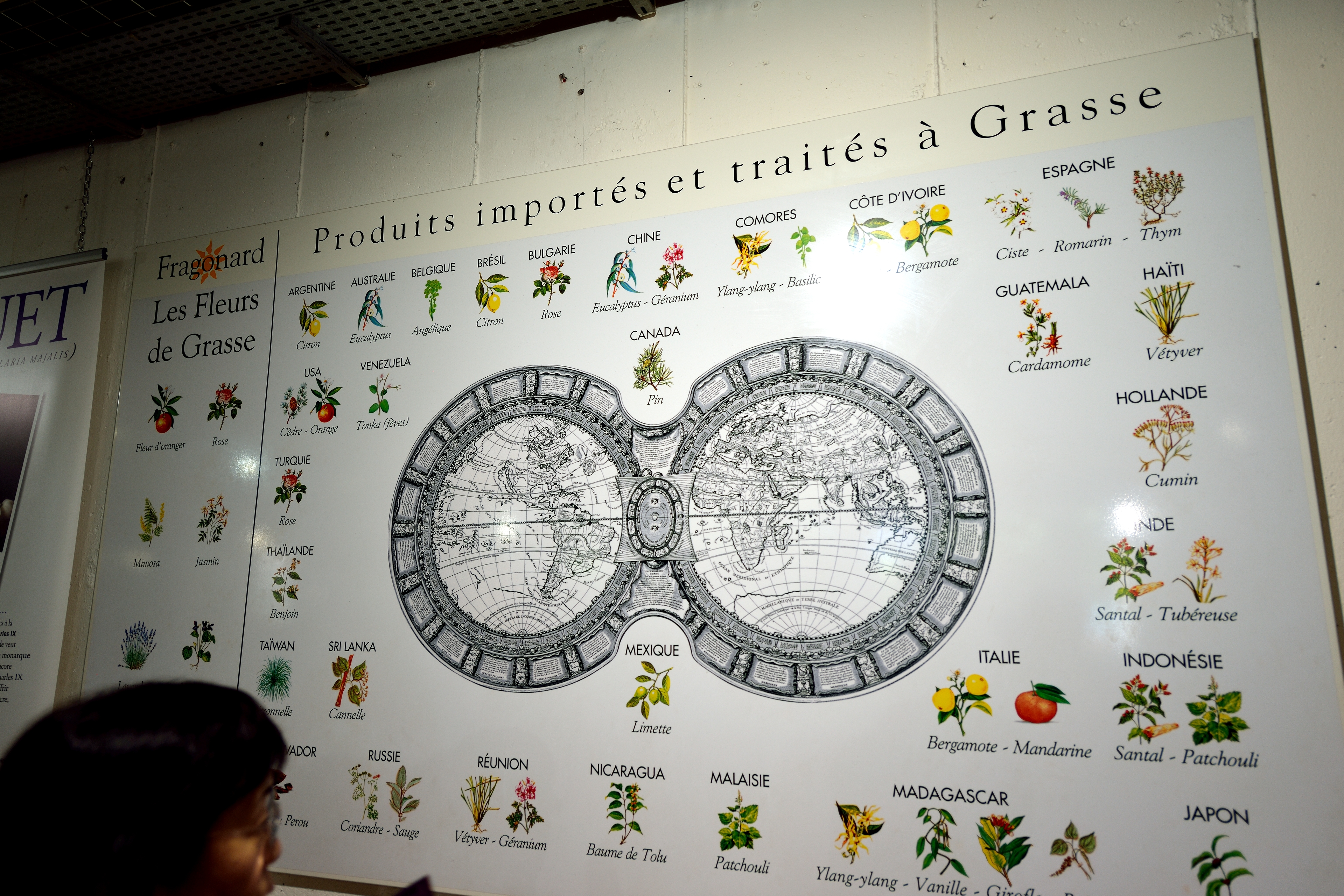 フラゴナール [Fragonard] の内部 (14:33) パネルには、世界中から輸入されているエッセンスを採るための植物が描かれている。 右下に "JAPON" と書かれているのは、日本から輸入されるキンモクセイで、日本でエッセンスにした状態で輸入されている。 MAPLay. C |