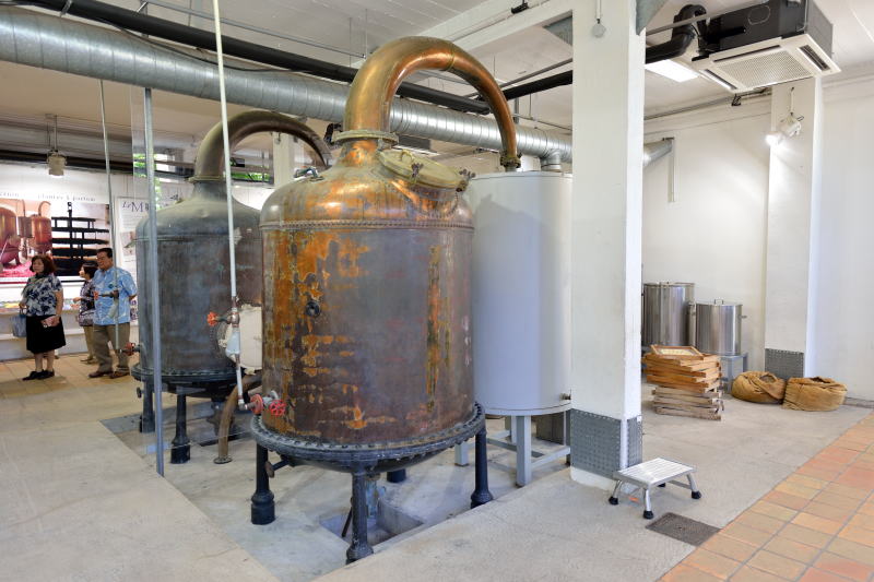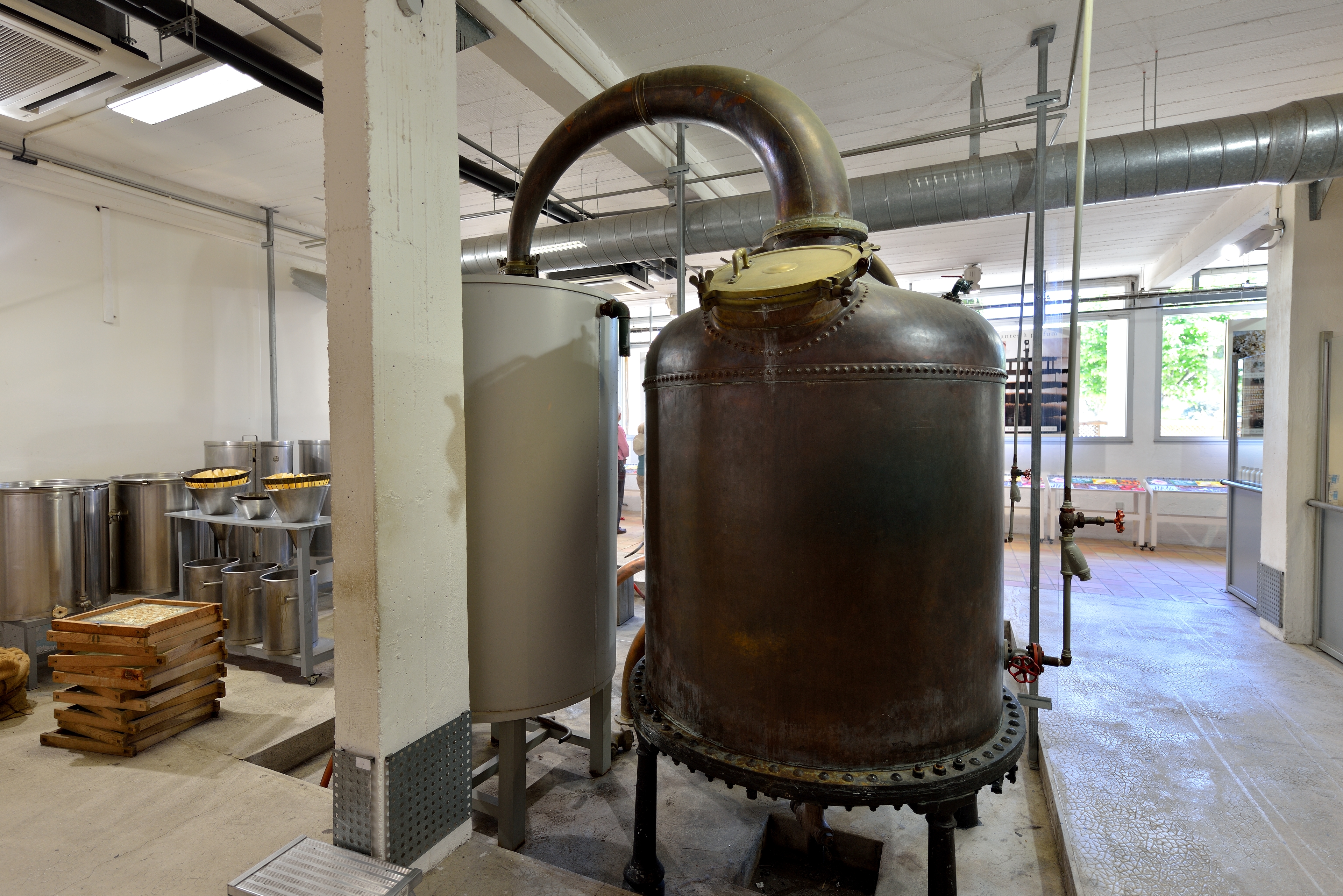 | 蒸留器 (アランビック) [Alembic] (14:35) 右の茶色の圧力タンクに、花片と水を半々に入れ、下から120℃に加熱すると、香料を含んだ液体が気化して左のタンクへ移動する。 移動した蒸気は冷却されて液体になり、比重の違いにより油の層と水溶液の層に分離して溜まる。 油の層はエッセンス*として使用され、水溶液の層は化粧水やオーデコロンなどの製造に用いる。 MAPLay. C * 植物から抽出した香気の高い精油。 |