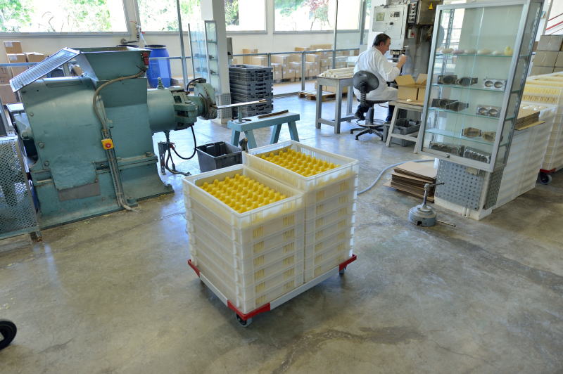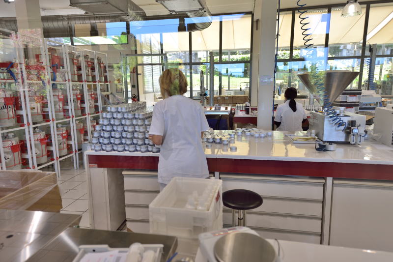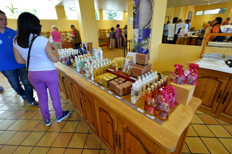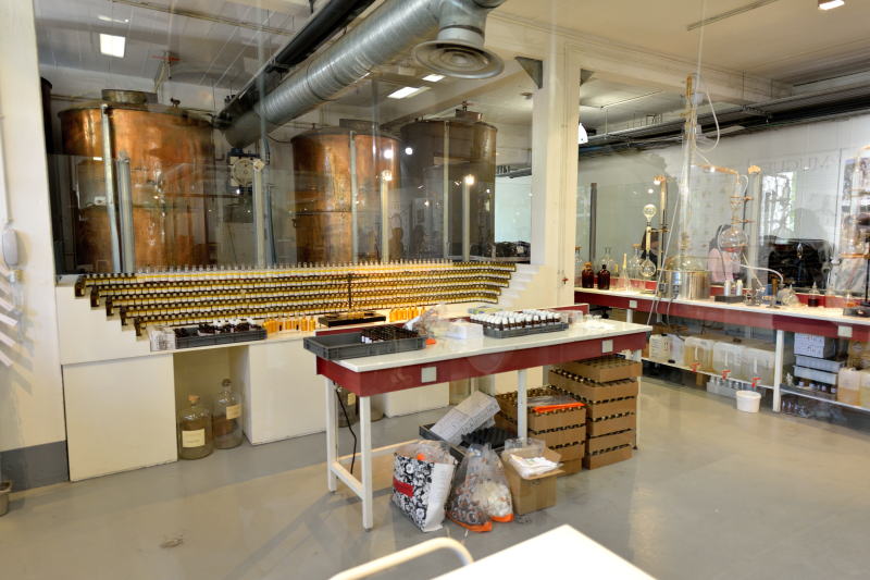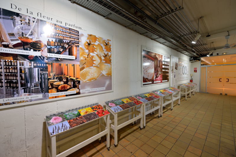 | 調香室 [Chambre Parfumeur] (14:35) 正面に階段状に並んでいる小瓶は、各種のエッセンスが入った小瓶で、この部屋でエッセンスを調合して香水をつくっていく。 因みに、調香師のことを "ネエ" [Nez] と呼び "Nez" はフランス語で鼻を意味する。 調香師になるためには最低7年間、専門学校で植物学や化学を勉強し、その後、見習いを経て実際に仕事に就くのは10年後になる。 調香師は、最低2000種類以上の嗅ぎ分け能力が要求され、調香師である間は、酒、たばこ、強い香辛料が入った食事などは禁止されている。 MAPLay. C |