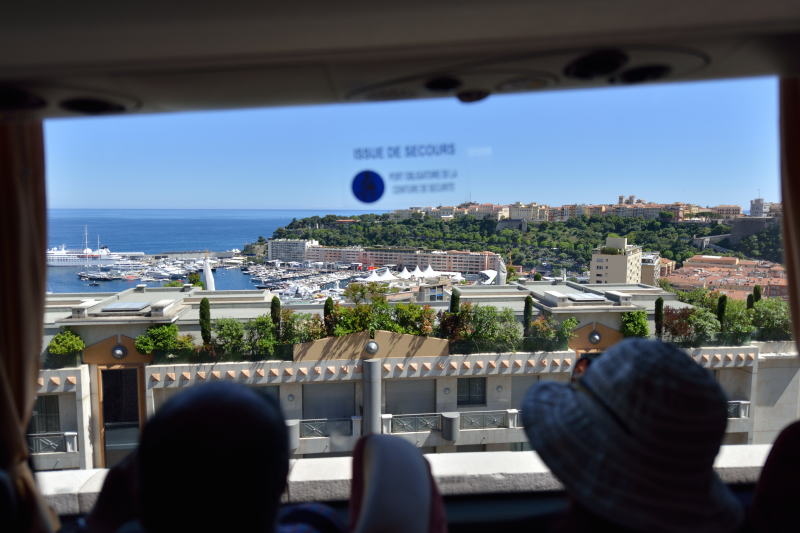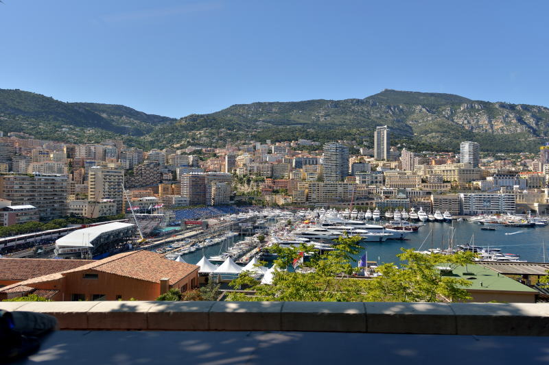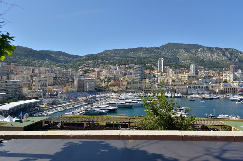 | ロンパール通り [Rue des Remparts] からの眺め (16:00) 前方に広がる街は、ラコンダミーヌ [La Condamina] の街と、ポール・エルキュル (エルキュール港) [Port Hercule]* 。 この地区は、モナコ・グランプリのスタート地点とゴー地点があることでも有名。 折しも、この日はF1 第6戦モナコGP 予選 (2013年5月23日~26日) の初日、コース脇には観覧席が設けられ、街にはエンジン音が鳴り響いていた。 「北北東」MAPLay. C * モンテカルロ港 [Port Monte Carlo] はエルキュール港内に突き出た埠頭部にある。 |