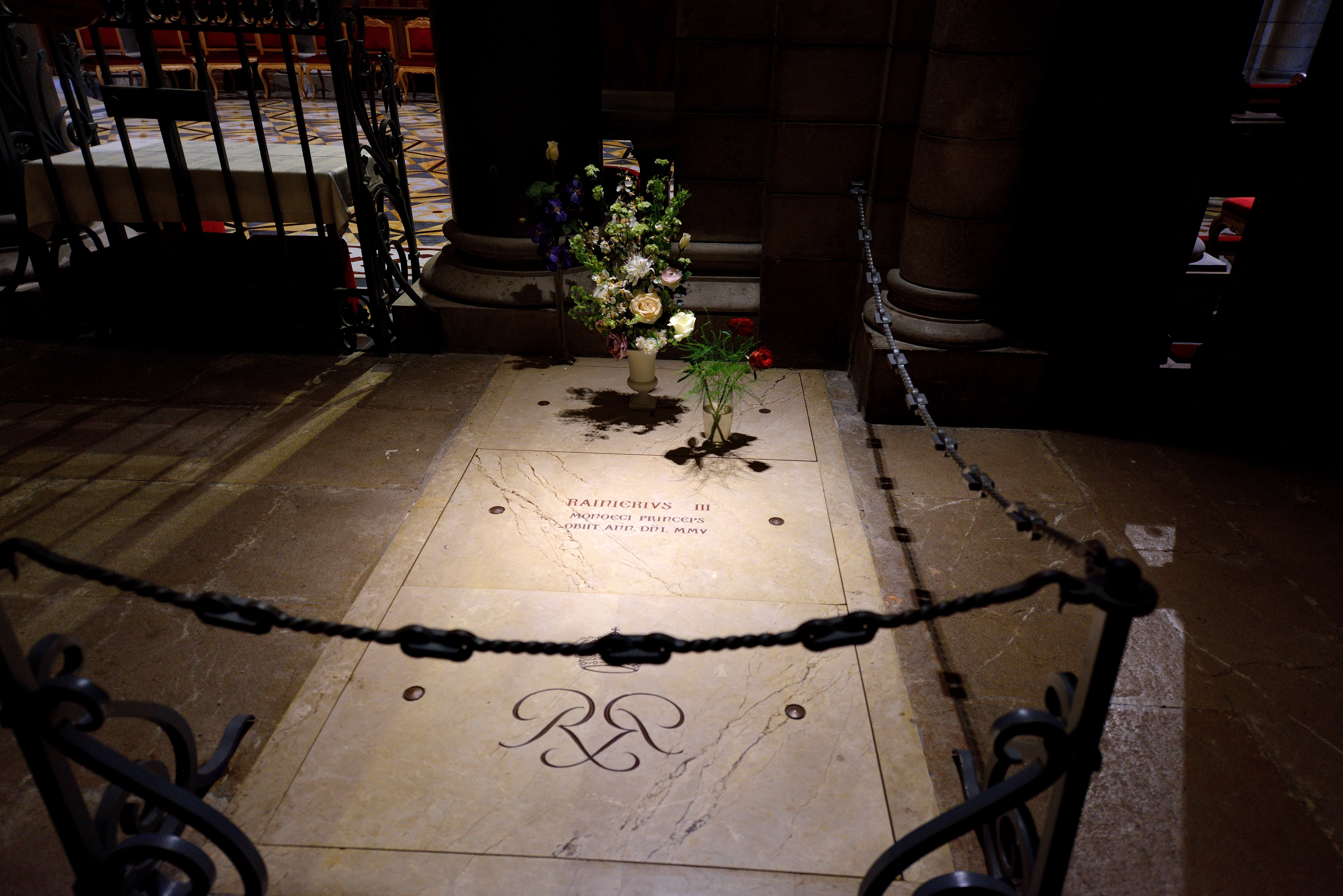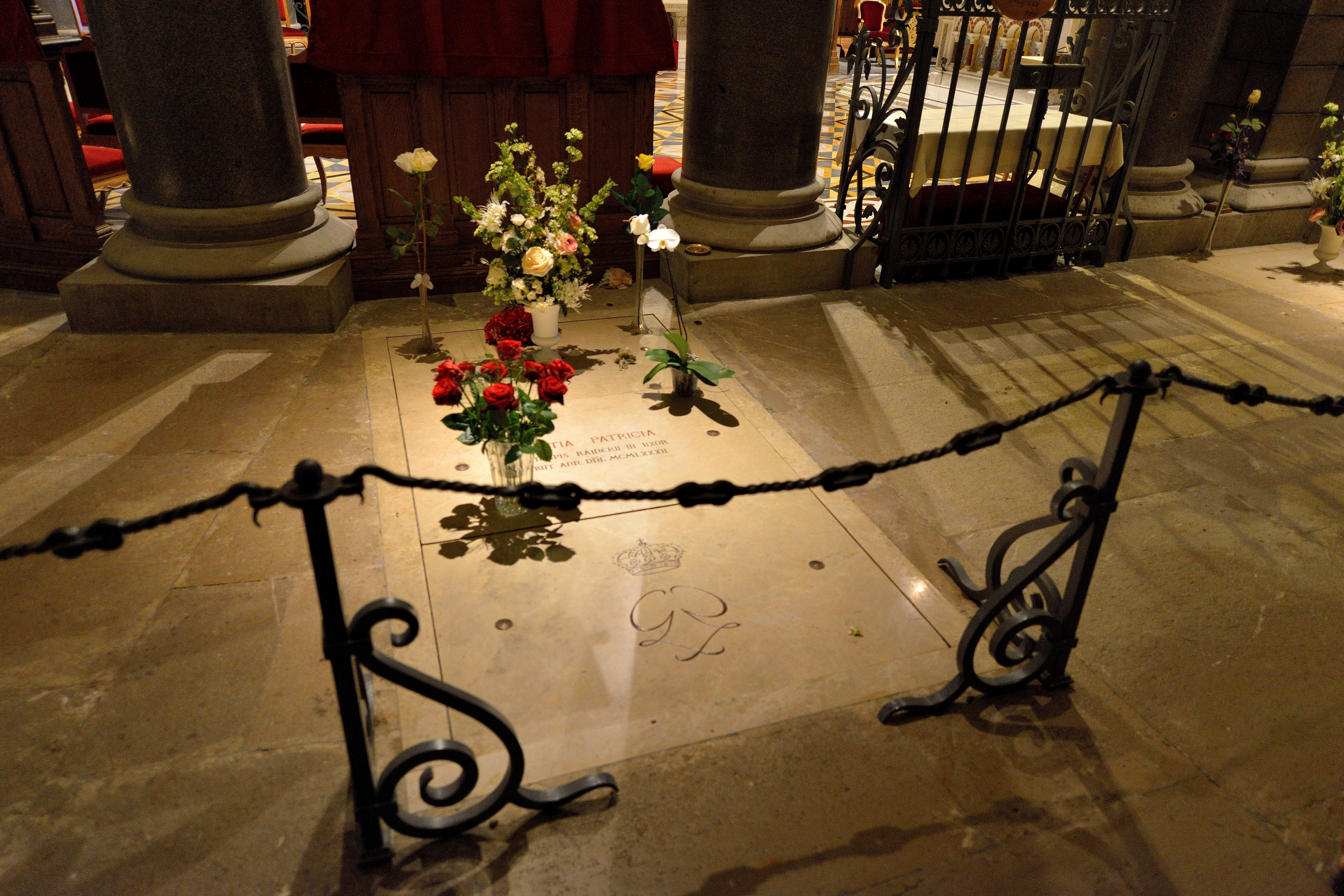 | モナコ大聖堂 [Cathédrale de Monaco] (16:13) 聖堂奥の床には、大理石で出来た歴代のモナコ大公とその一族の霊廟が並んでいて、その最後の二つが、レーニエ公とグレース・ケリーの霊廟。 グレース・ケリー [Grace Kelly] の墓石には、ラテン語で "グラシア・パトリシア" [GRATIA PATRICIA] と刻まれ、没年は "MCMLXXXII" と刻まれている。 "MCMLXXXII" は1982年を意味する。 (参照:ローマ数字(1から3999まで)の一覧) MAPLay. C |