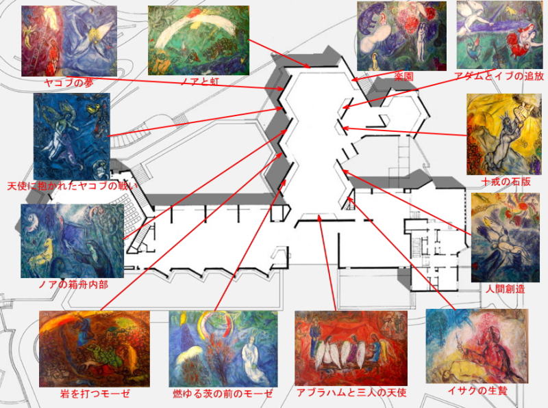 | 国立マルク・シャガール美術館 [Musée National Marc Chagall] (11:00) 左端の絵は、『楽園を追われたアダムとイブ』 (1961年)。 MAPLay. B |