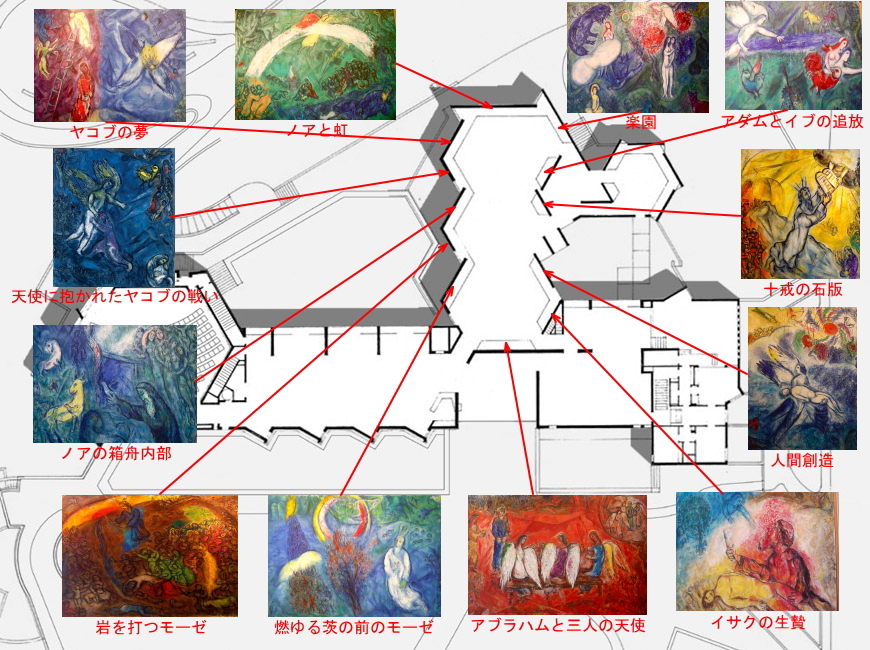 | 国立マルク・シャガール美術館 [Musée National Marc Chagall] (10:58) 右端の絵は、『十戒の石板を授かるモーゼ』 (1960年~1966年)。 右から2番目の絵は、『楽園』 (1961年)。 MAPLay. B |